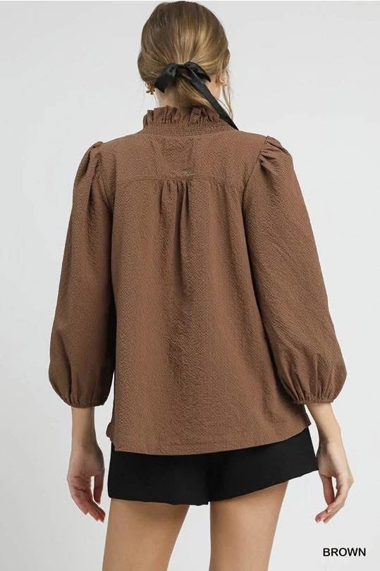 The earthy brown shade gives this blouse a grounded, natural beauty that works across seasons. It’s warm enough to feel cozy in the fall but light and fresh enough to pair with bright accessories in spring. The neutral tone makes it a true wardrobe chameleon, pairing beautifully with denim, trousers, skirts, or even layering under blazers and cardigans.