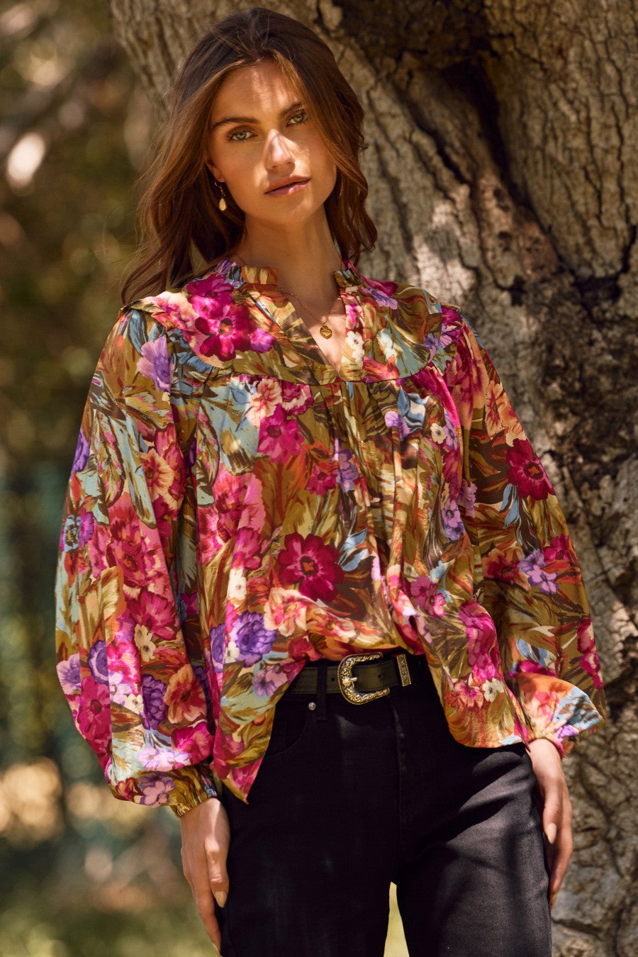 The color palette â a mix of rich fuchsia, coral, lilac, olive, and hints of gold â gives this top its wow factor. Itâs bright without being loud, eye-catching but still elegant. The floral pattern dances across the fabric like a watercolor painting, making it feel both vibrant and timeless. And because the fit is relaxed and forgiving, itâs as comfortable as it is beautiful (yes, please đ).