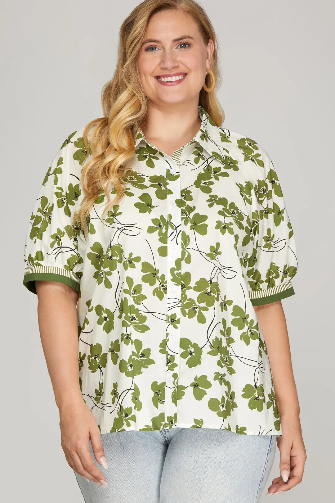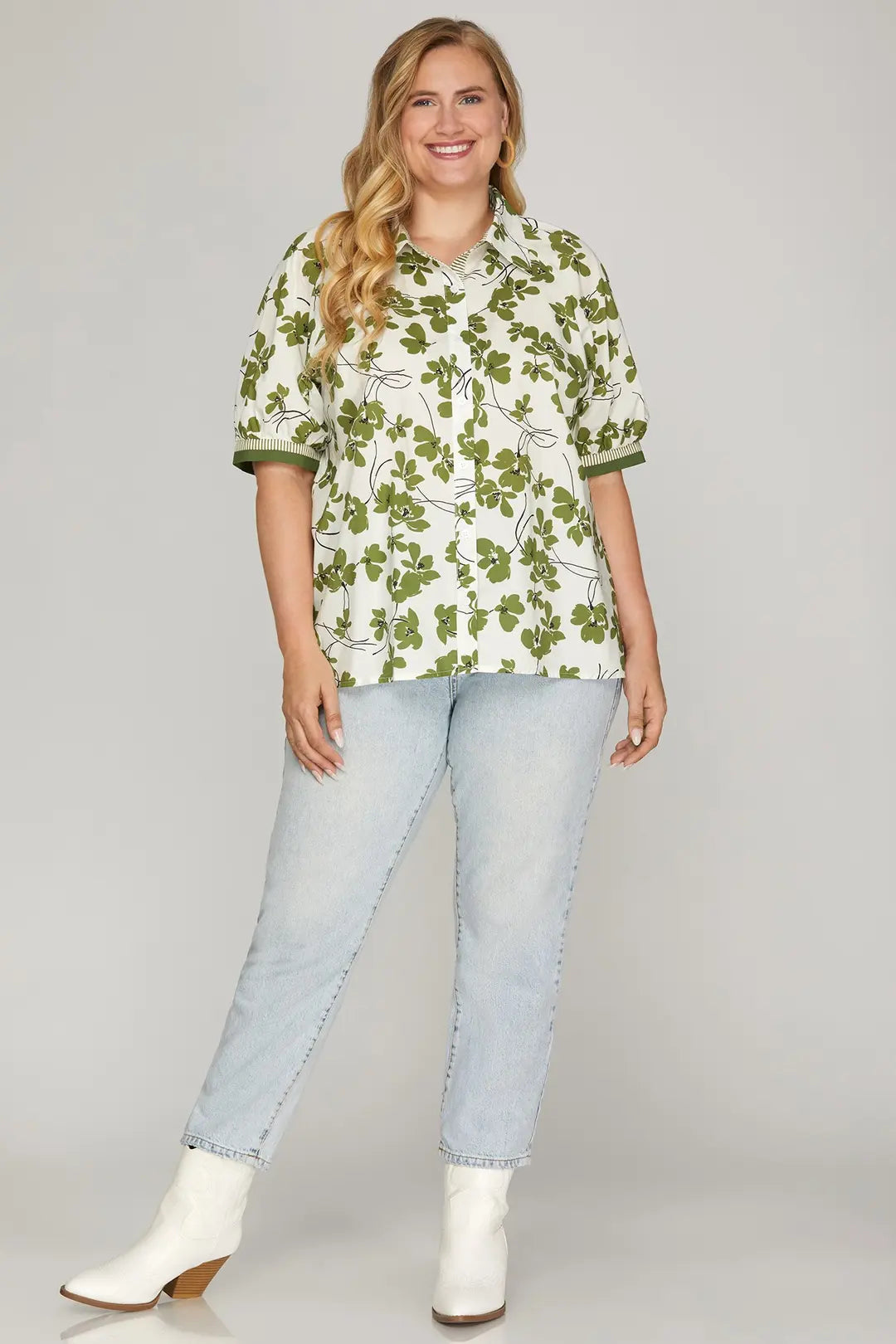 The PLUS Sweet Clover Button Down Top brings an easy, fresh feel 🌿 to your everyday wardrobe with its crisp white base 🤍 and soft green floral print 💚. It’s one of those pieces that feels instantly put-together while still staying relaxed and wearable, making it perfect for casual days ☀️, brunch dates 🥂, or running errands 🛍️.