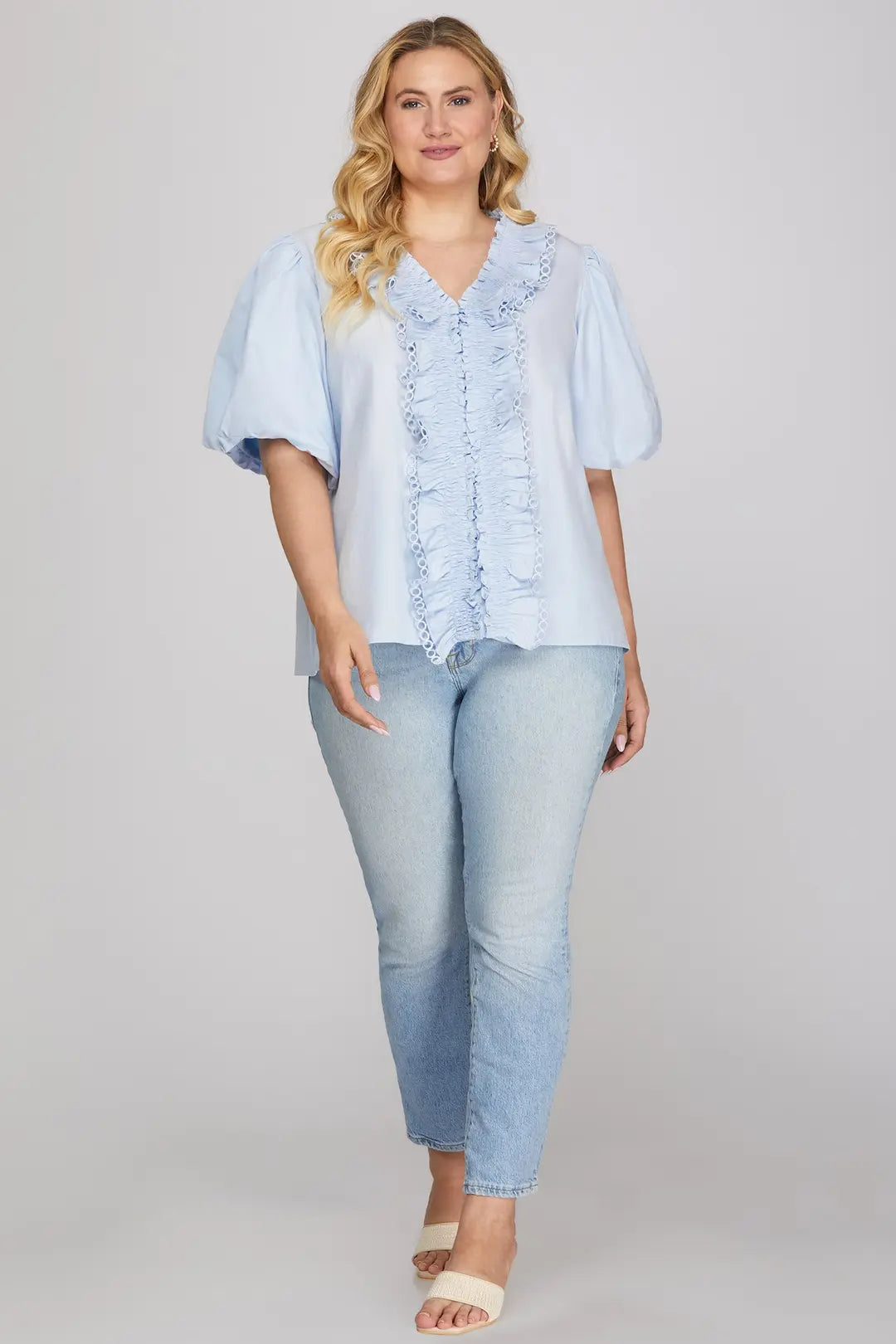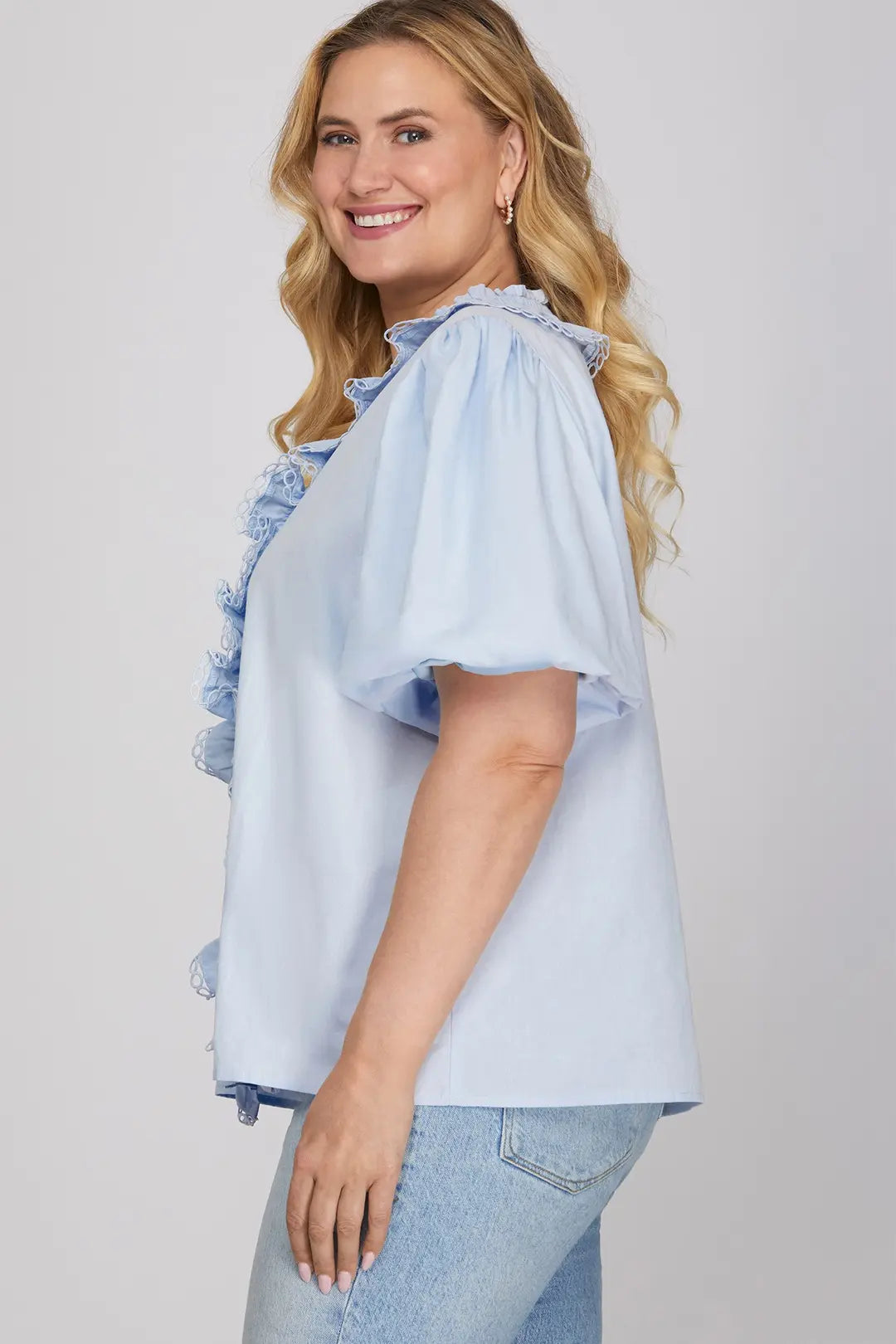 Meet the PLUS Tea By the Coast Ruffle Lace Trim Top — a soft, feminine blouse that brings effortless charm to your everyday wardrobe. With its delicate ruffle detailing and airy light blue hue, this top feels perfectly suited for sunny days, brunch outings, and coastal-inspired looks.