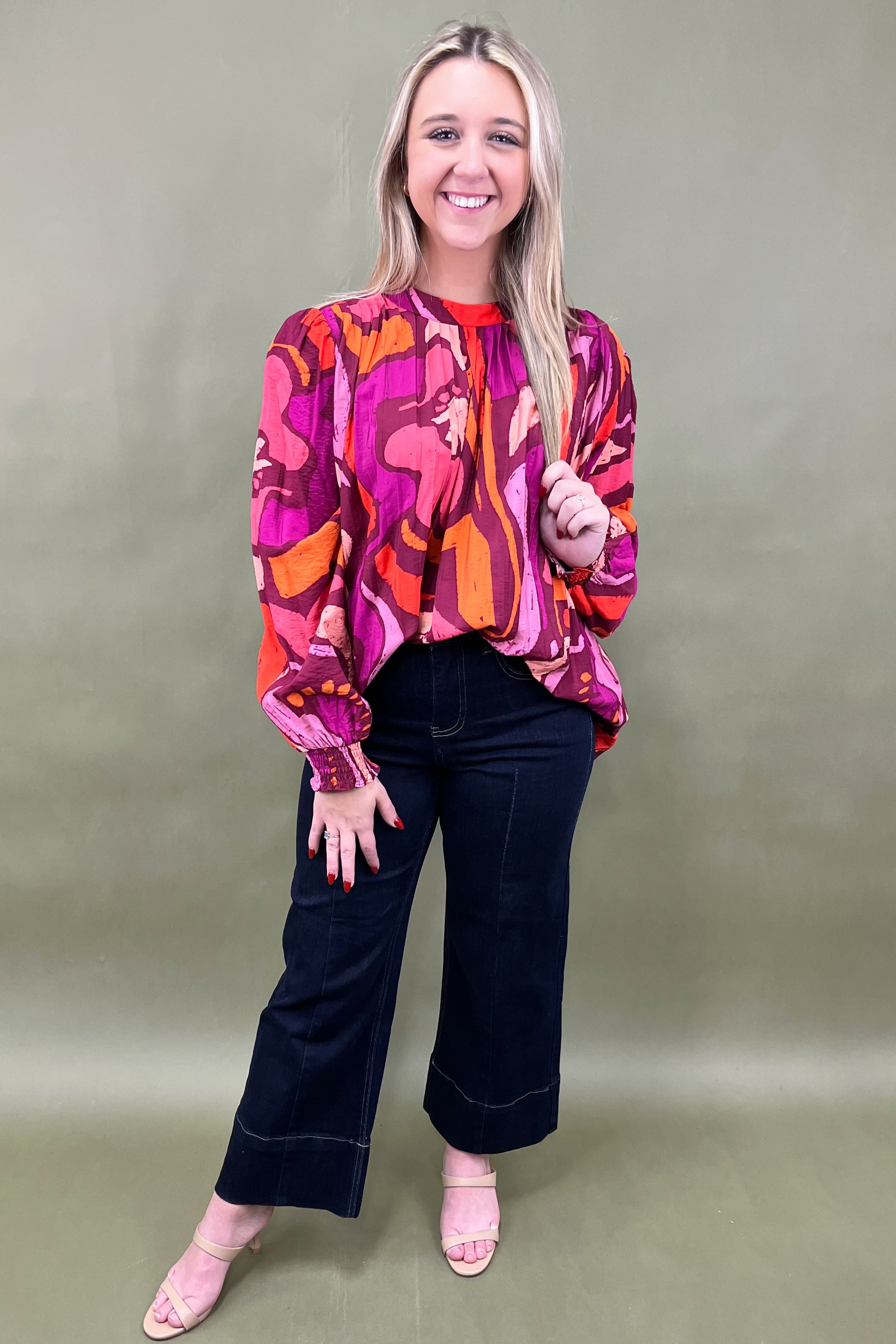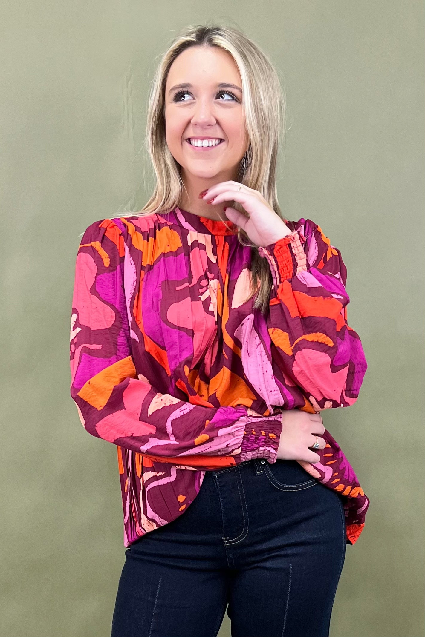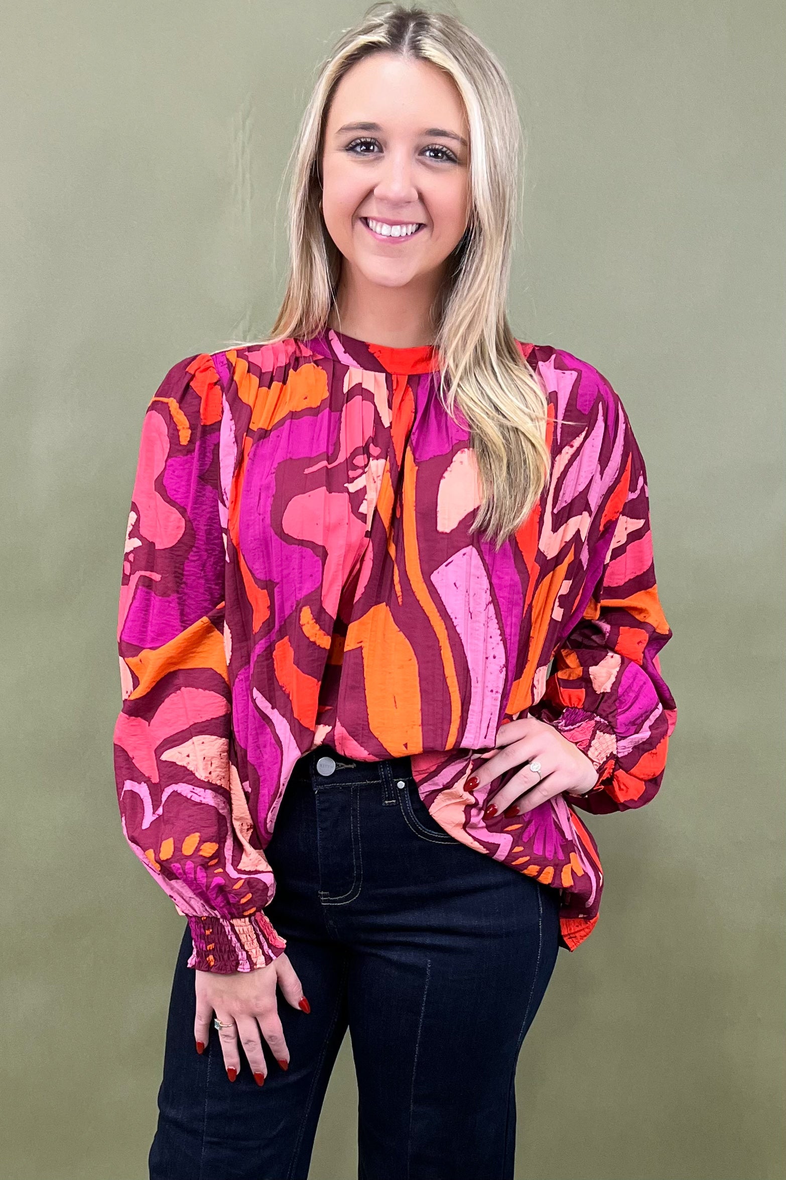 Meet the Autumn Bloom Top—the statement blouse that feels like walking through a gallery of fall colors. 🍁 With its vibrant mix of magenta, burnt orange, and deep plum abstract florals, this piece isn’t just clothing—it’s wearable art. The pleated texture gives it a unique dimension, while the flowy silhouette makes it effortlessly chic.