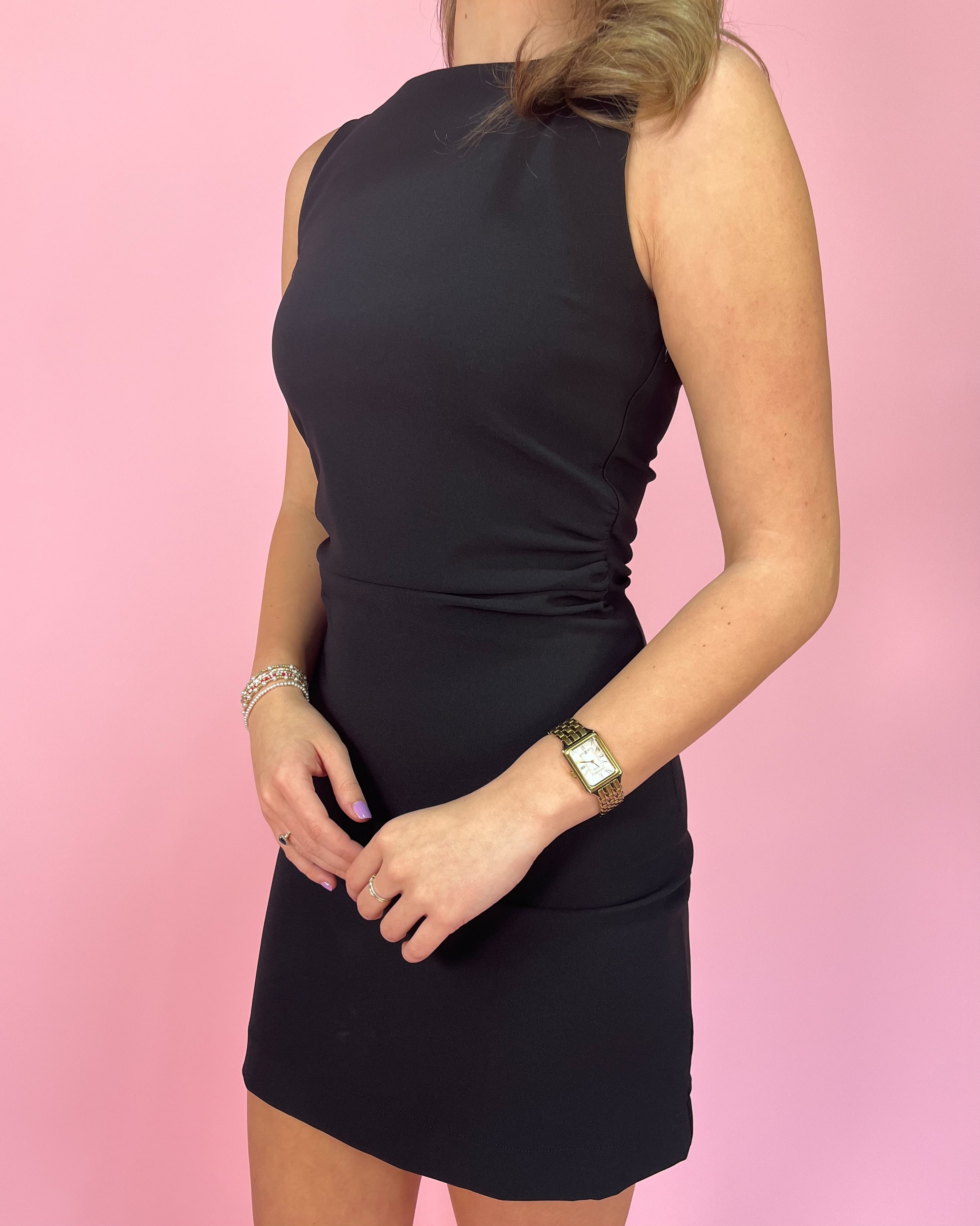 Soft stretch fabric hugs in all the right places while subtle side ruching enhances the waist and creates a smooth, contoured look. Whether styled up or down, this is one of those closet staples you’ll reach for again and again.