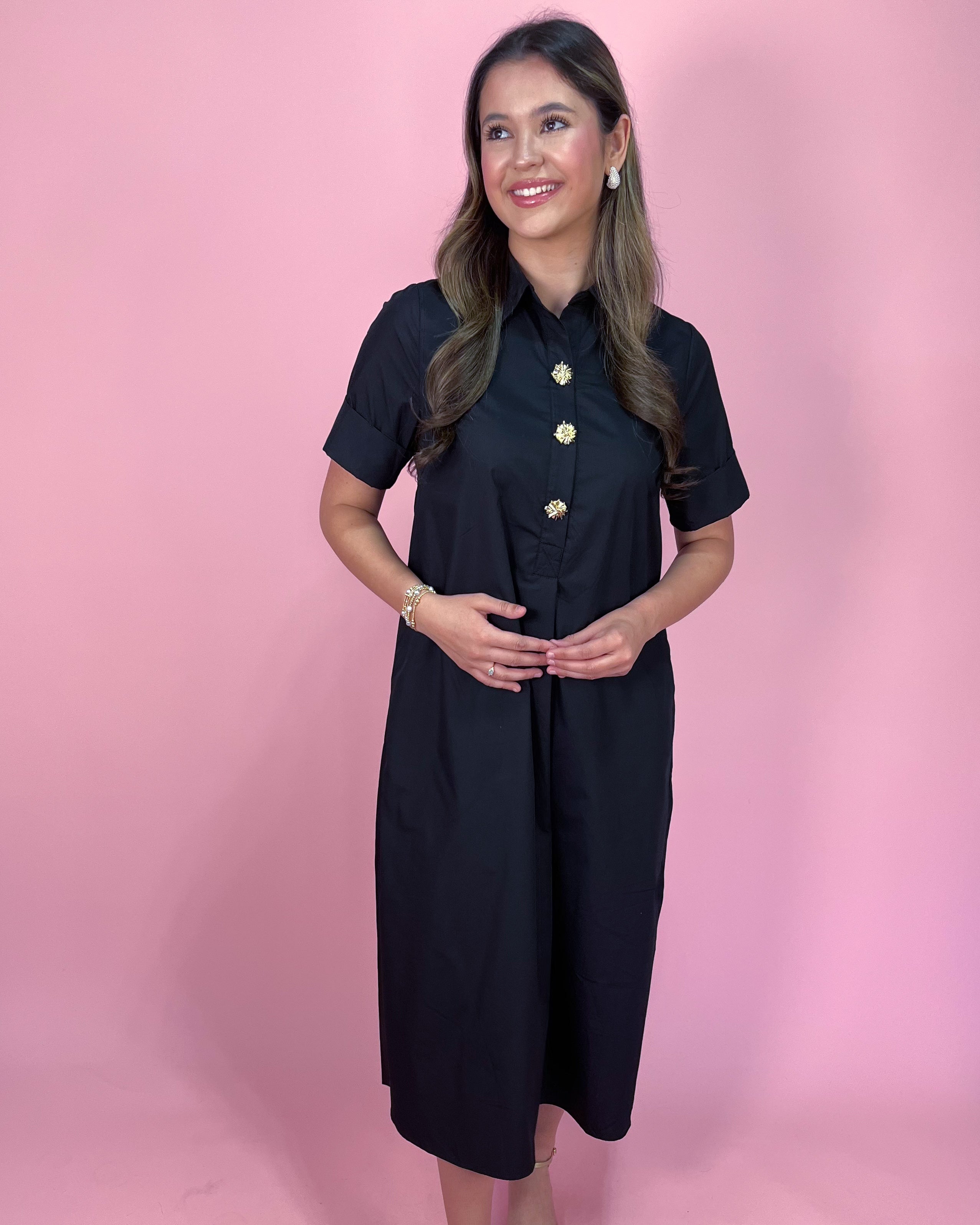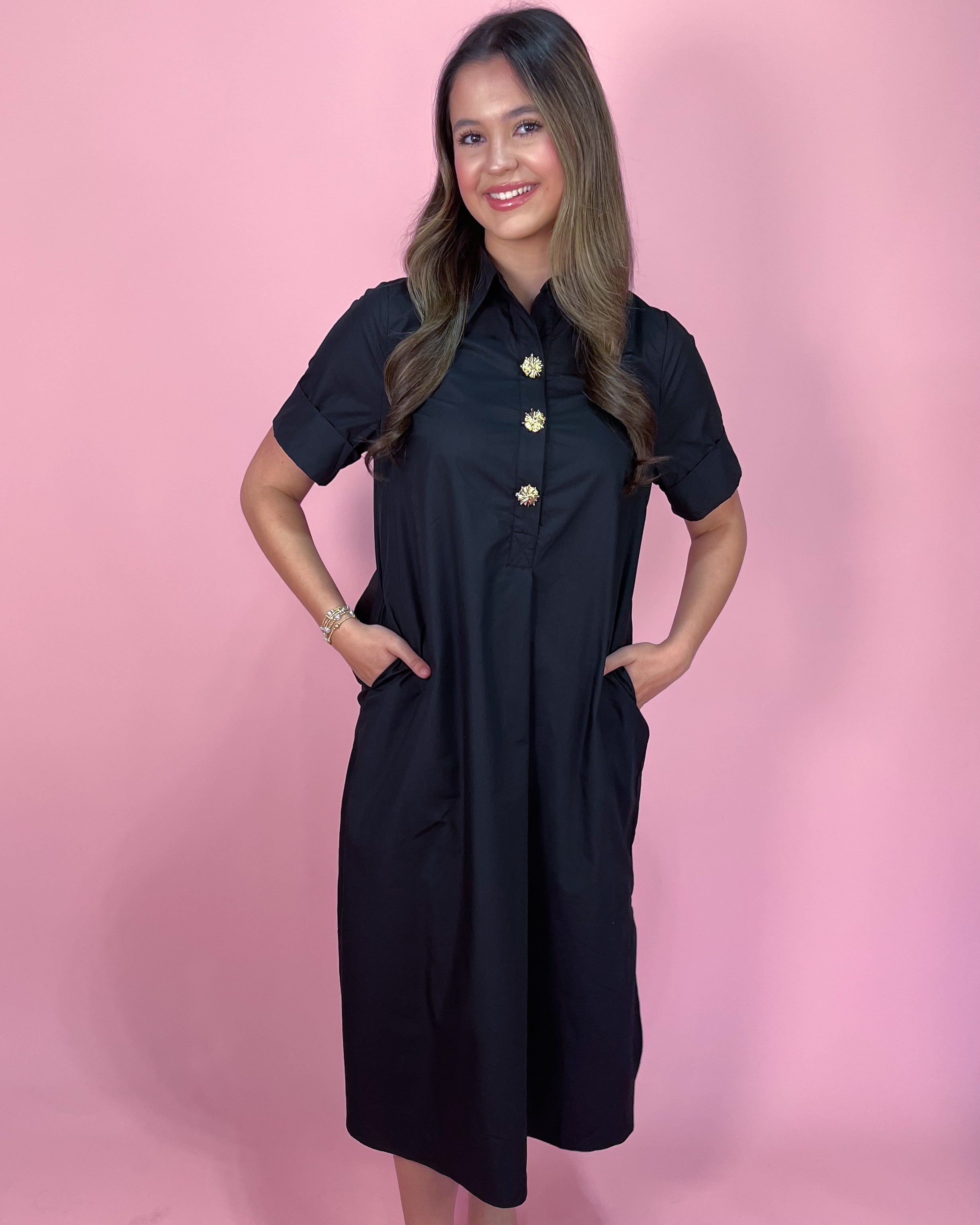 Featuring a structured collar and partial button-front detail with eye-catching statement buttons, this dress blends tailored style with an easy, flowy silhouette. The relaxed fit drapes beautifully, while the side slits add movement and subtle edge. And yes — it has pockets (because we know that matters).