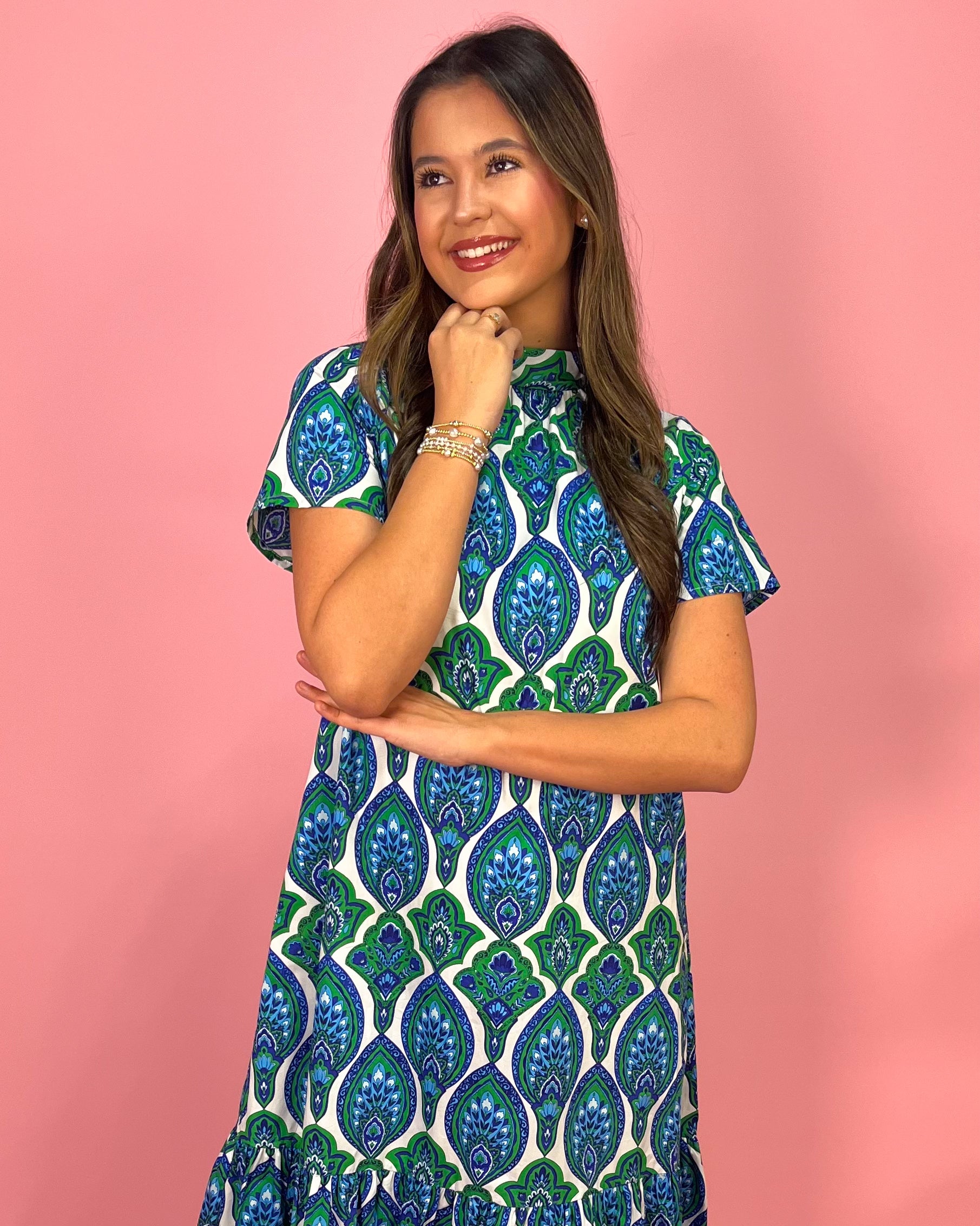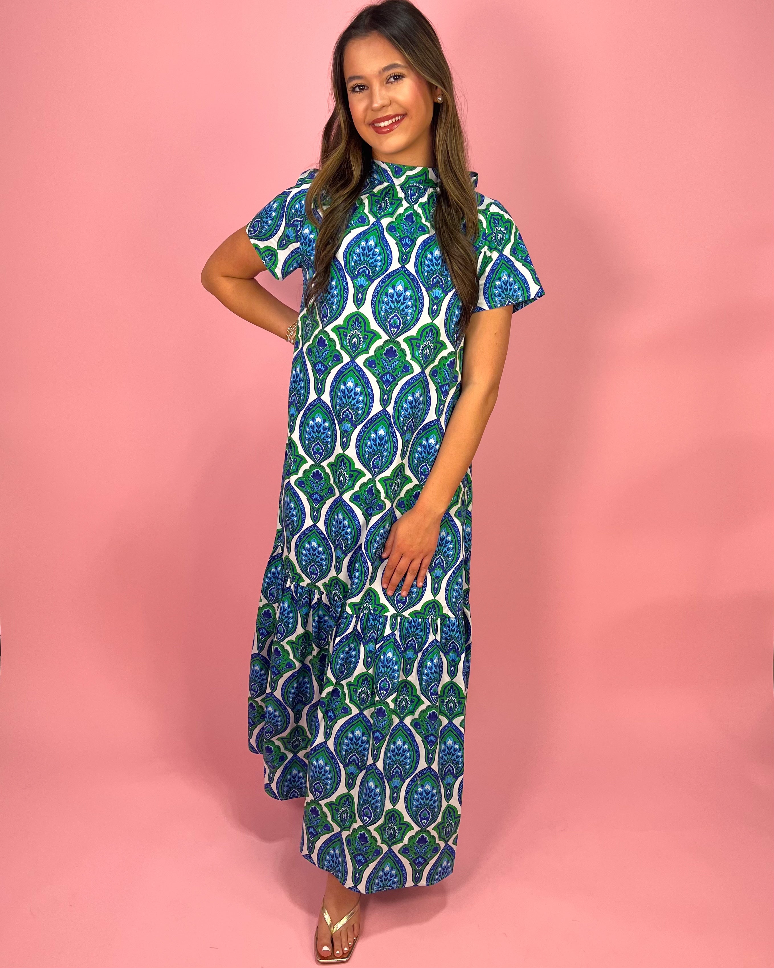 Bold pattern meets timeless elegance in the Peacock Palace Abstract Tie-Neck Maxi Dress. This eye-catching piece features an intricate peacock-inspired print in rich shades of blue and green set against a crisp white background. The striking pattern gives the dress a sophisticated yet playful feel, making it a standout choice for both daytime events and elevated evenings out.