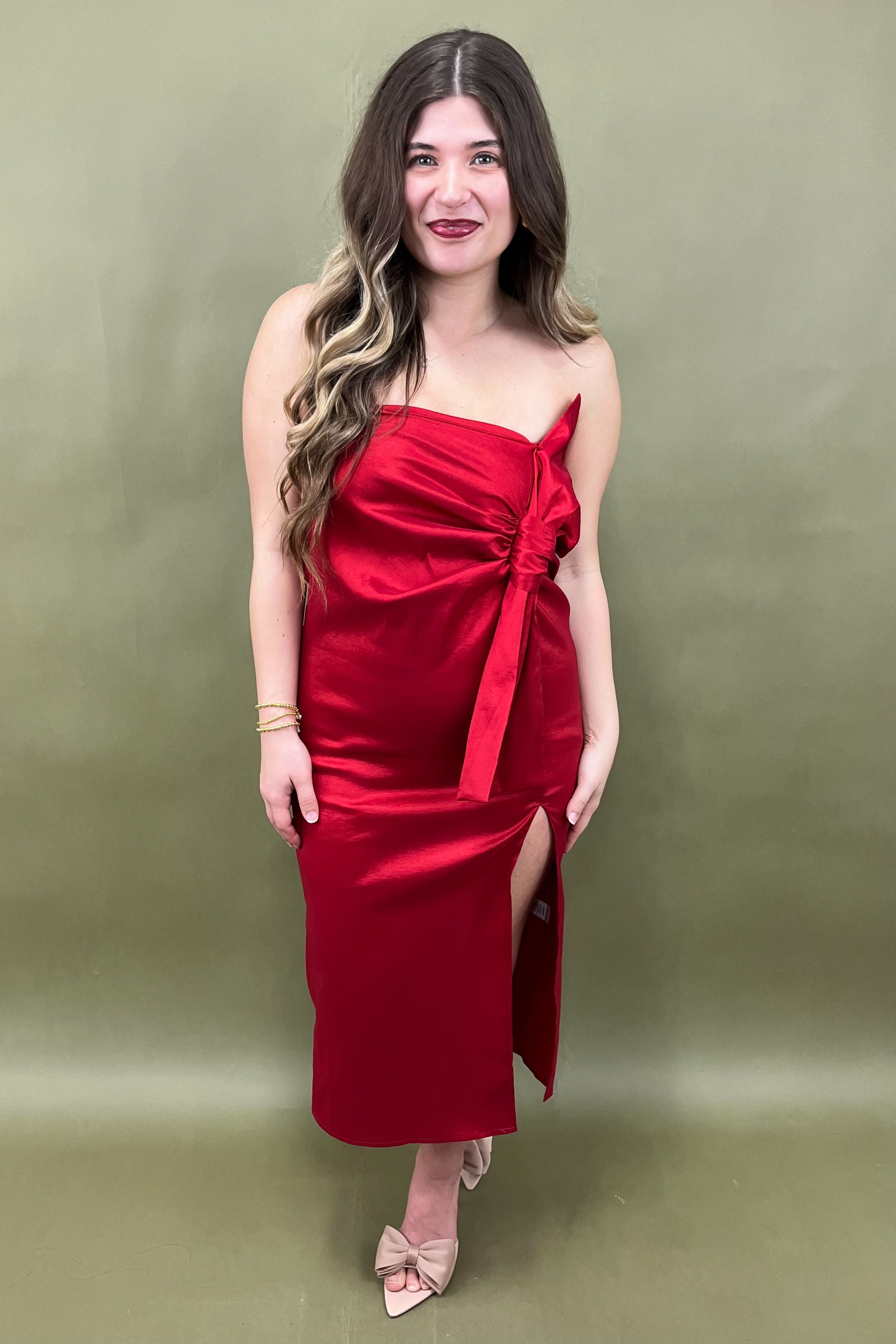 And let’s talk about that bow. 🎀 The oversized, sculpted bow detail across the bodice is nothing short of breathtaking. It’s bold yet refined, creating a statement look that turns simple sophistication into high-fashion art. The strapless neckline frames your shoulders perfectly, while the tailored bodice cinches you in just right. The midi-length hem and subtle slit add a modern, elevated touch — flirty, but always classy.