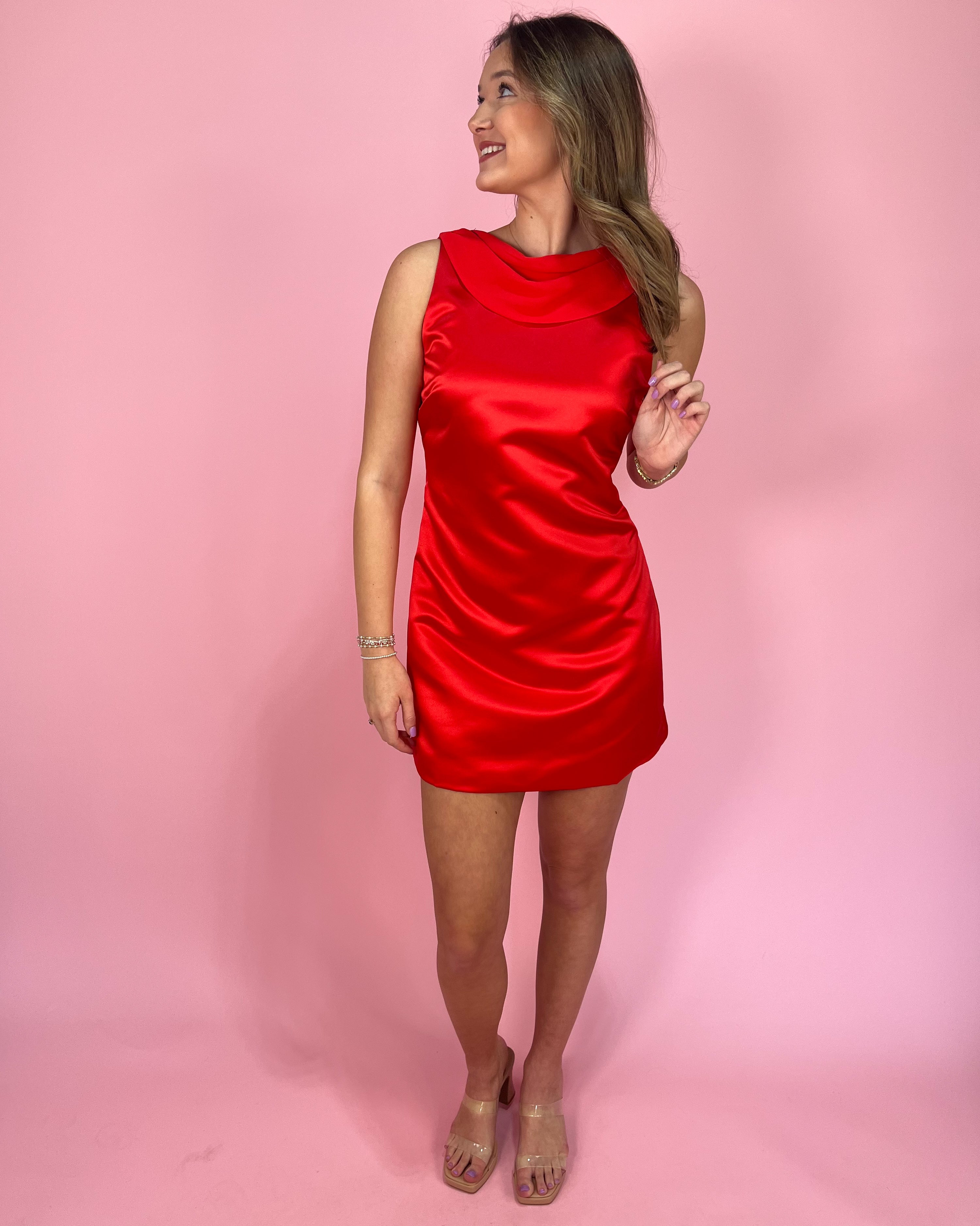 The satin finish gives it that luxe glow 💫 while the draped cowl neckline adds the perfect touch of soft romance 💕 It’s fitted in all the right places with a clean, classy silhouette that still brings the drama 💃