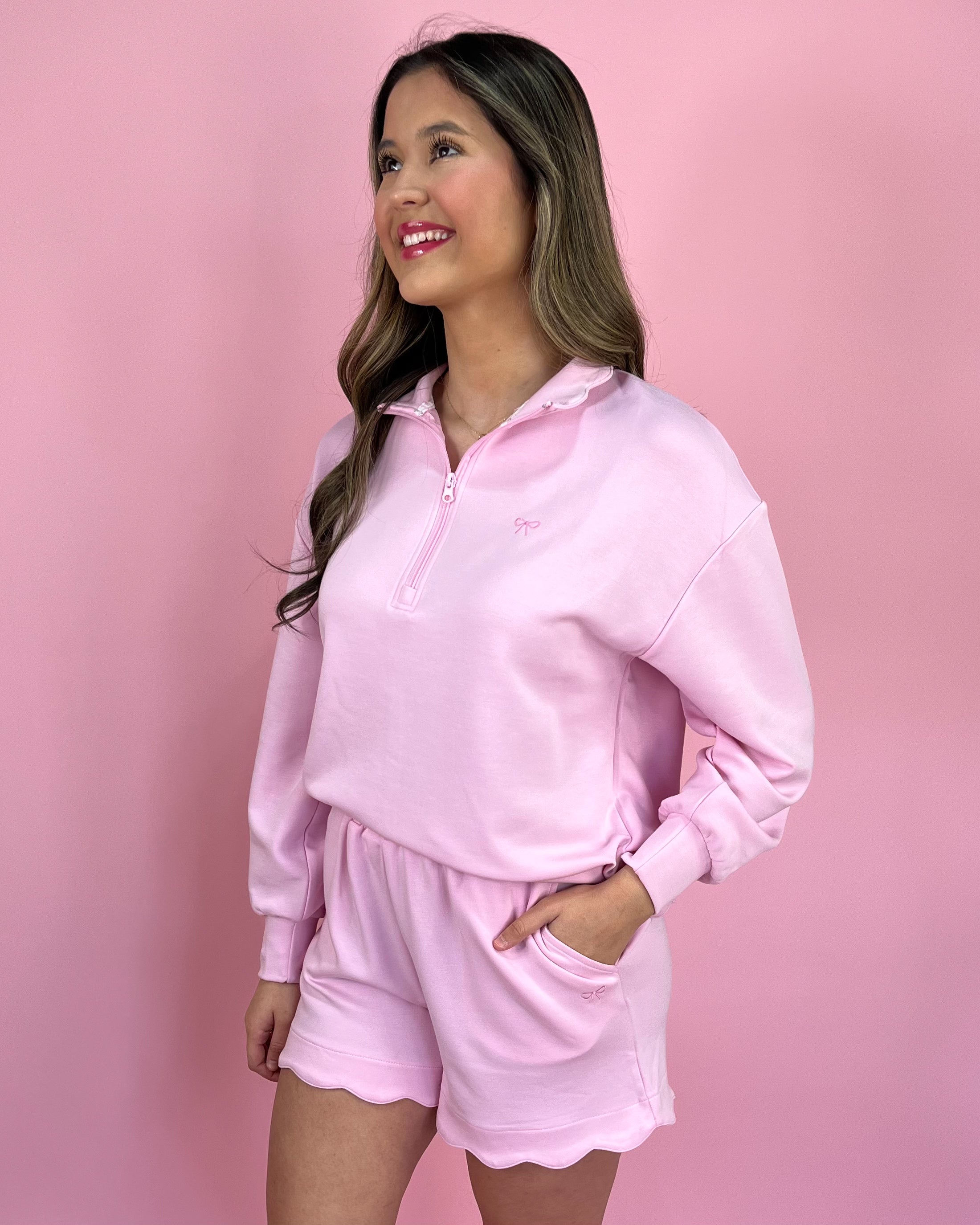 The quarter-zip pullover makes it feel sporty + polished 🙌 while the matching scalloped shorts keep it comfy and effortless for everyday wear 💕 Whether you’re lounging at home, running errands, or heading to brunch in sneakers — this set is a total go-to 💖👟