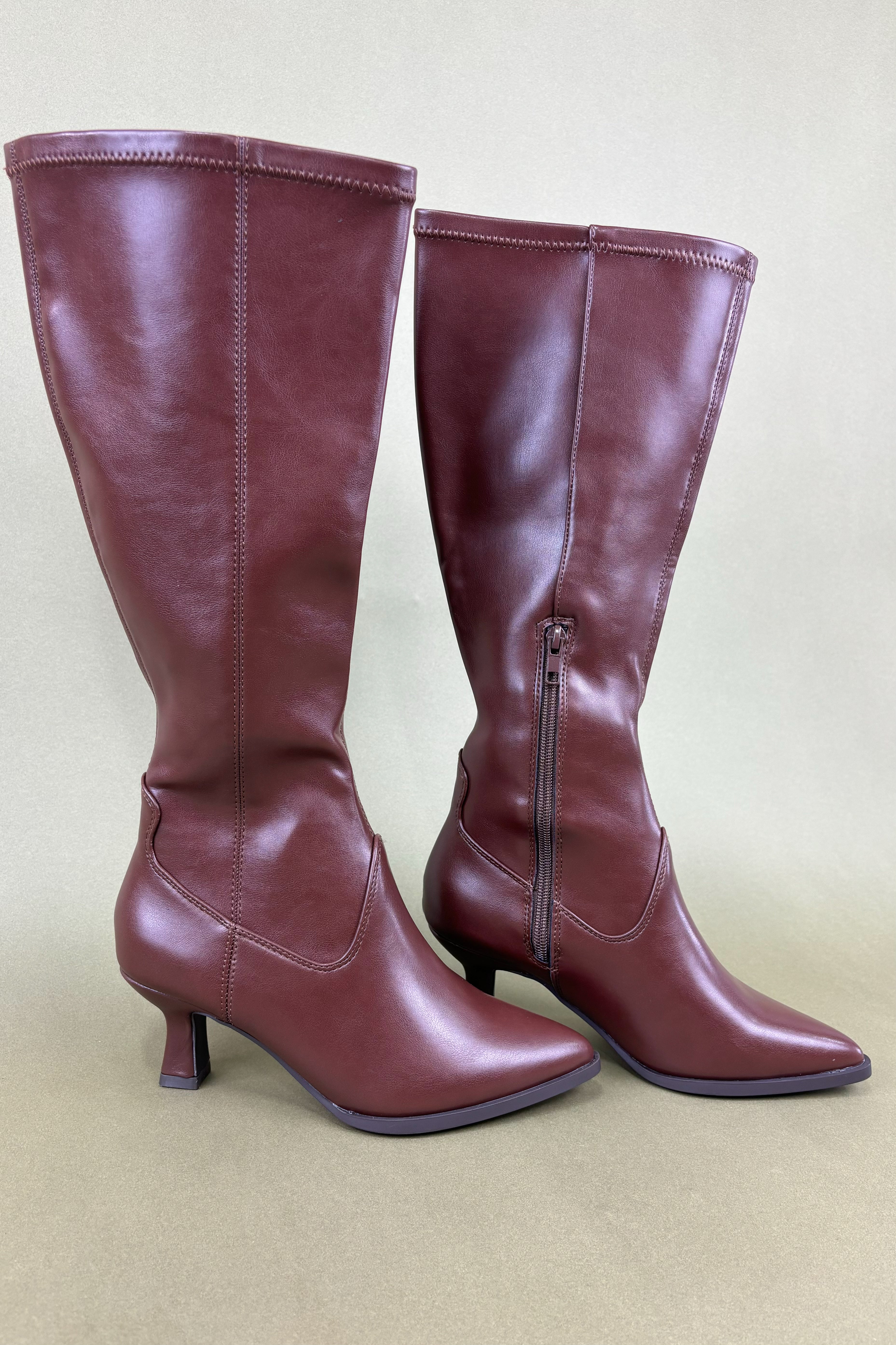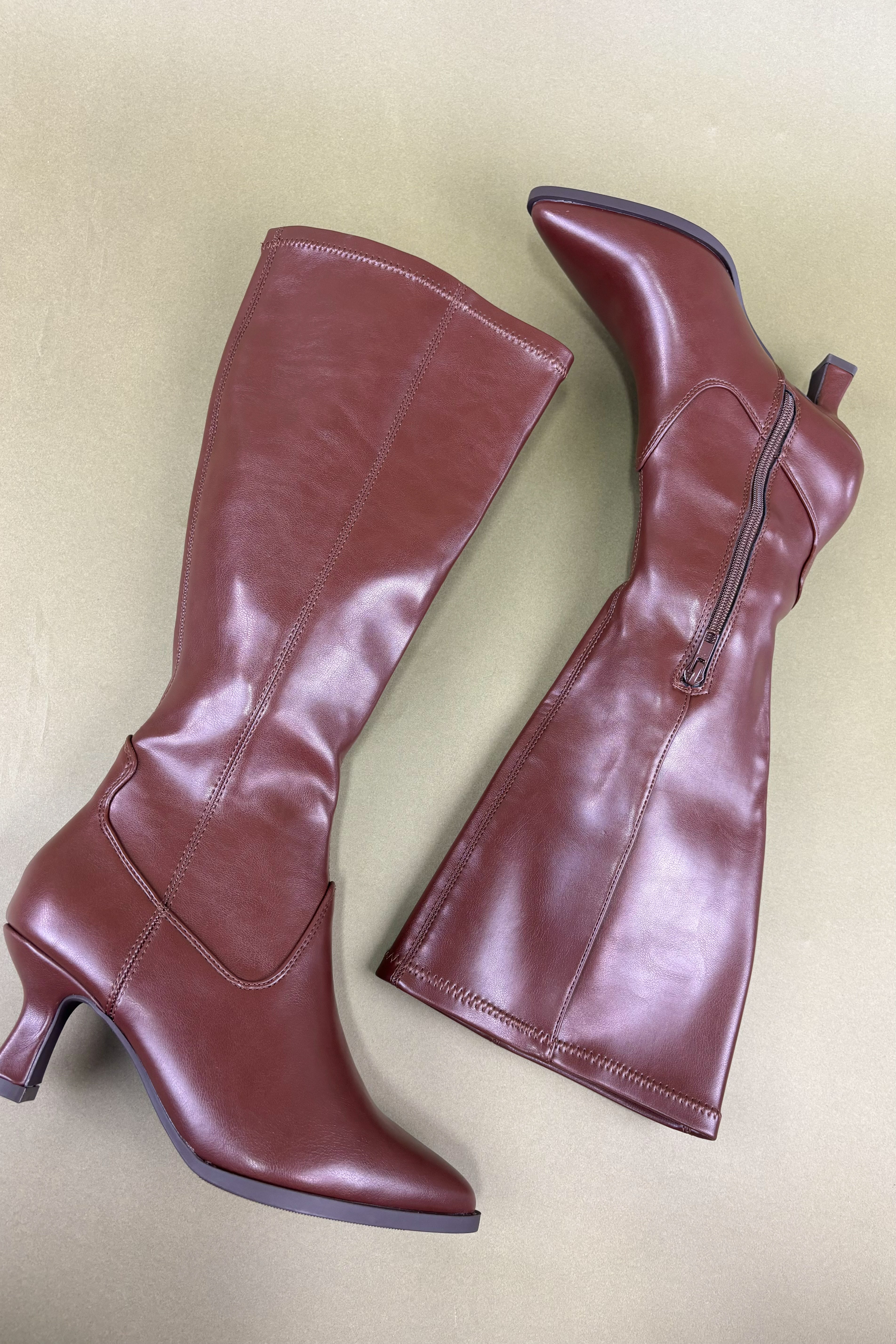 The rich brown shade makes a bold yet versatile statement, pairing effortlessly with dresses, skirts, and skinny jeans alike. A convenient side zipper ensures easy wear, while the smooth faux leather finish gives off a polished, high-end vibe. Whether you’re headed to the office, a night out, or a cozy fall gathering, these boots are your new go-to for standout style.