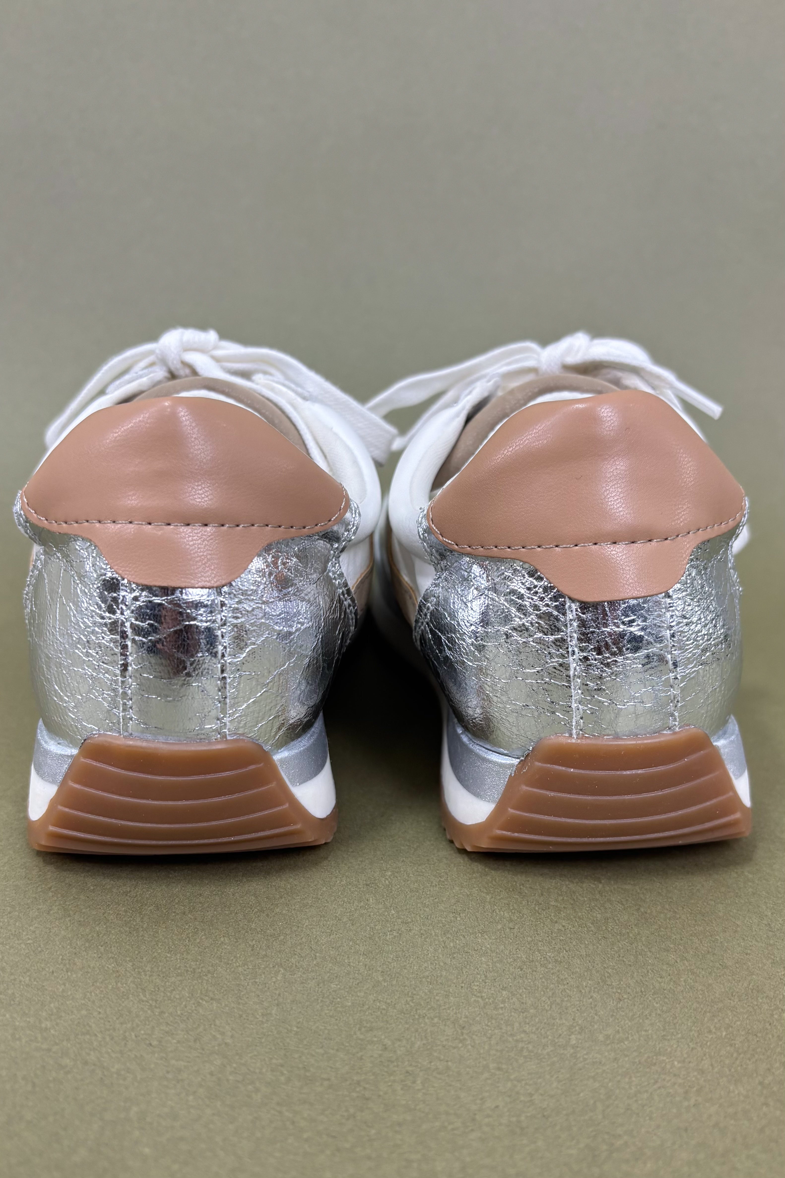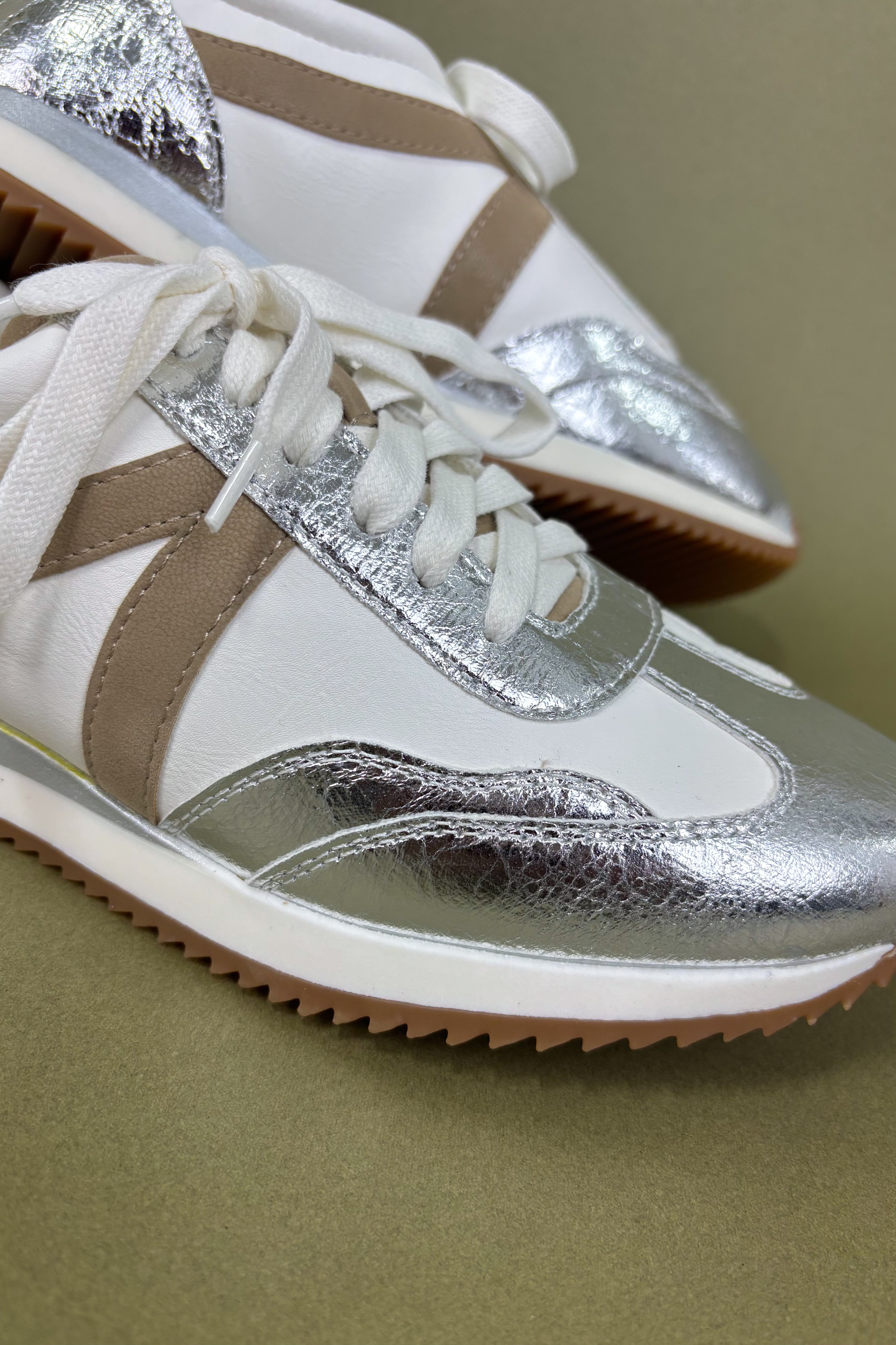 The Lindsay Silver Sneaker is where sporty comfort meets everyday glam ✨👟. With its eye-catching metallic silver accents, grounded by neutral taupe details and a crisp white base, this sneaker is designed to stand out while still being incredibly versatile. Think of it as your go-to shoe when you want to add a pop of shine without sacrificing comfort.