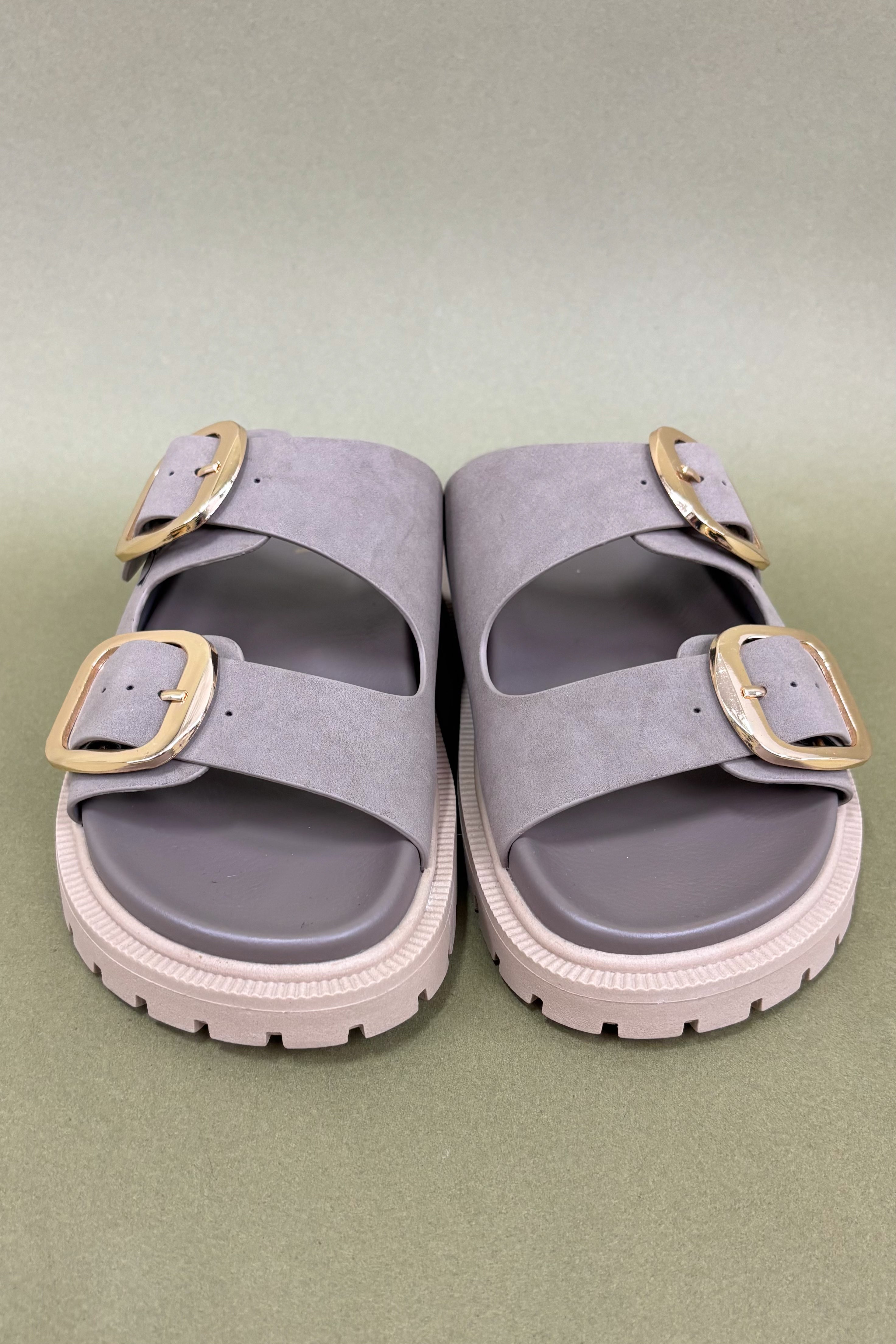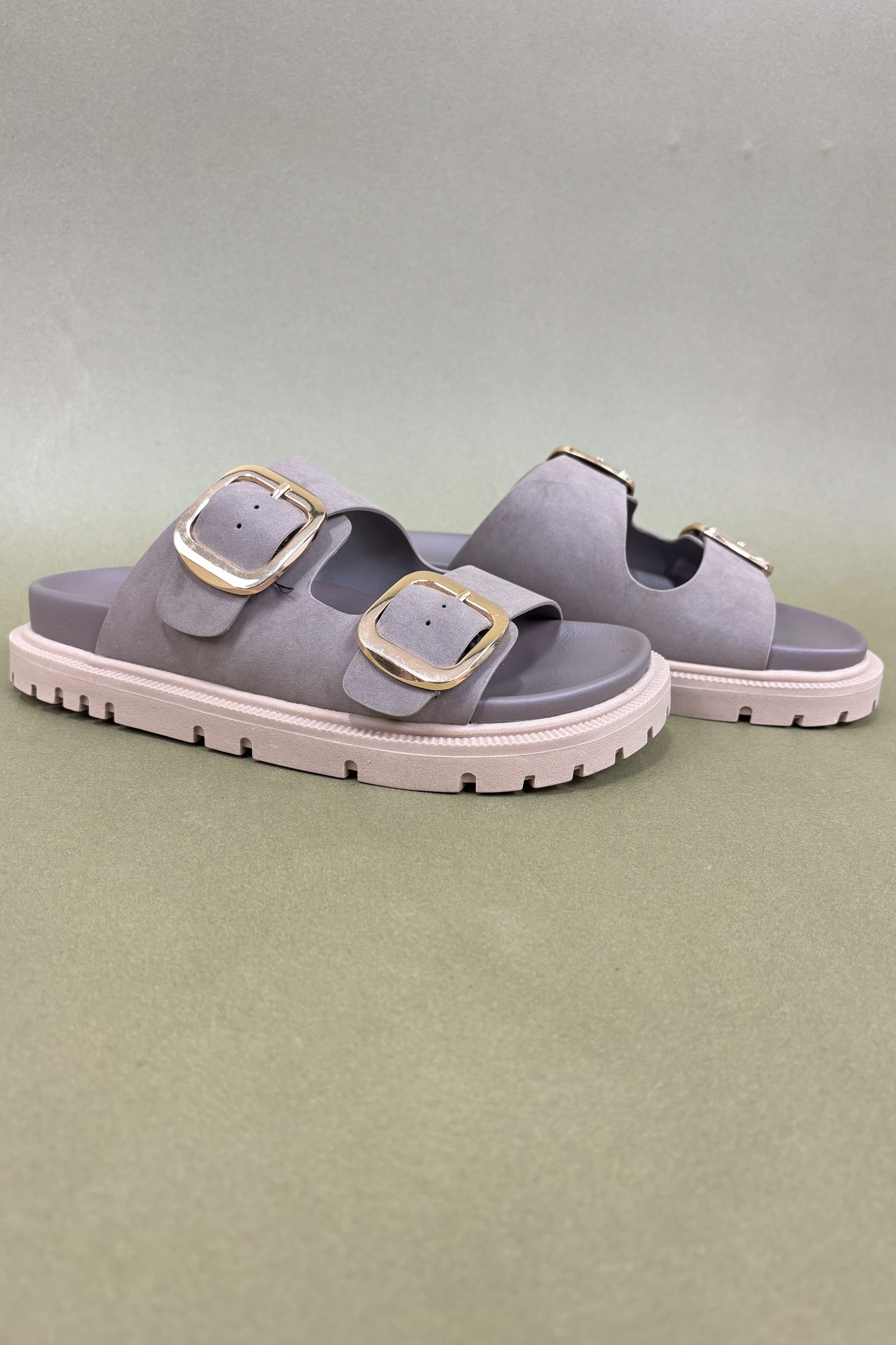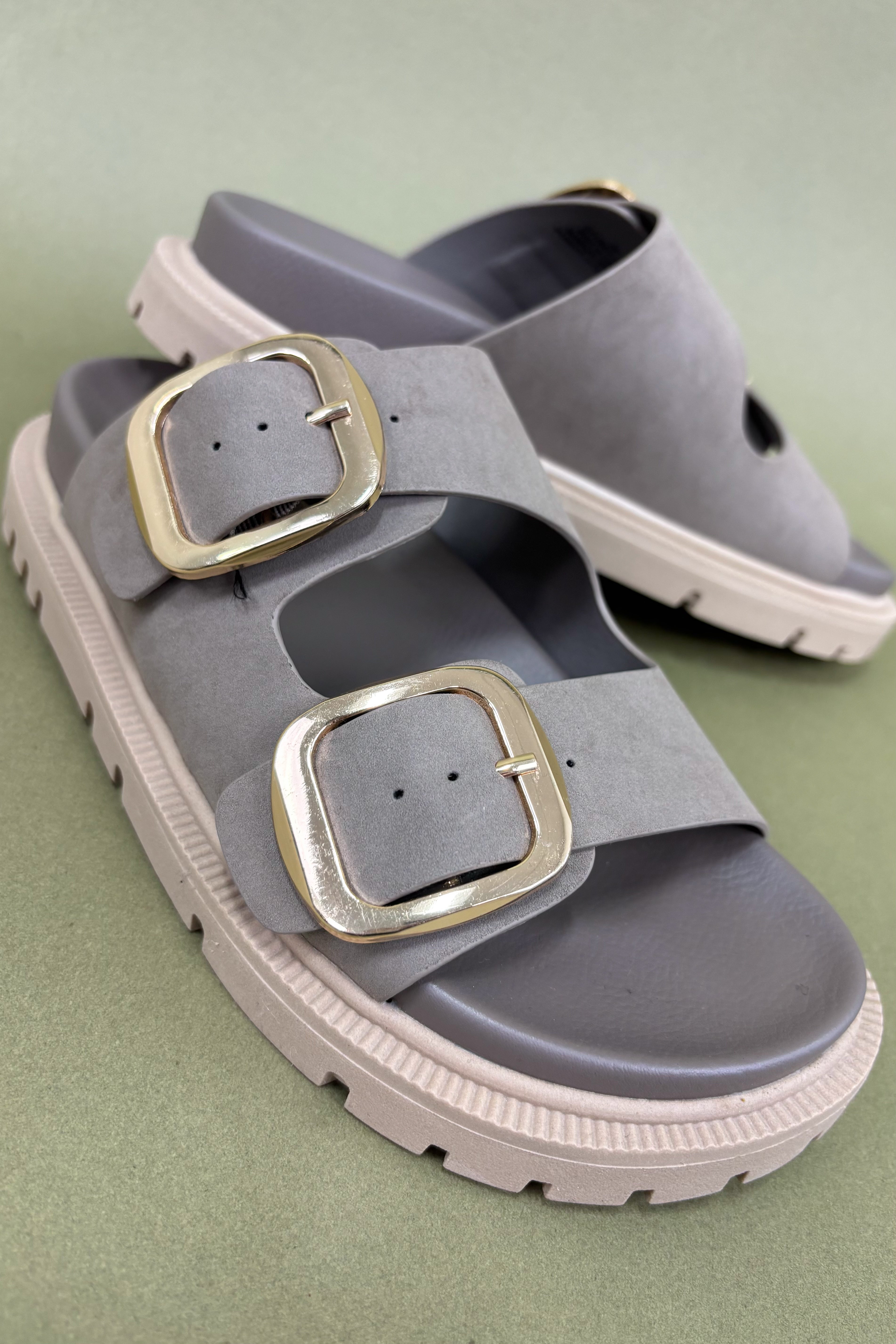 Meet The Nellie Gold Buckle Sandals đ â where casual comfort meets elevated charm. Designed in a cool slate gray tone with bold gold buckles, Nellie is that modern âit-girlâ slide that feels effortlessly chic no matter where youâre headed. The soft faux suede straps add texture and luxury, while the chunky white sole gives you that laid-back, trendy edge. These sandals are made for every moment â from coffee runs to beach days to casual dinners on the patio.