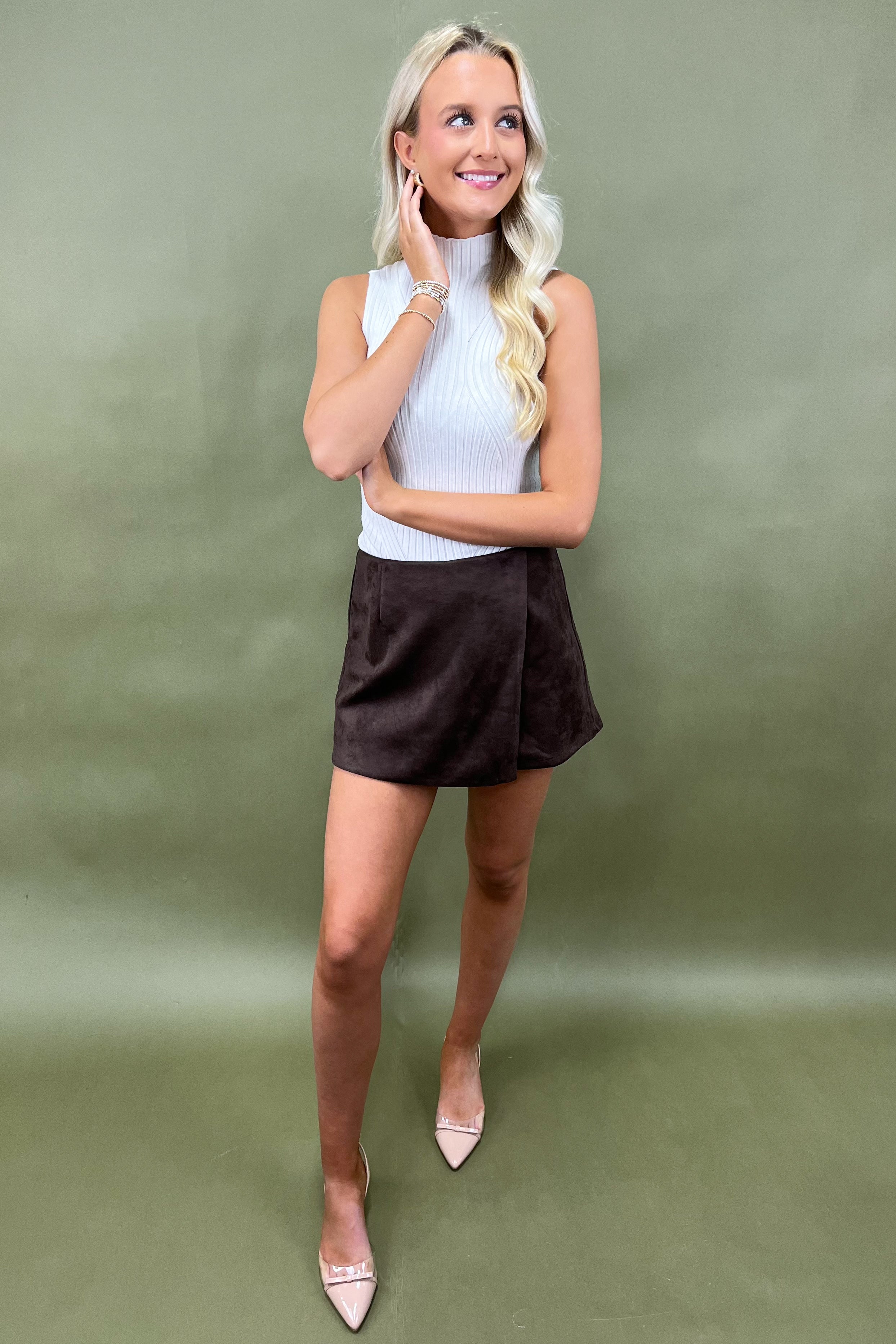 If your fall wardrobe had a love letter, this would be it. The Espresso Escape Skort is where timeless charm meets modern confidence—taking the chic appeal of a skirt and blending it with the comfort of shorts (because let’s be honest, nobody has time to worry about windy days 🍂). Crafted in a lush faux suede that feels velvety-soft to the touch, this deep espresso brown skort brings all the warm, cozy vibes while still keeping you polished enough to turn heads at brunch, the office, or your next night out.