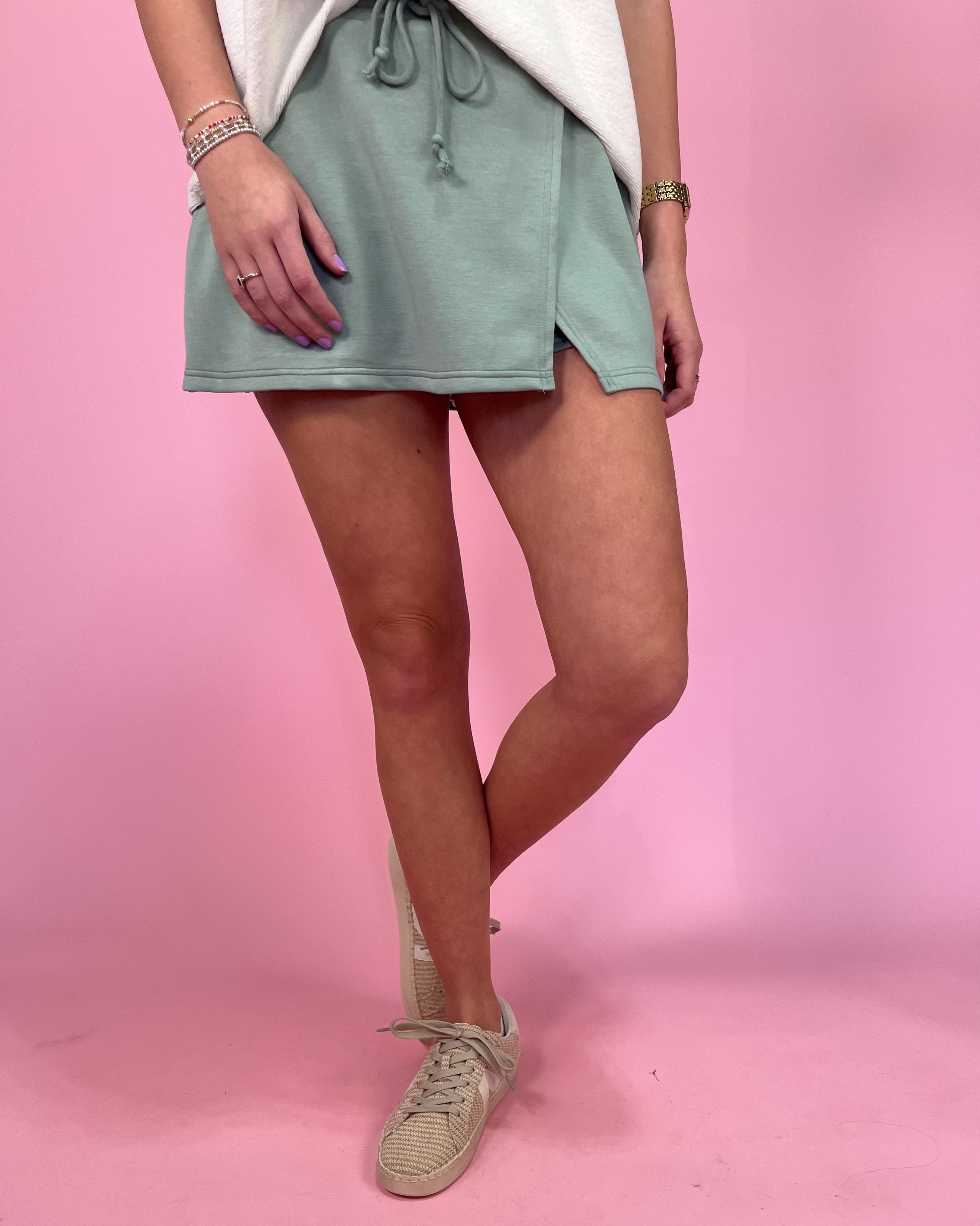 The It Girl Olive Drawstring Mini Skort is where sporty comfort meets everyday cool. Designed in a soft, muted olive tone, this flirty mini gives you the look of a skirt with the built-in confidence of shorts underneath.