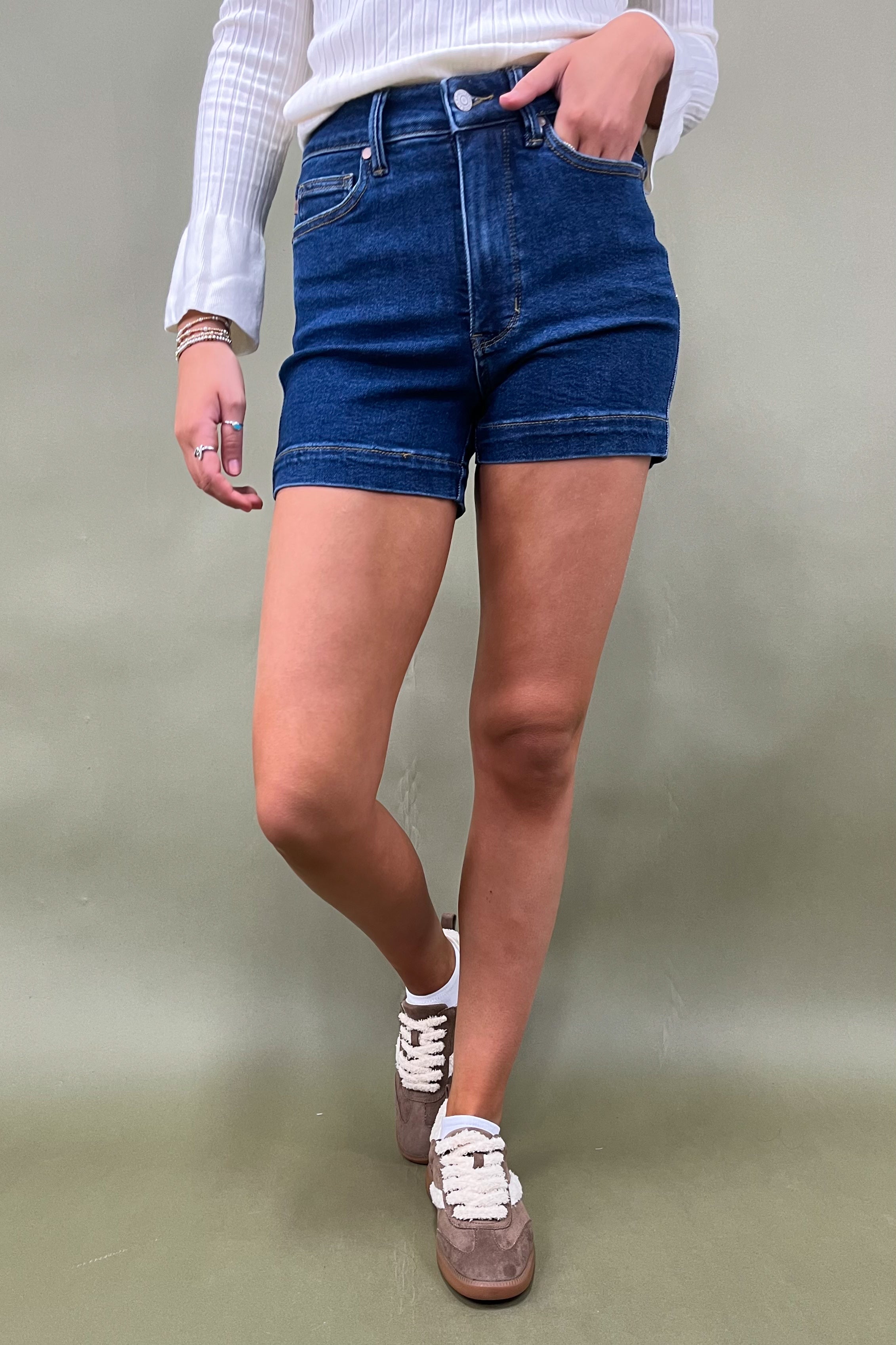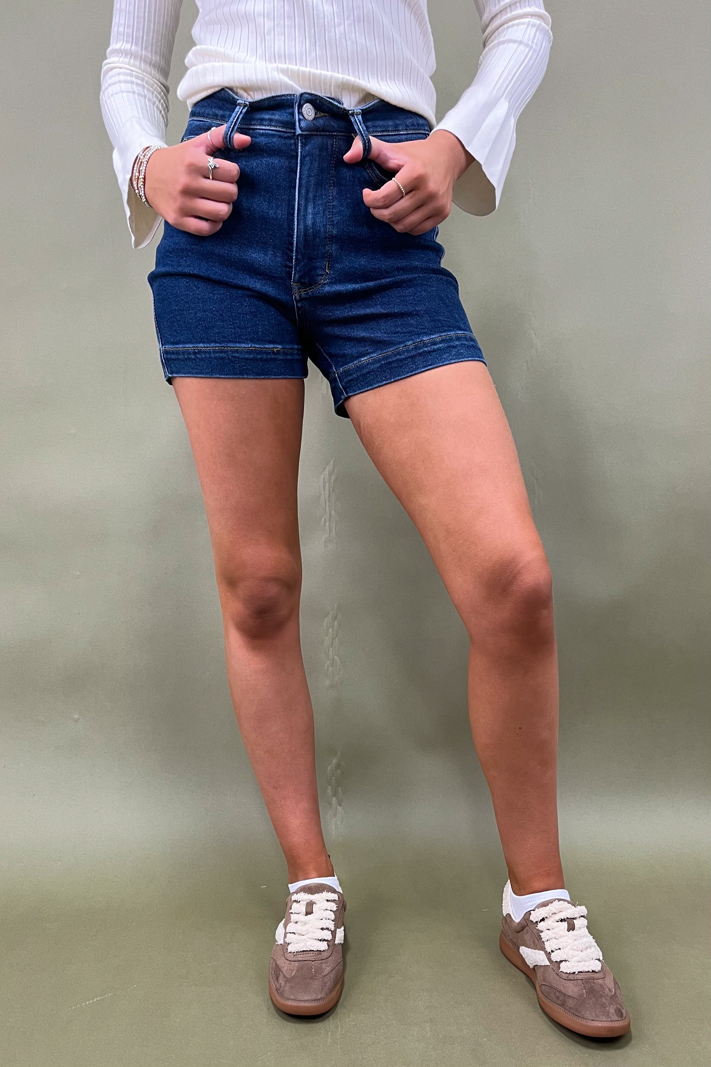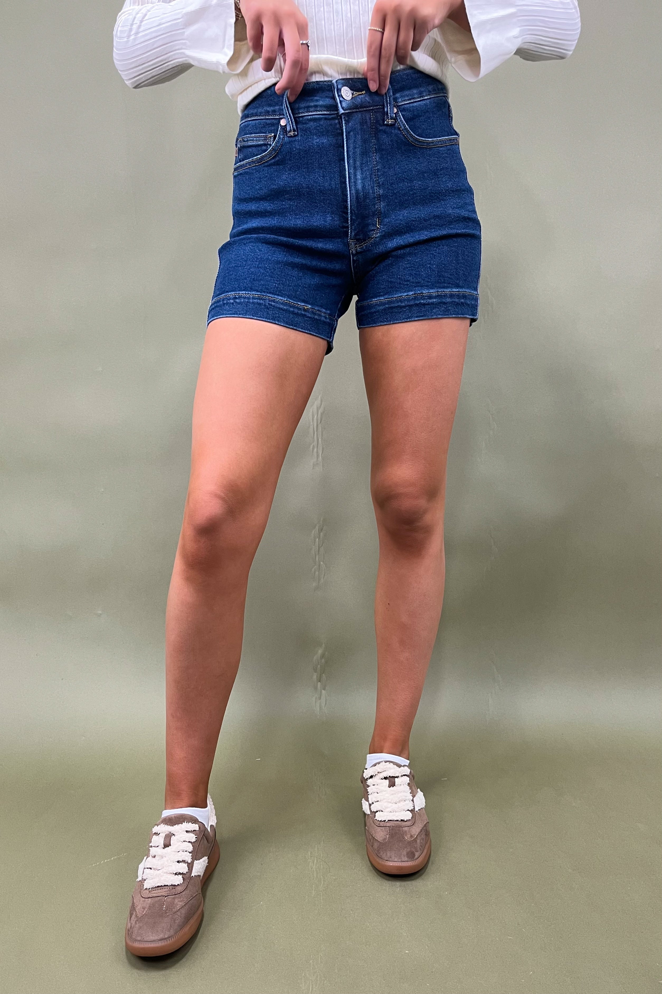 The wash? A rich medium-to-dark indigo that’s sleek enough to dress up but casual enough to throw on with a tank and sandals. The clean hemline keeps things classic (no crazy distressing, just chic & timeless), which makes them your go-to for any summer vibe. Whether you’re beach bound, headed to a backyard BBQ, or strolling through downtown with a latte in hand ☕, these shorts keep you looking effortlessly stylish.