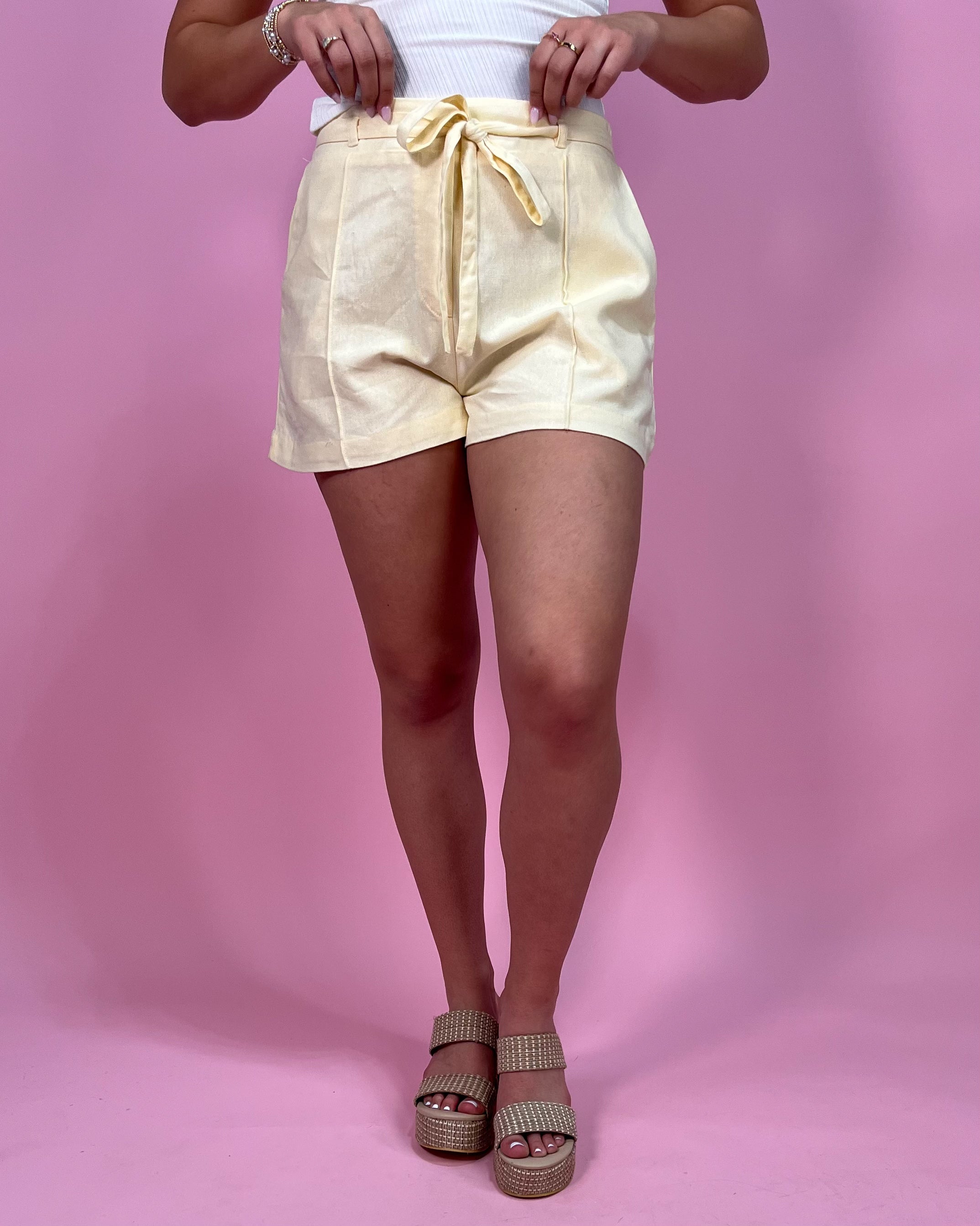 Designed with both comfort and versatility in mind, they include a stretchy elastic waistband in the back and a functional tie-waist front for that flattering, adjustable fit. The soft yellow hue adds the perfect pop of brightness—making these a go-to for everything from casual errands to vacation looks.
