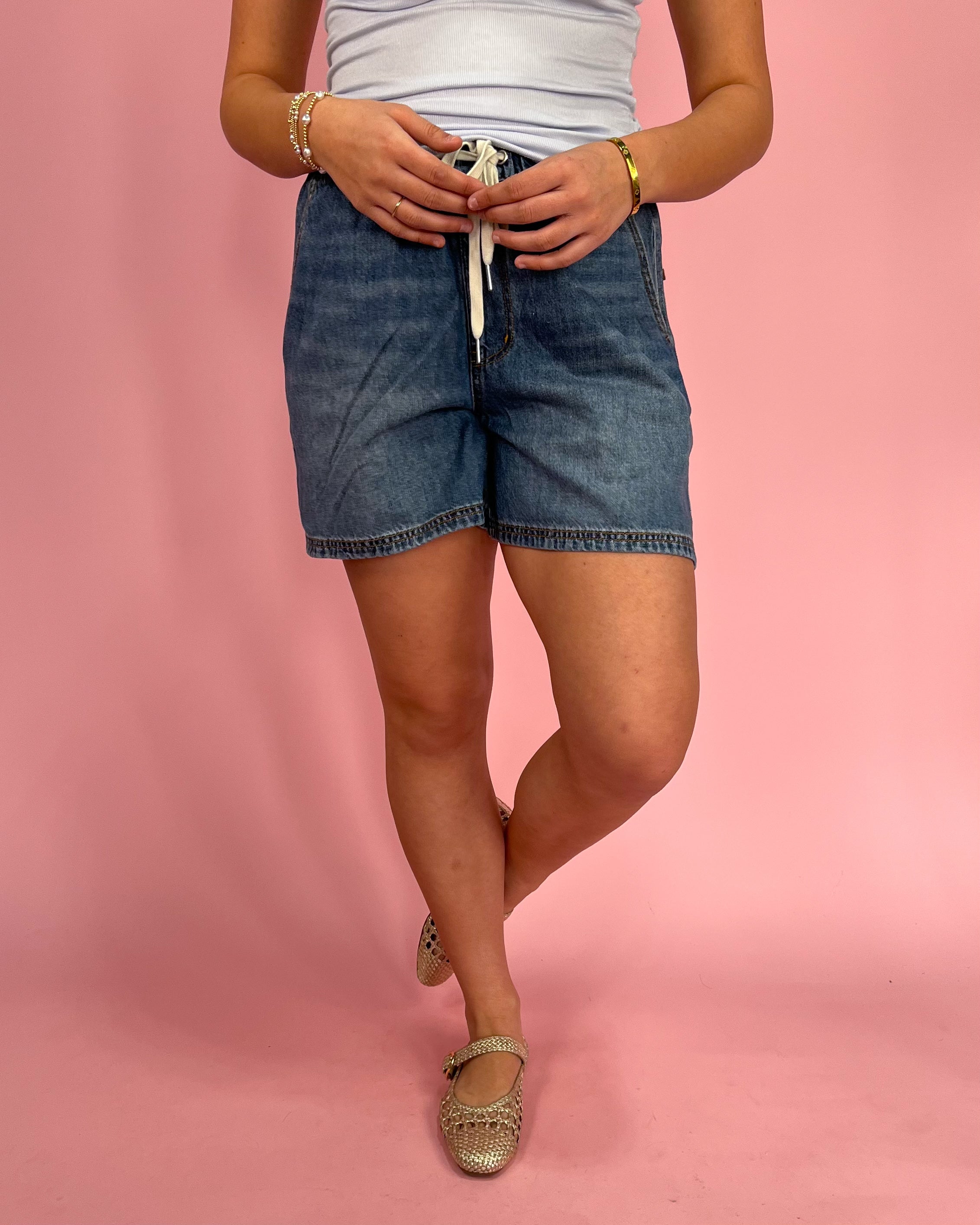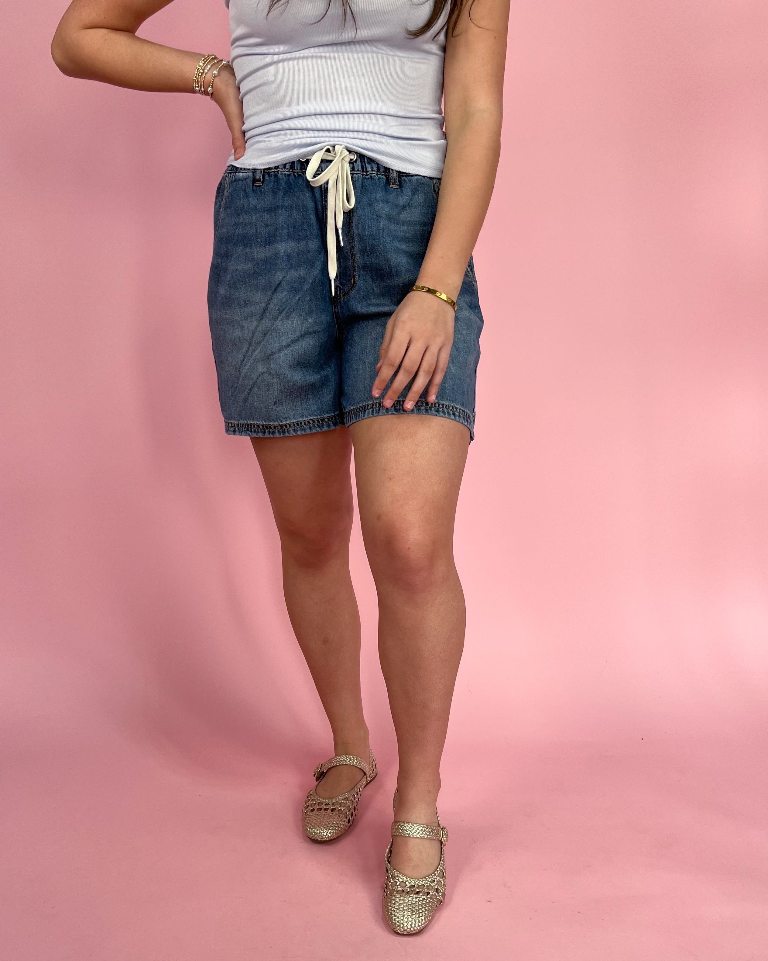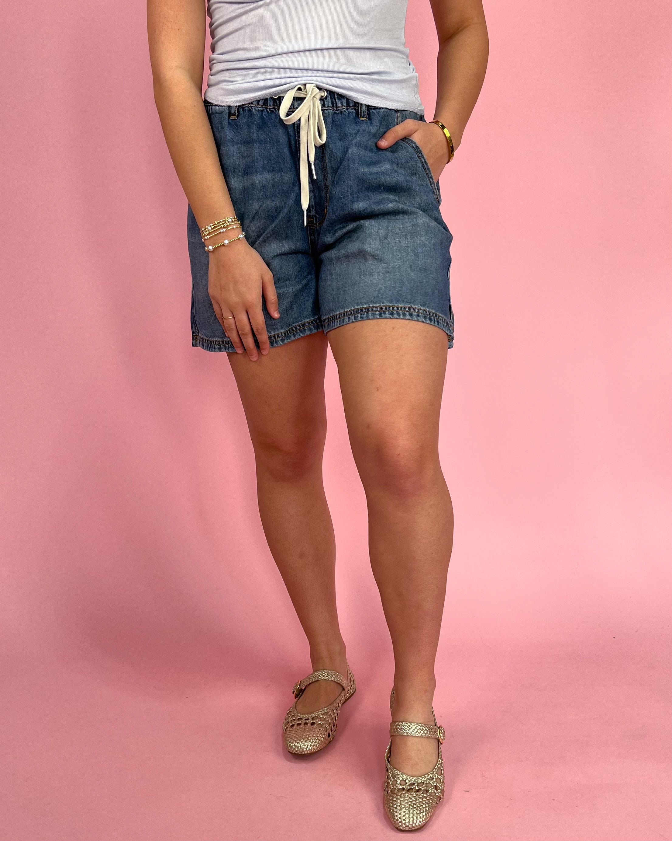 Style: High Waist • Baggy Denim Short • Drawstring Waist 👖✨Model Stats: Grace is wearing a size Medium. See size chart for more info. 💕