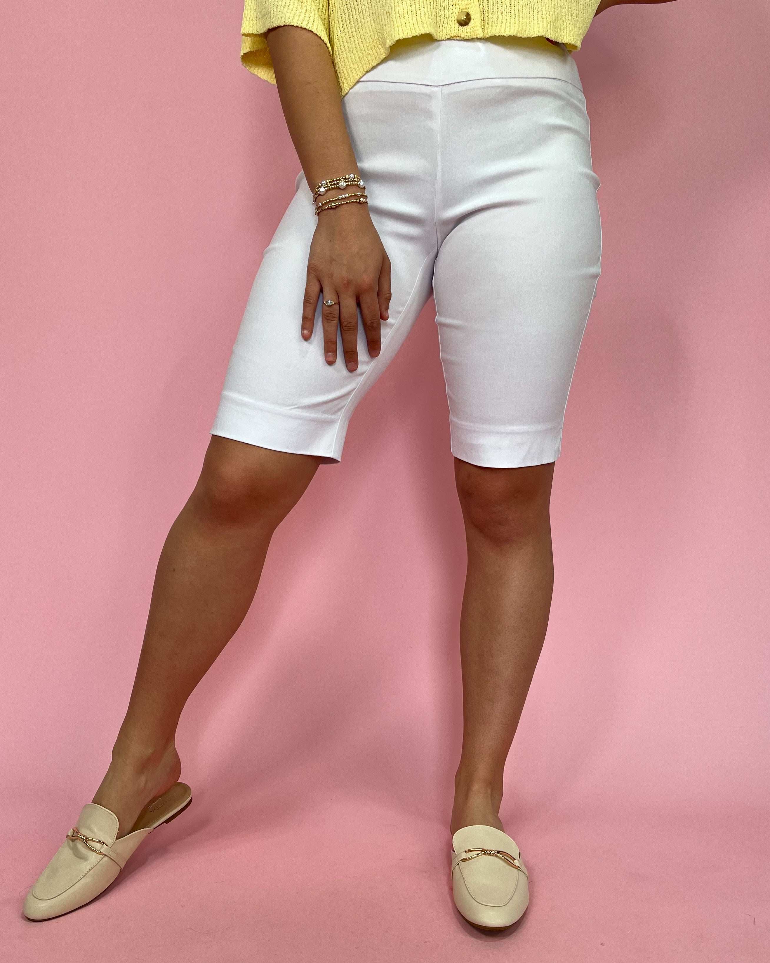 Clean, crisp, and effortlessly polished — The Gretchen Bermuda Pull-On Shorts is the fresh white staple your wardrobe needs. Designed with a tailored silhouette and an easy pull-on waistband, these give you that structured, put-together look while keeping comfort a top priority.