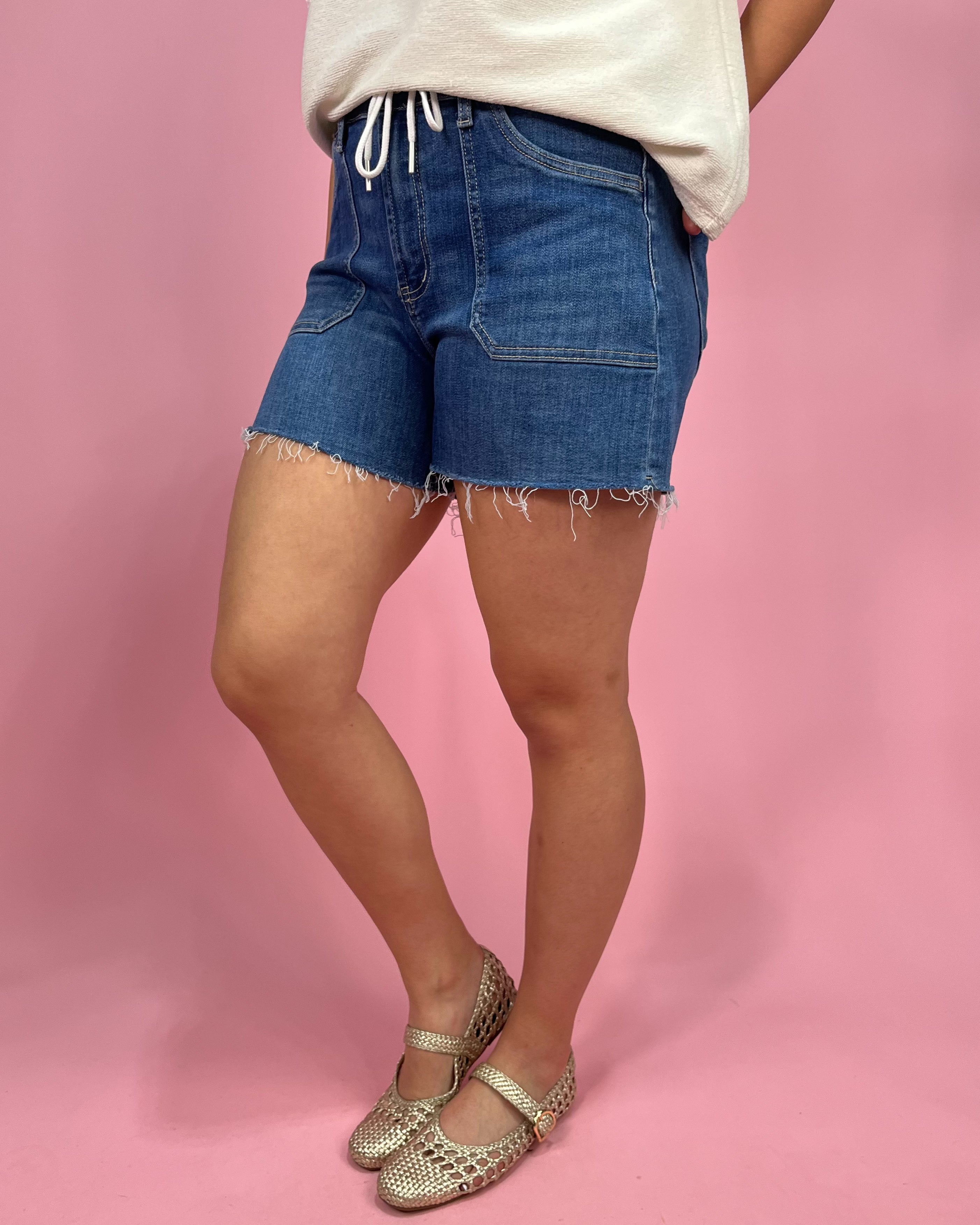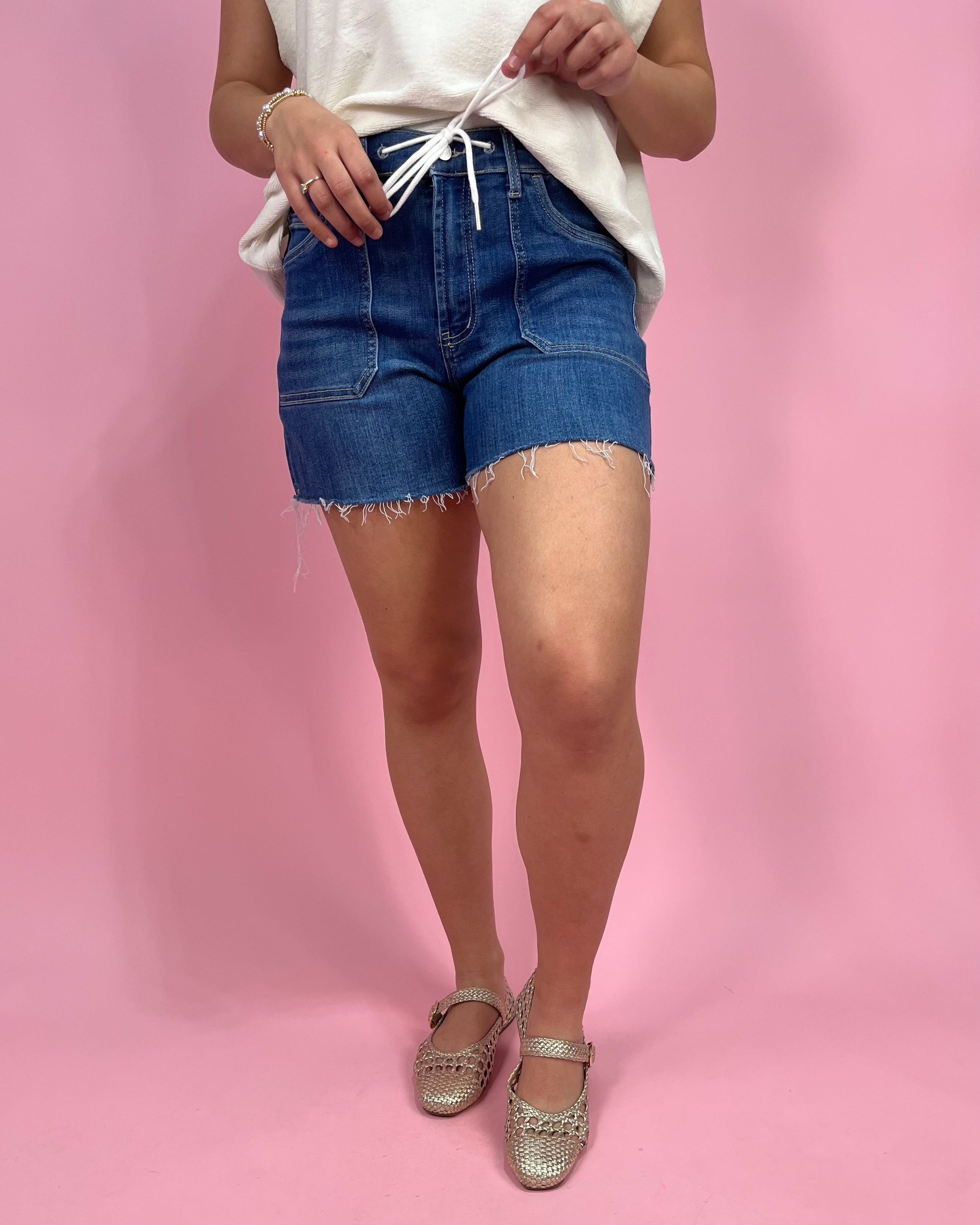 Style: High Rise • Drawstring Waist • Raw Hem Denim Shorts