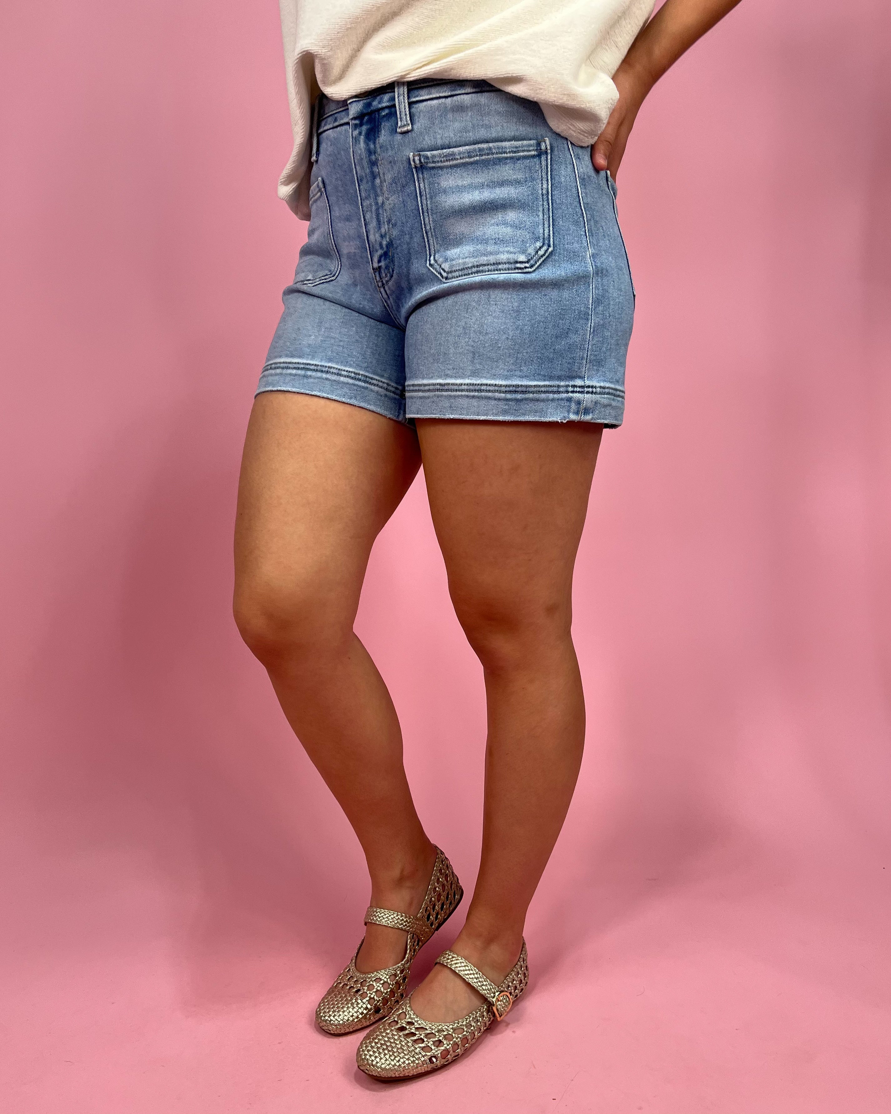Style: High Rise • Light Wash • Classic Denim Shorts