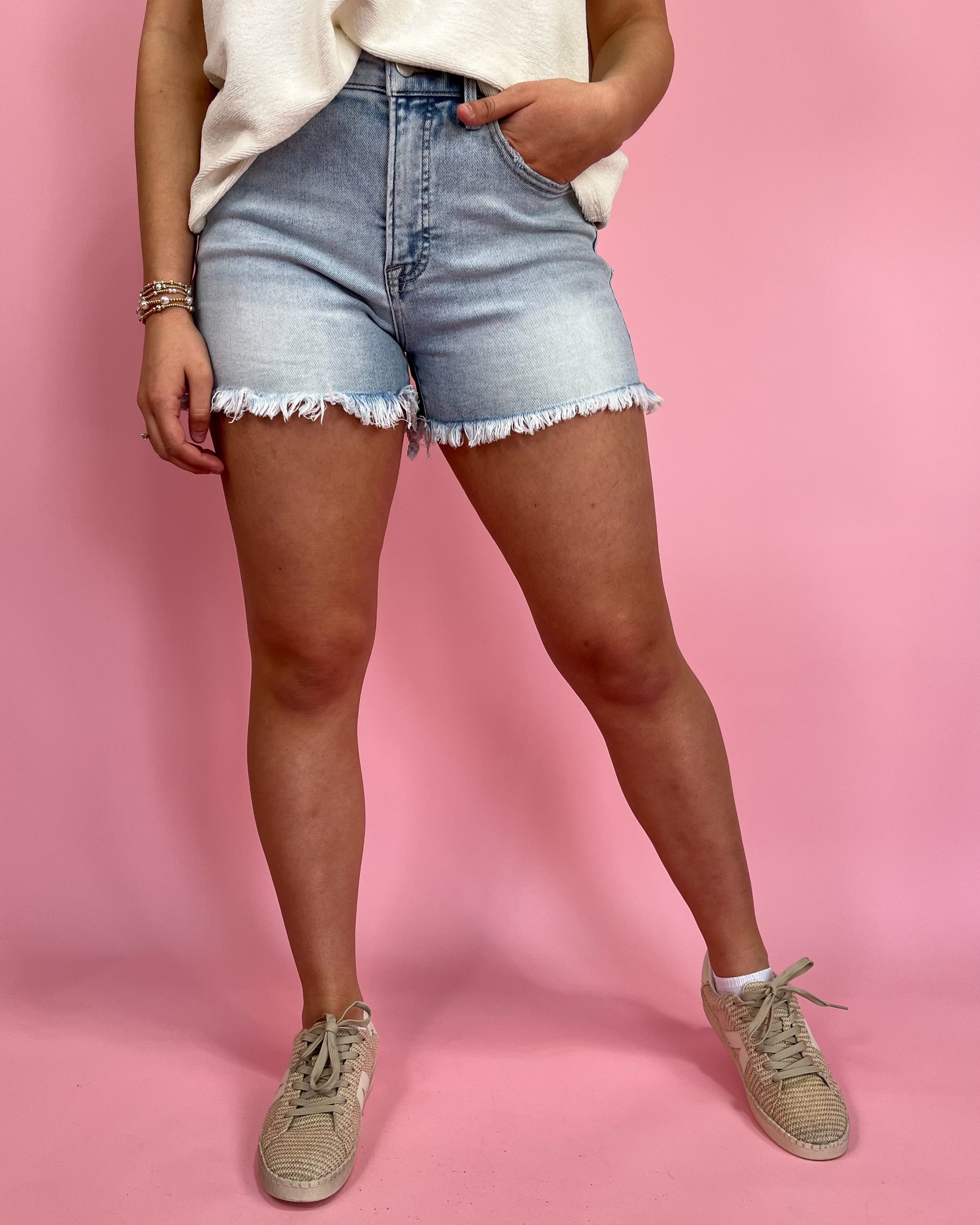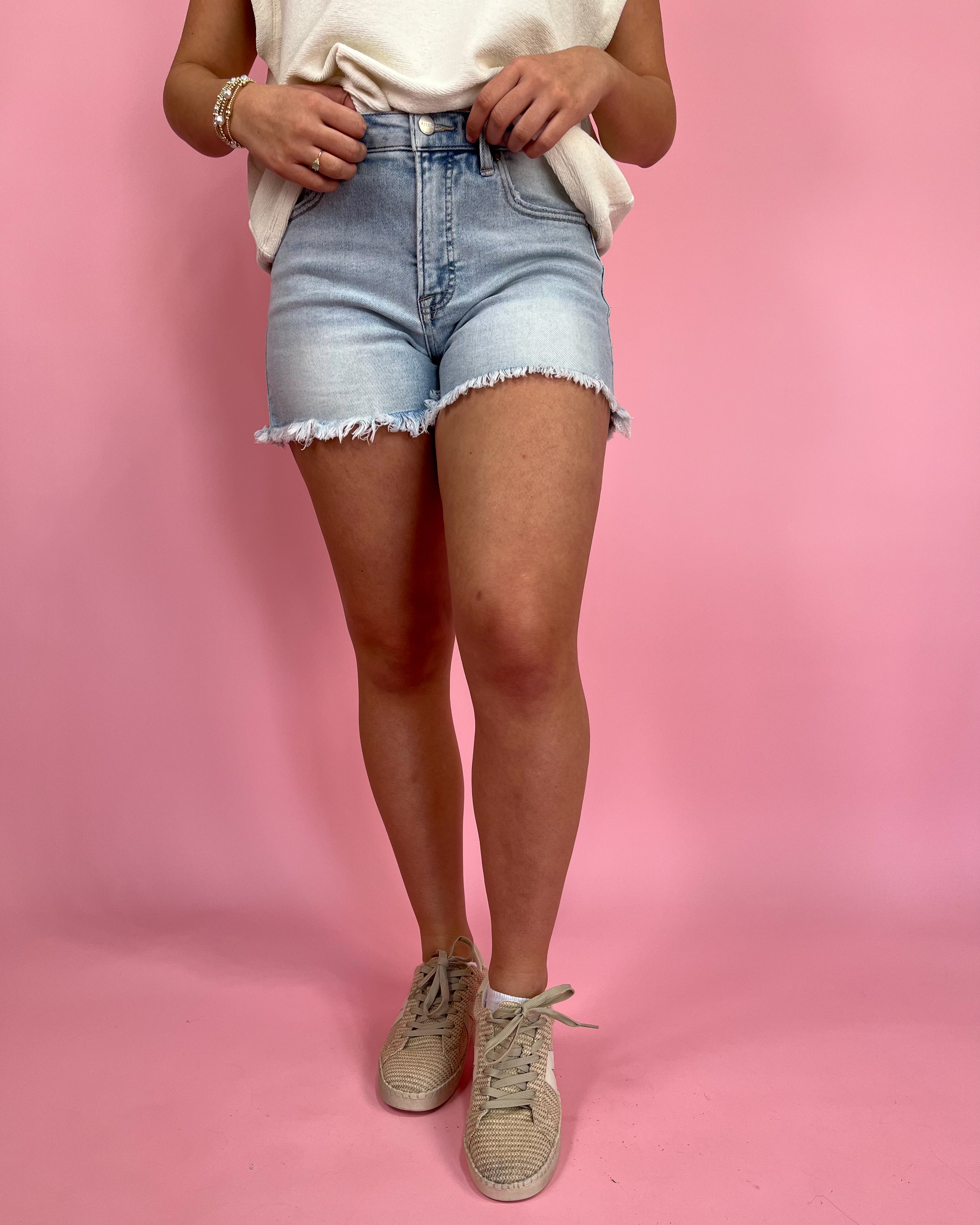 The wash is the perfect everyday light denim — not too dark, not too distressed, just clean and timeless with a little edge. And that frayed hem? It’s the ultimate laid-back detail that gives your outfit that “cool girl” finish without even trying. Plus, the 3” inseam is that sweet spot length — not too short, not too long — just the perfect flattering fit for everyday wear.
