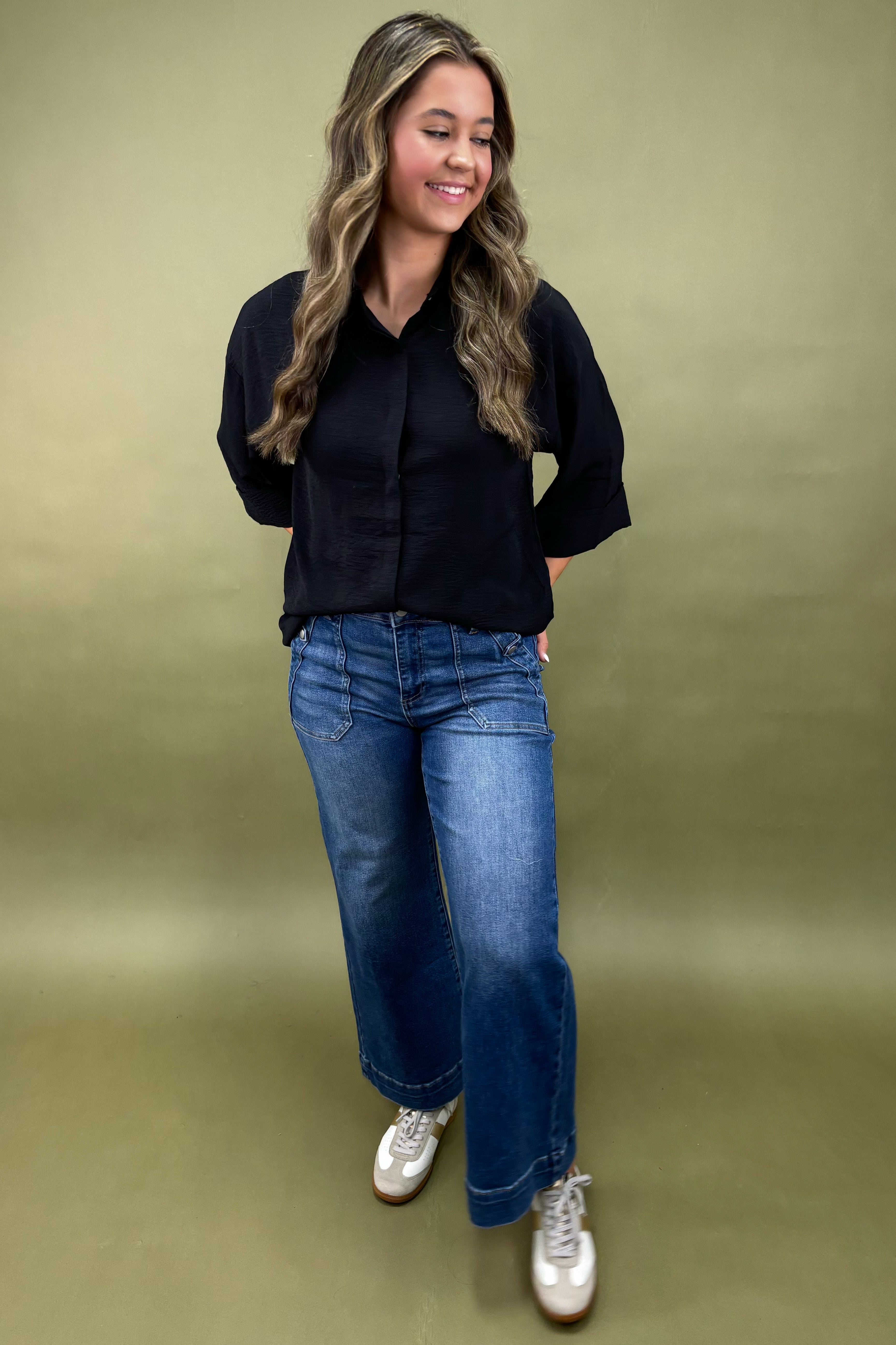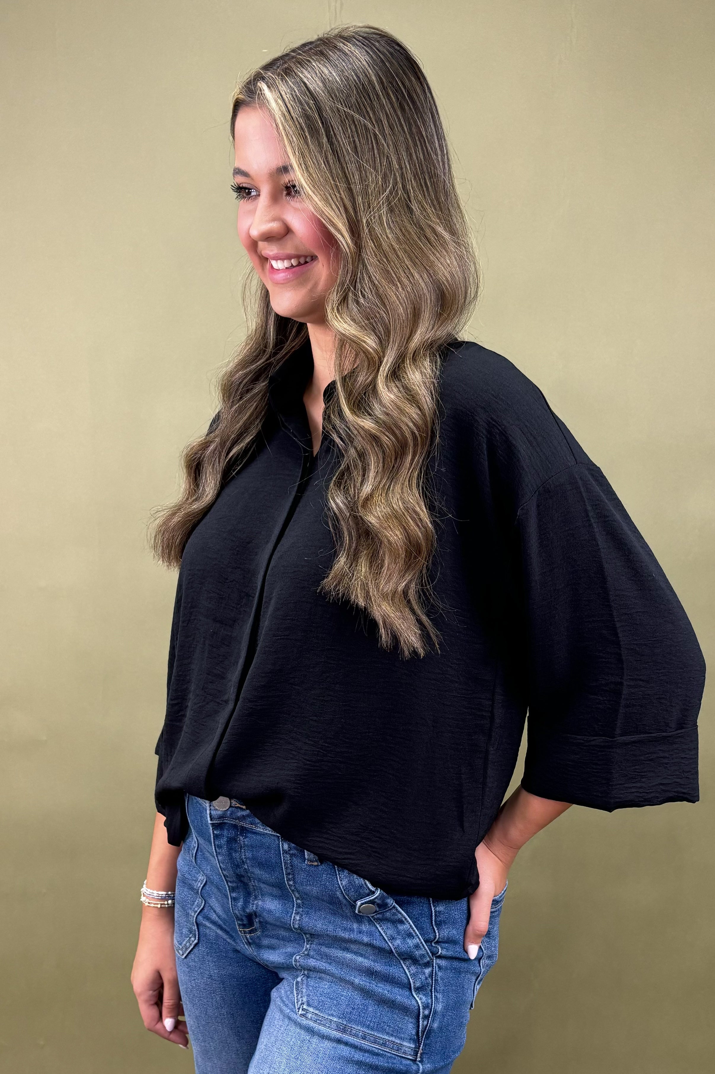 Meet your new go-to wardrobe staple: the effortlessly chic black button-up top that combines timeless sophistication with modern ease. Whether you’re headed to the office, a dinner date, or simply want to elevate your everyday look, this piece is the definition of versatile style.
