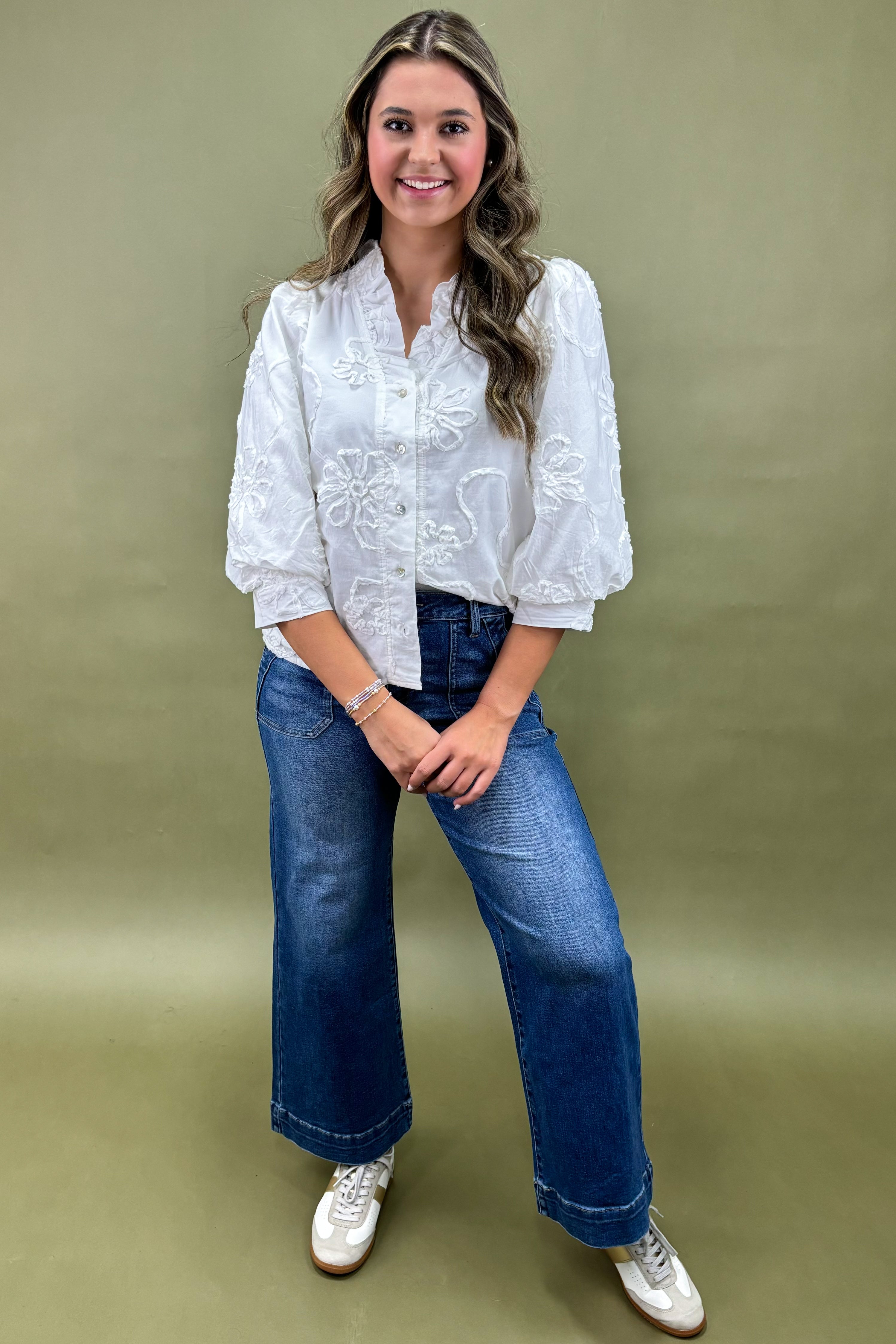 This is the kind of blouse that doesn’t just sit in your closet — it becomes your go-to for everything. With its timeless white hue, delicate appliques, and versatile styling options, it’s not just a top, it’s a wardrobe essential that feels modern yet classic, easy yet elevated.