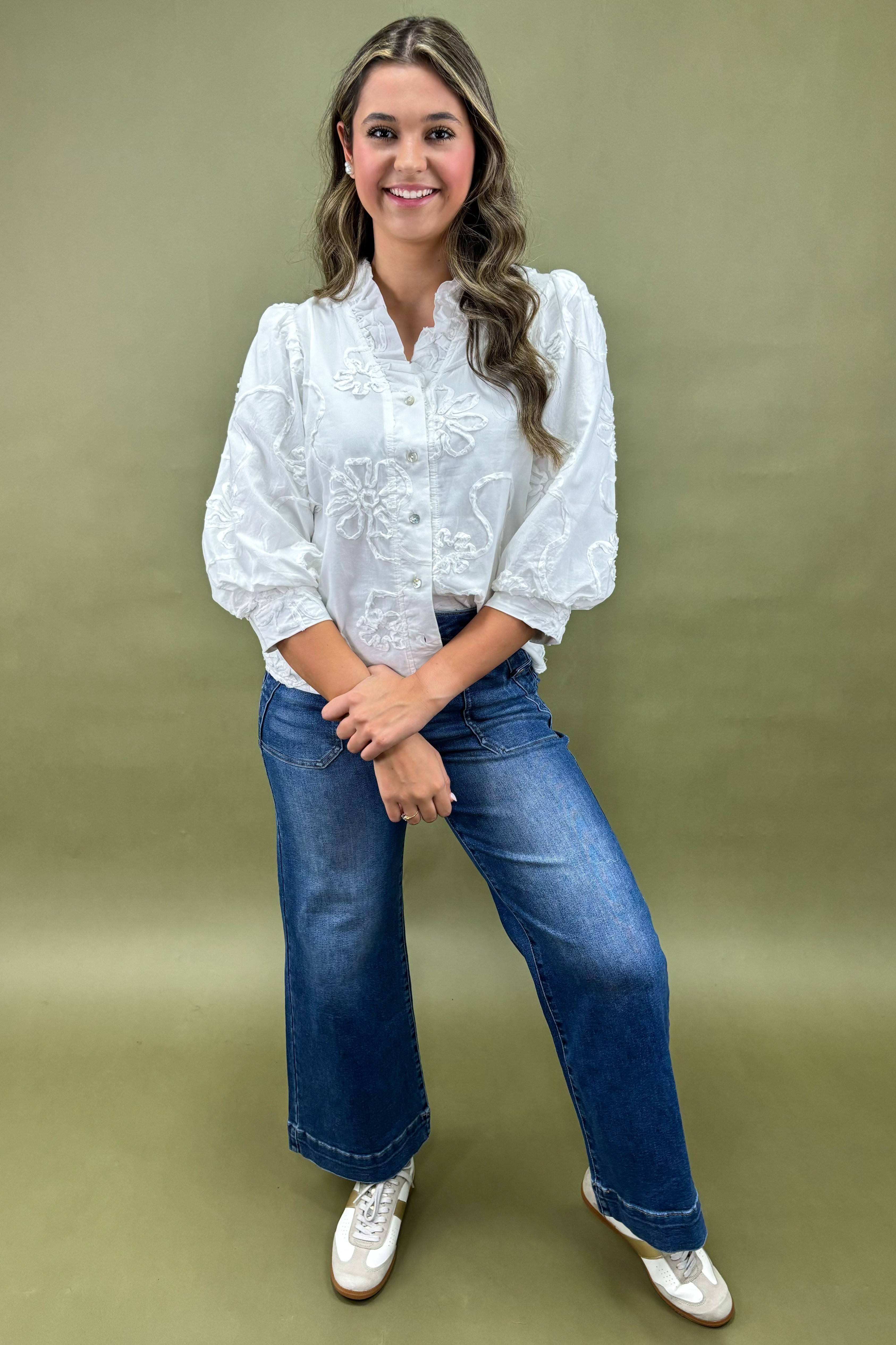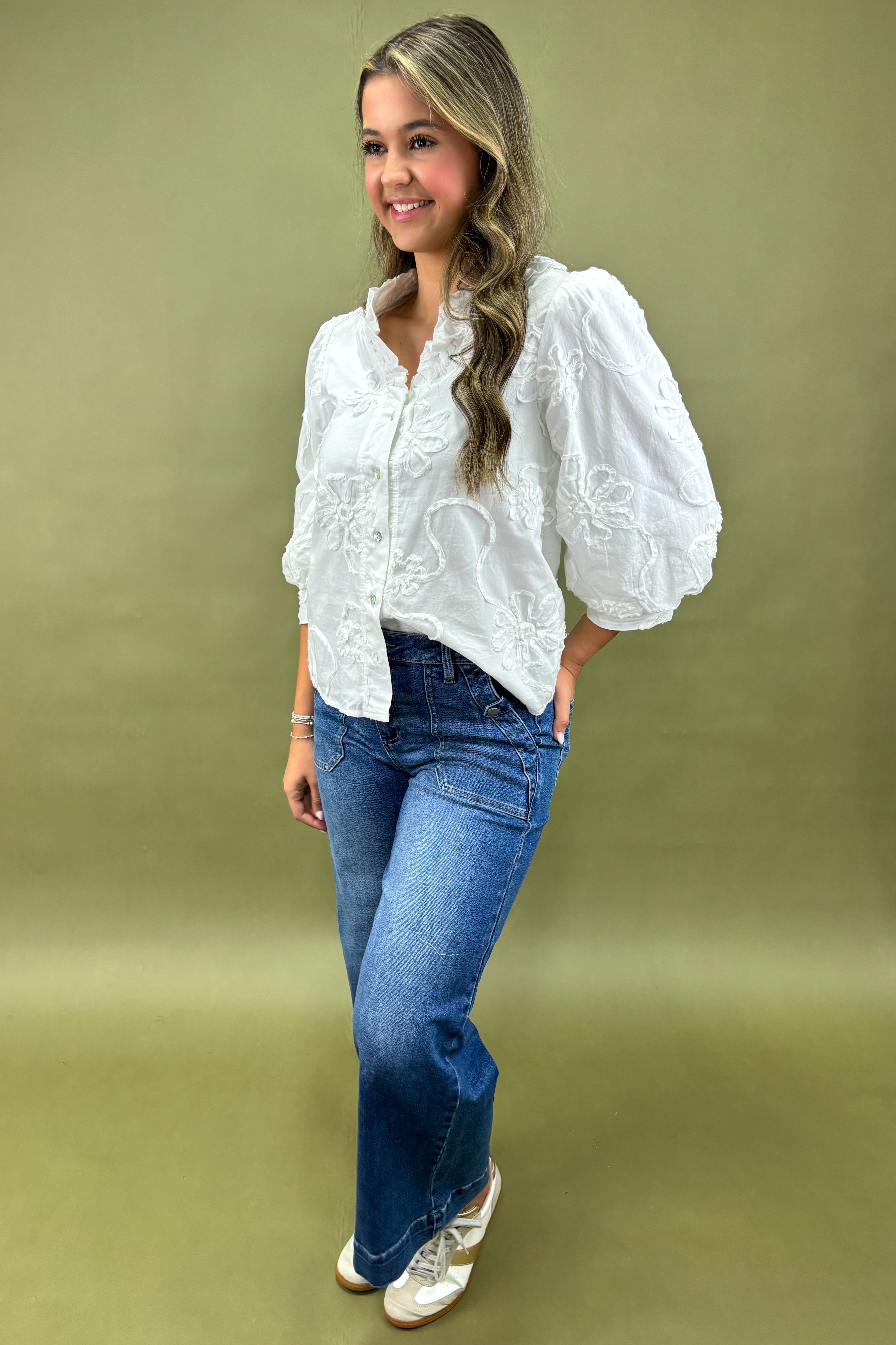 Crafted in a lightweight fabric, it drapes beautifully and feels breathable on the skin. The crisp white base is brought to life with delicate floral embroidery, giving it a subtle texture and visual interest that feels feminine yet sophisticated. Unlike a plain white button-up, this blouse makes its own statement — one that feels fresh, charming, and just a little bit romantic.