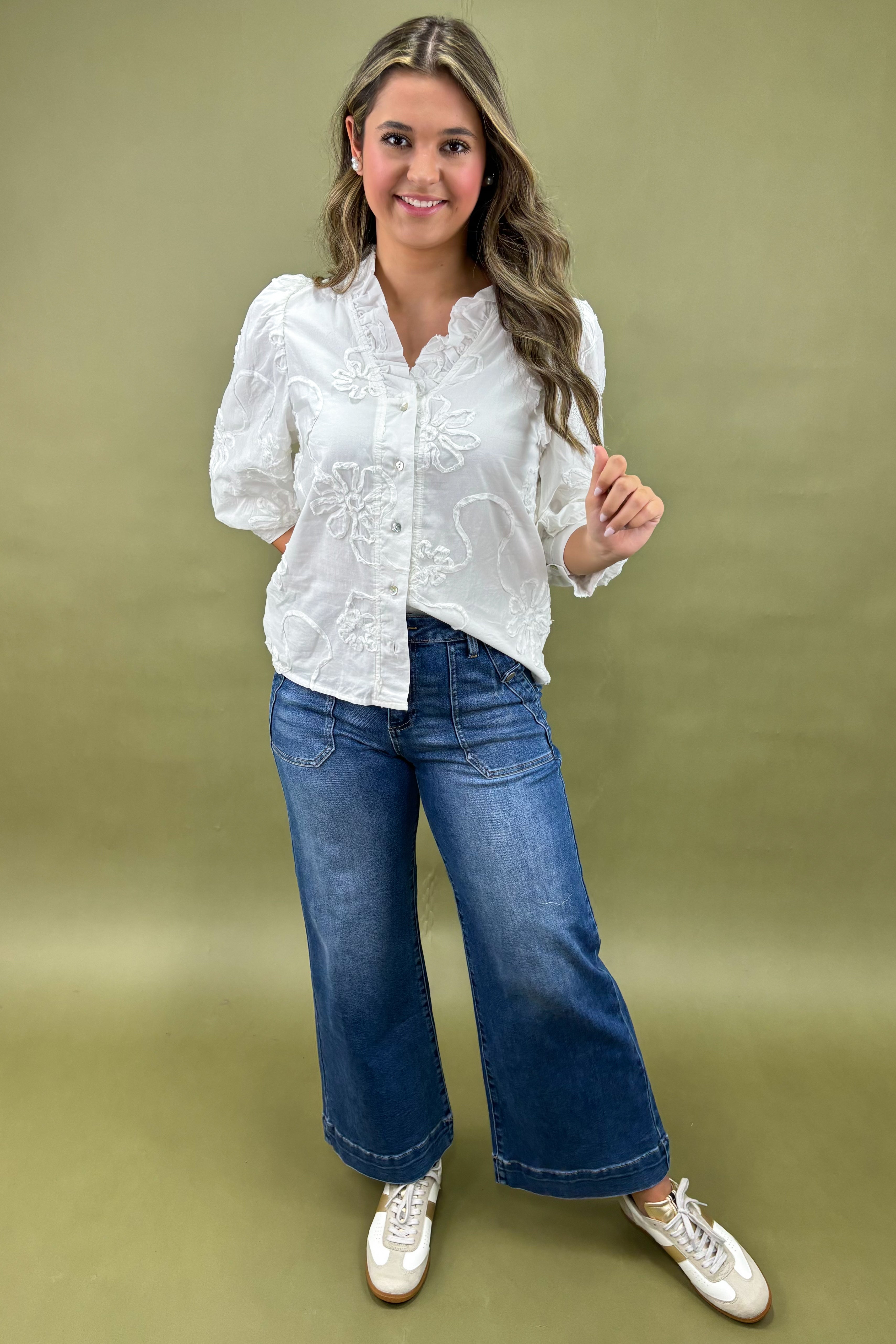 What makes this blouse truly stand out is its attention to detail. From the floral applique accents to the ruffled neckline that adds a whisper of vintage charm, every element feels intentional and thoughtfully designed. It’s the perfect balance between romantic and practical — you’ll look dressed up but feel completely at ease.