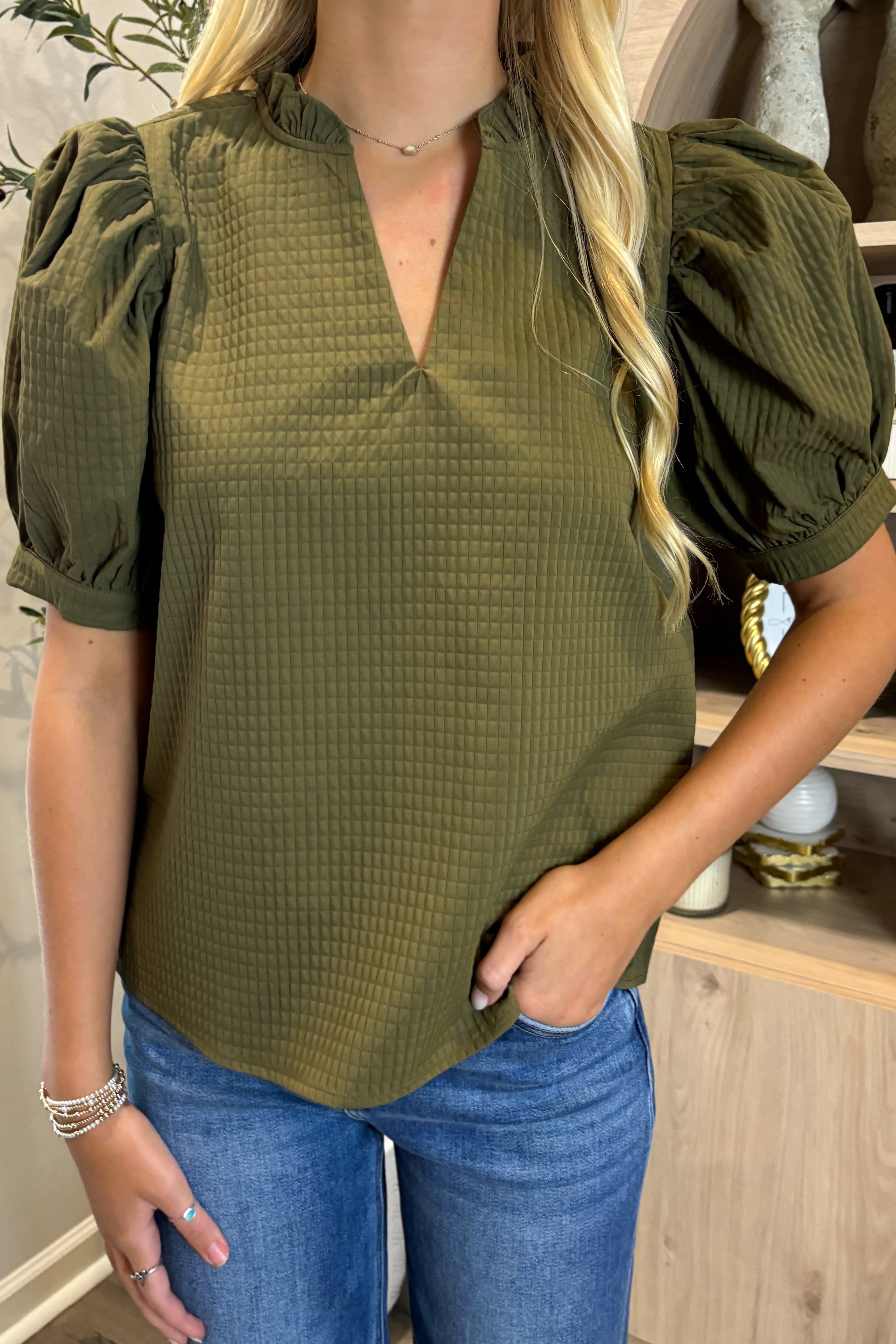 Elevate your everyday look with our new textured fabric puff sleeve top—a sophisticated twist on classic style. Featuring a subtle textured grid pattern, voluminous puff sleeves, and a modern notch neckline, this top blends effortless charm with a bold silhouette. Available in timeless black and earthy olive, it's your go-to for work, dinner dates, or that casual slay. From boardroom boss to brunch beauty—this top does it all.