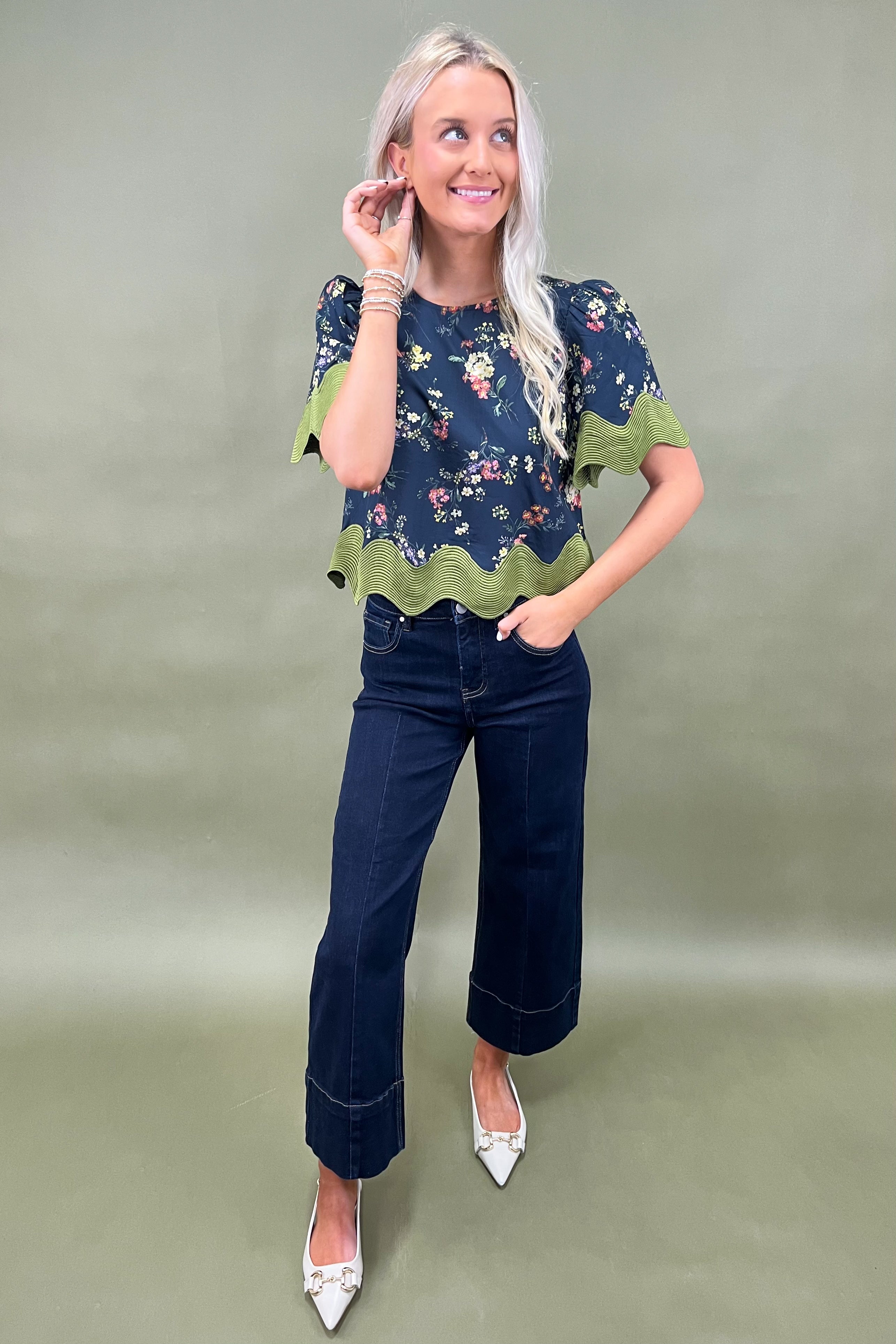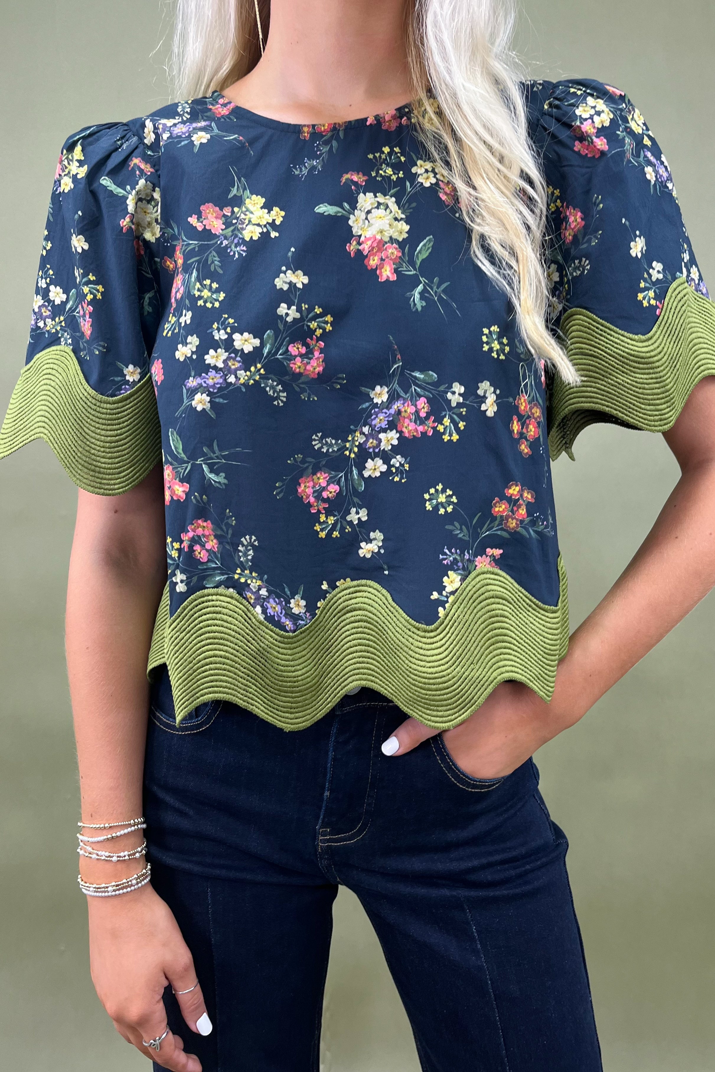 This isn’t your standard floral blouse. The Floral Fanfare Contrast Top has personality in spades. The garden-inspired print whispers romance, while the vivid green scallop trim shouts confidence. The balance of feminine florals and bold edges makes this top versatile—you can go soft and sweet one day, bold and daring the next.