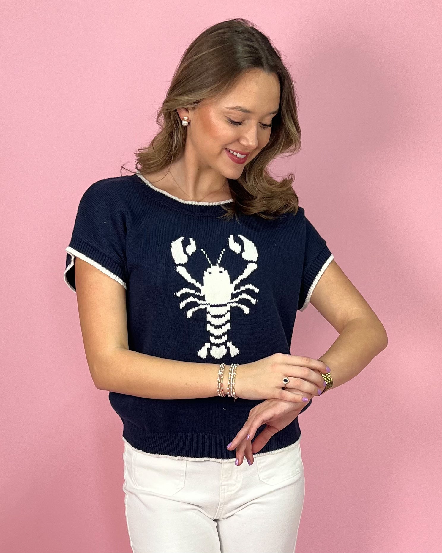 Coastal-inspired and effortlessly classic, this navy knit sweater top brings a playful seaside touch to your everyday wardrobe. The bold ivory lobster graphic adds a statement detail, while the contrast trim keeps the look crisp and polished.
