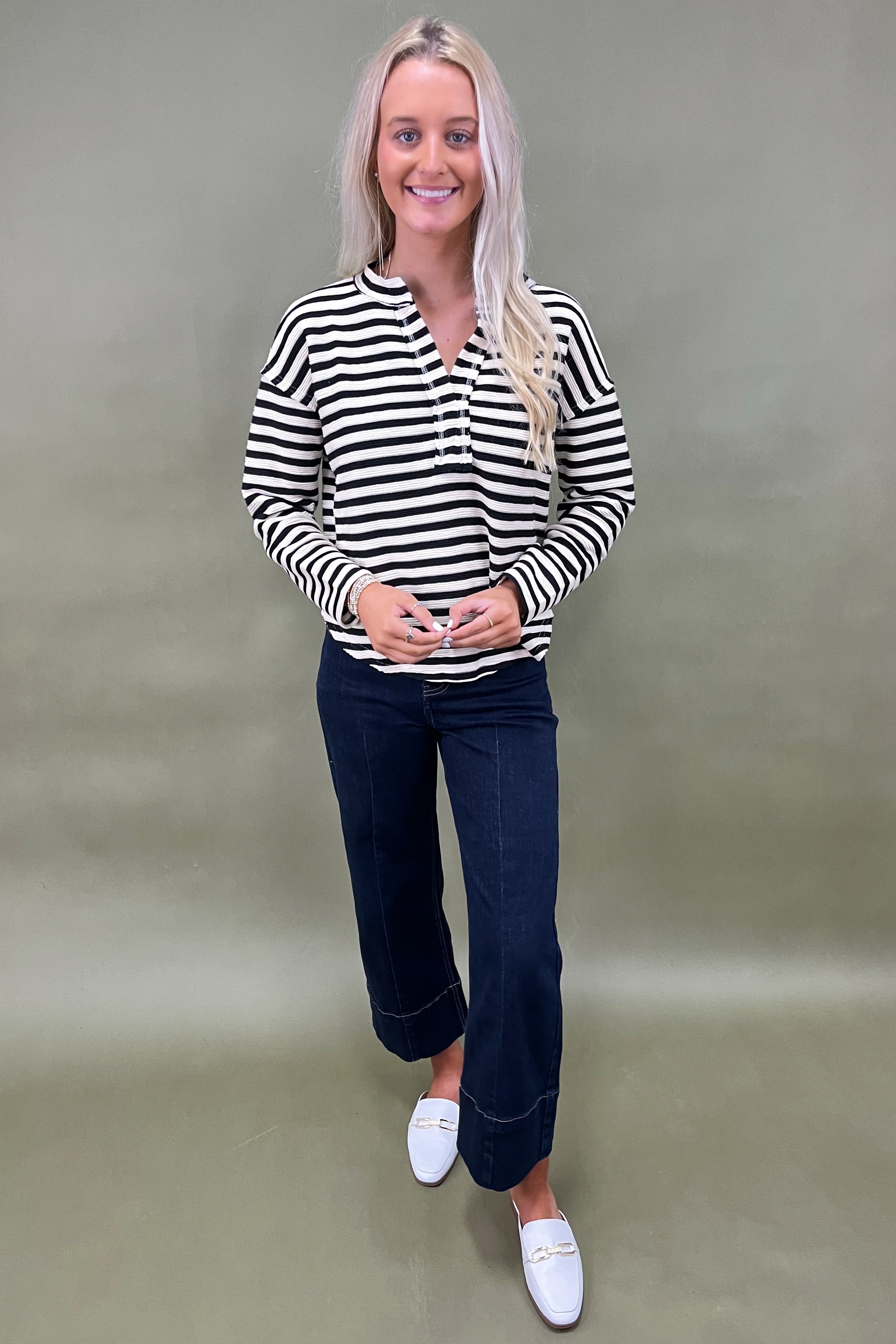 This is the kind of top you’ll reach for when you want easy but cute. From dockside strolls to brunch with the girls, or even just layering under your favorite chunky sweater when the temps drop, the Harbor Breeze Striped Henley is your go-to all-season piece.