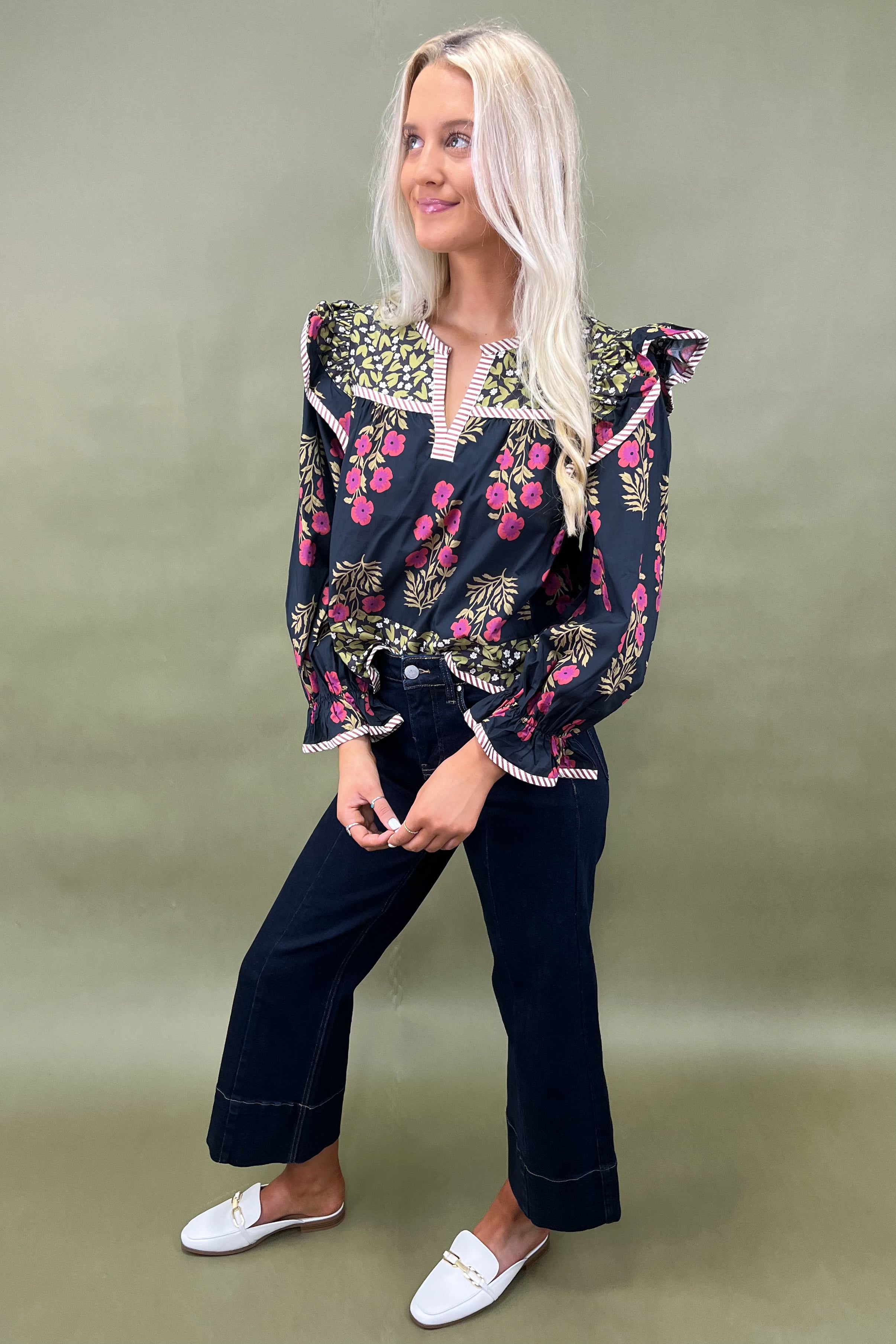 Some pieces just have main character energy—and our Meadow At Midnight Floral Top is one of them. 🌌✨ With its lush floral motifs blooming across a dramatic black backdrop, this top feels like a starlit meadow, full of mystery, beauty, and timeless elegance. The vibrant pink florals pop against the inky background, while leafy olive greens and soft golden accents add warmth and balance. It’s bold but still feminine, the perfect mix for anyone ready to turn heads.