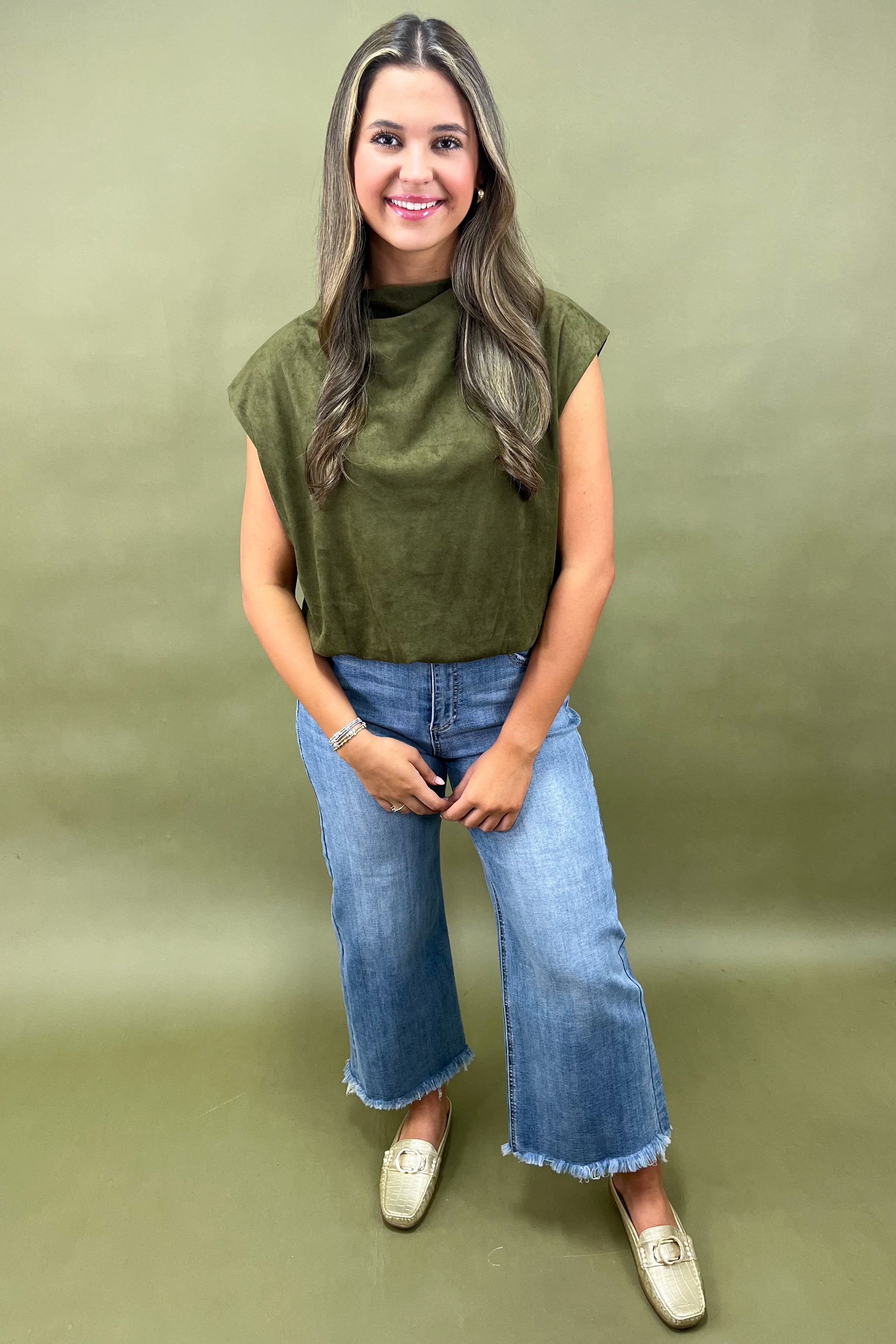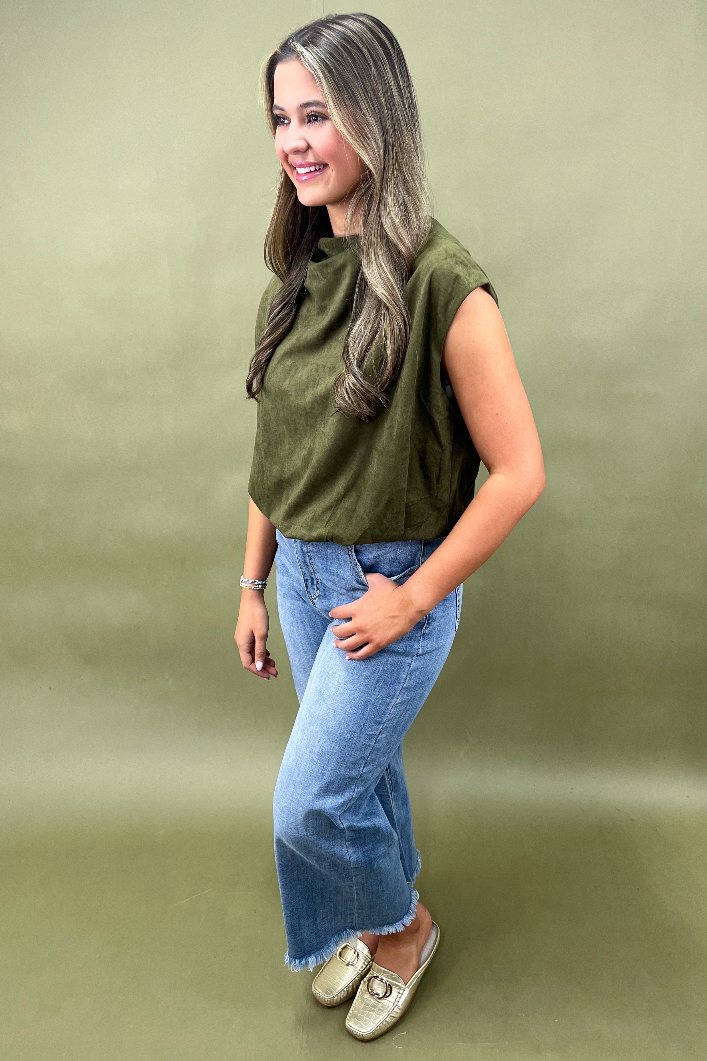 The little green top just stole the spotlight. Meet the Olive Aura Mock Neck—a chic, suede-like stunner with just the right amount of drama. From the sleek mock neckline to the modern balloon bottom hem, this top strikes the perfect balance between polish and playfulness. It’s the piece that instantly makes denim feel intentional and transforms a simple skirt into a full fashion moment. 🌿✨