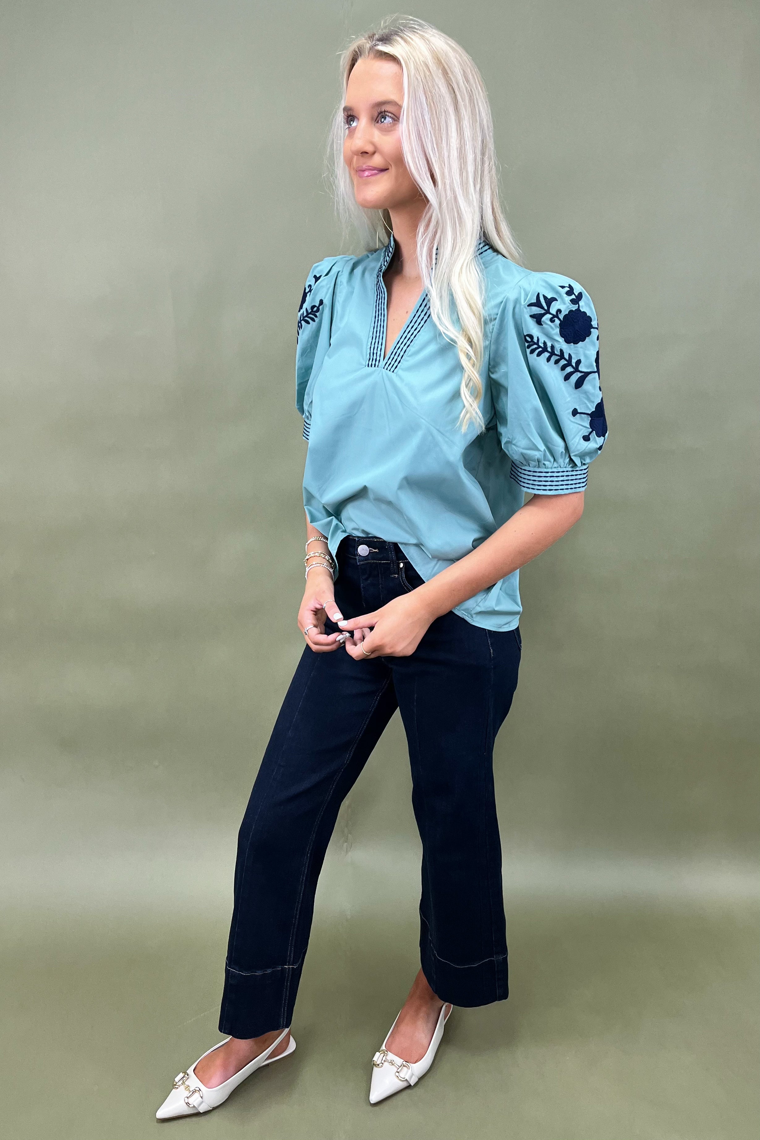 Let’s swoon over the details for a sec. The sleeves? Puff perfection. Voluminous but not over-the-top, they bring that extra dose of drama that makes even a pair of jeans look dressed up. Add in the navy embroidery climbing down each sleeve, and suddenly you’ve got a top that feels like it was handmade just for you. And then there’s the neckline — a chic split-V framed with stitched detailing that adds polish and structure. Who needs heavy jewelry when the neckline is already this good?