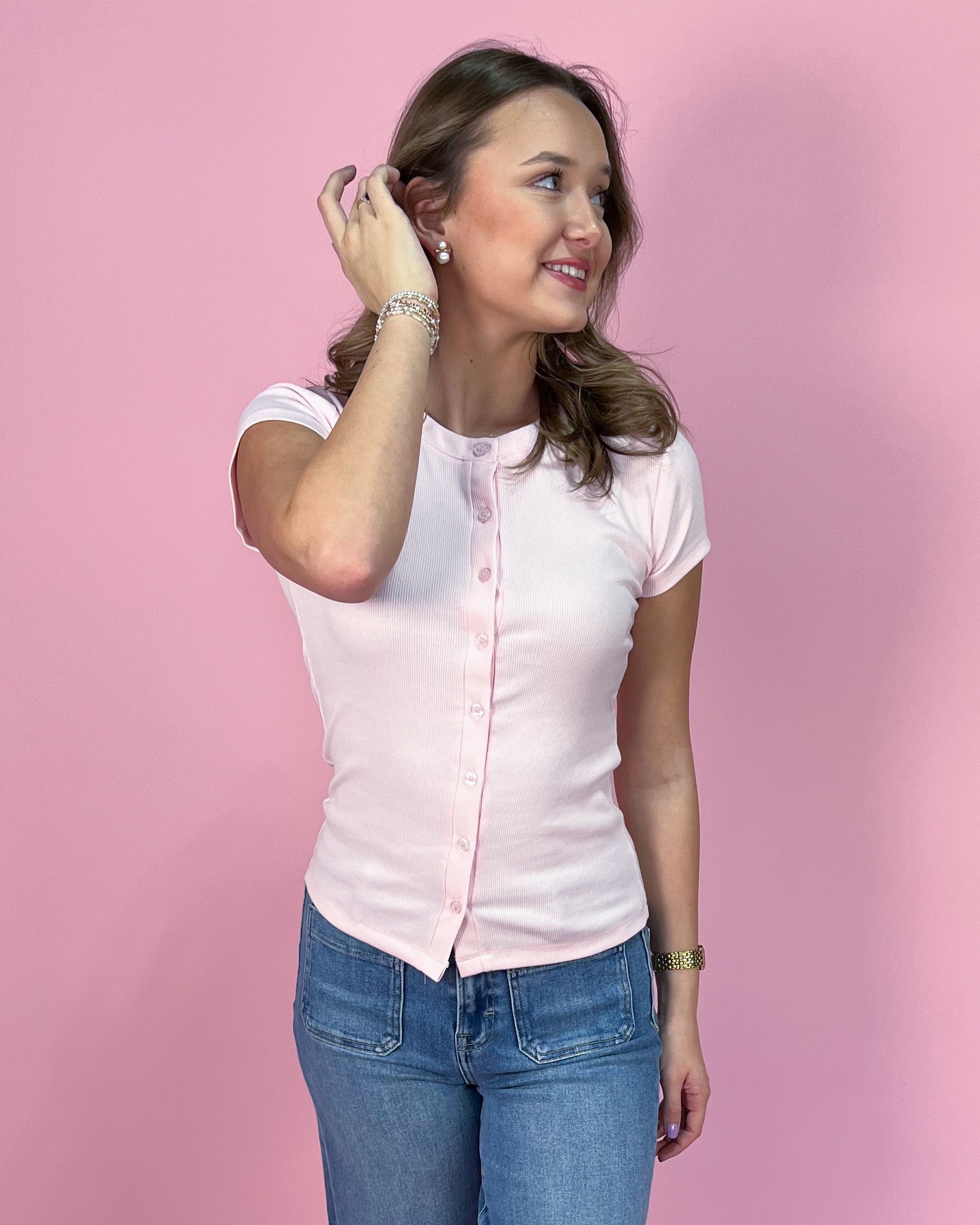 Made from a stretchy ribbed cotton blend, it hugs comfortably without feeling tight. The full button-front detail adds a subtle vintage touch, while the short sleeves and slightly cropped length make it perfect for pairing with high-waisted denim, skirts, or lounge bottoms.