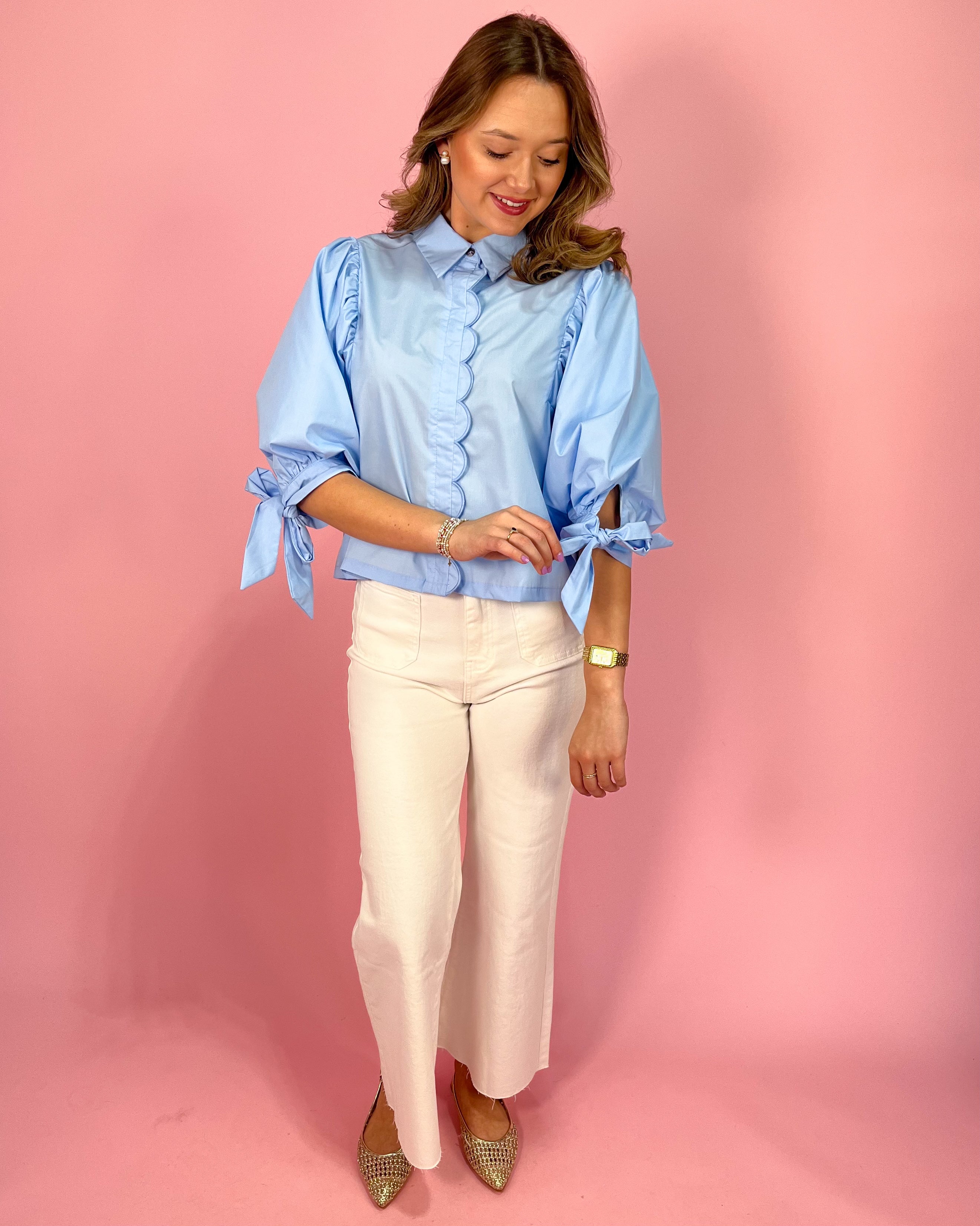 Soft structure meets statement sleeves in this dreamy powder blue blouse. Designed with a tailored collar and a scalloped front placket, this top gives classic sophistication with a feminine twist. The subtle sheen in the fabric elevates the look, making it perfect for dressing up your everyday denim or pairing with crisp white bottoms for a polished moment.
