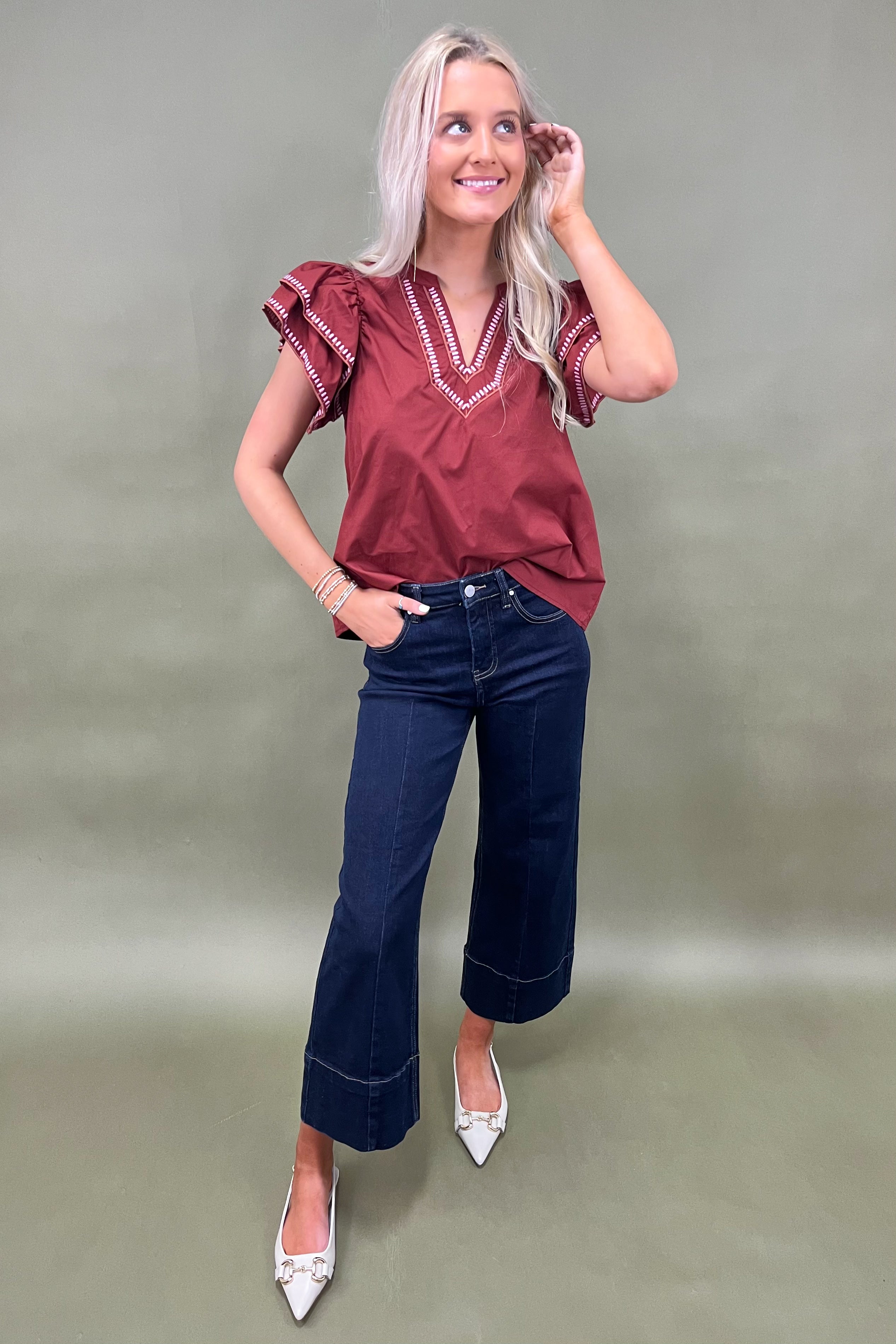 Ready to make every golden hour moment even more magical? Meet the Sunset Stroll Flutter Sleeve Top—the blouse that perfectly balances relaxed charm with standout details. With its rich rust-red hue, whimsical embroidery, and sweetly puffed flutter sleeves, this top was made for twirling through farmer’s markets, sipping sangria on a patio, or catching that perfect sunset selfie. ✨🌸