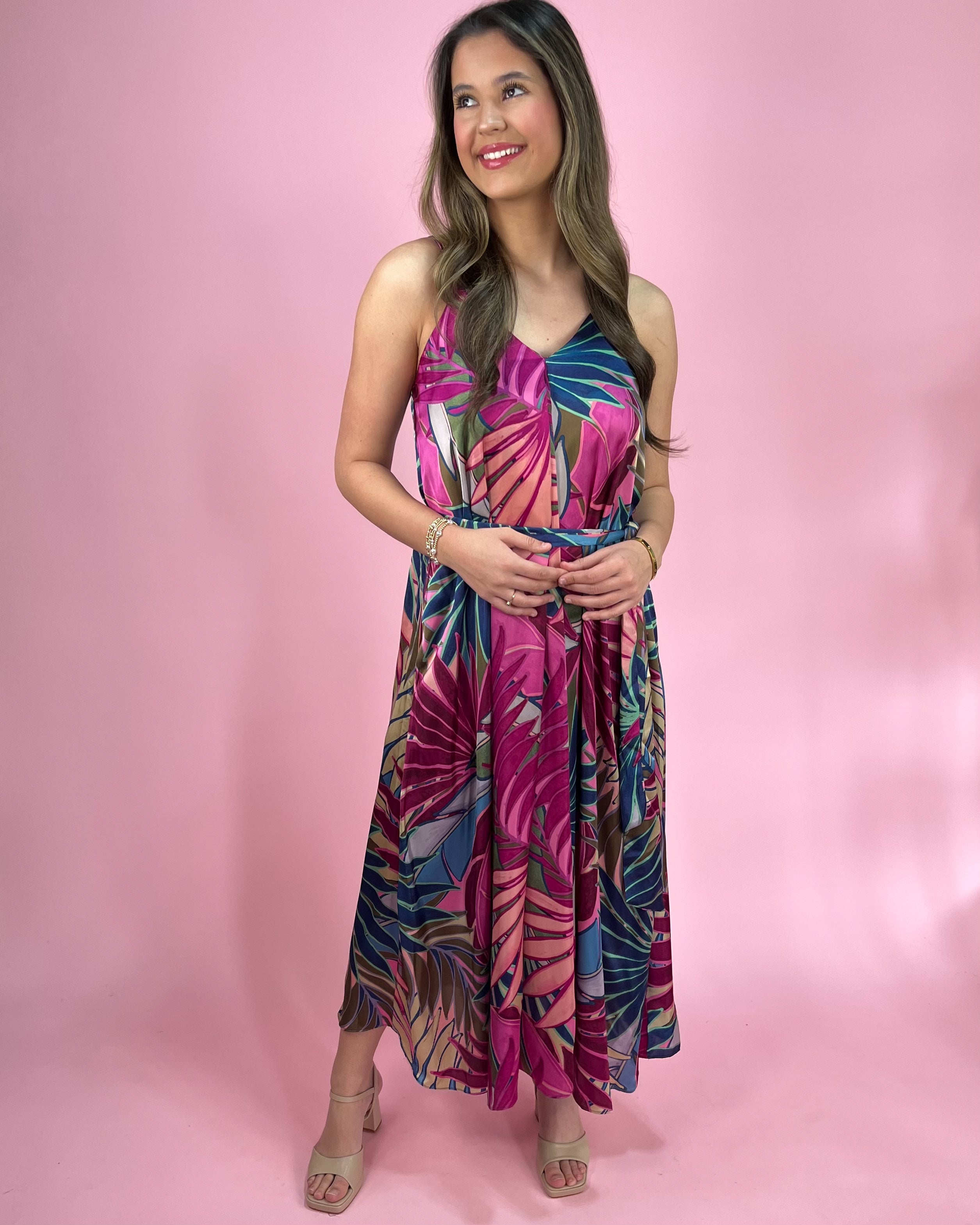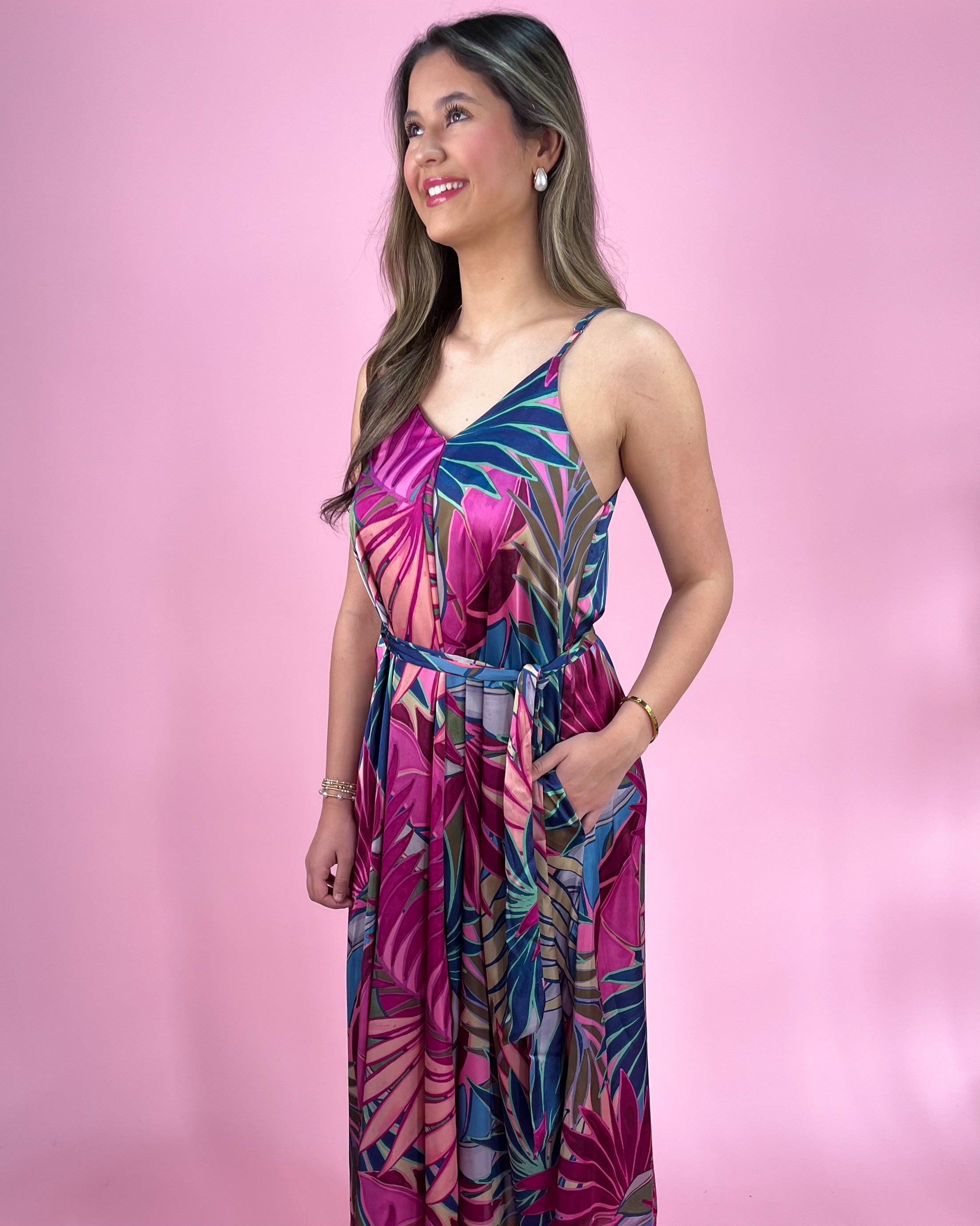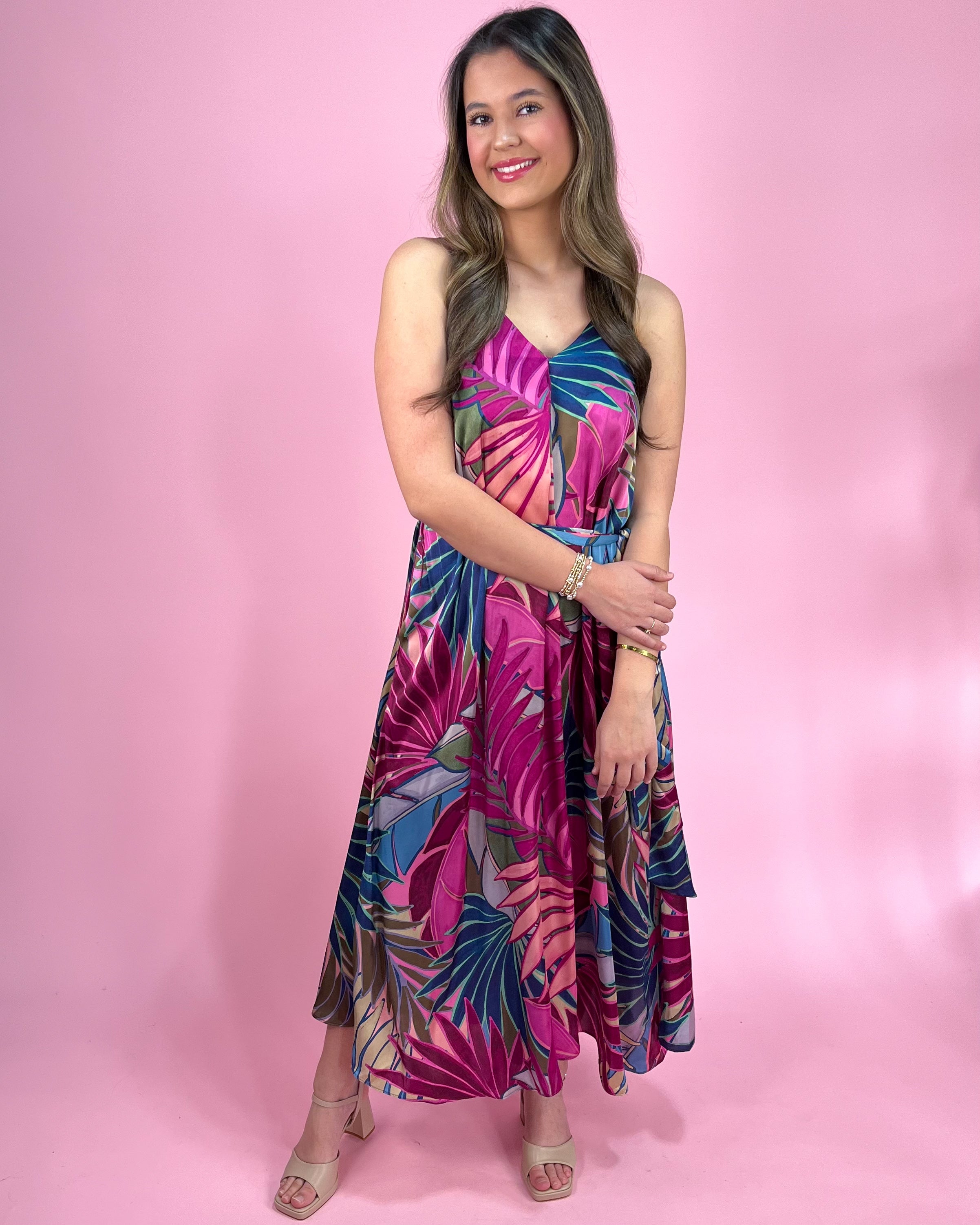 A bold tropical dream in the prettiest shades of magenta, green, and blue — this maxi dress is made for vacations, summer weddings, and every sunny moment in between. The vibrant palm print brings instant getaway energy, while the flowy silhouette keeps it effortlessly elegant.
