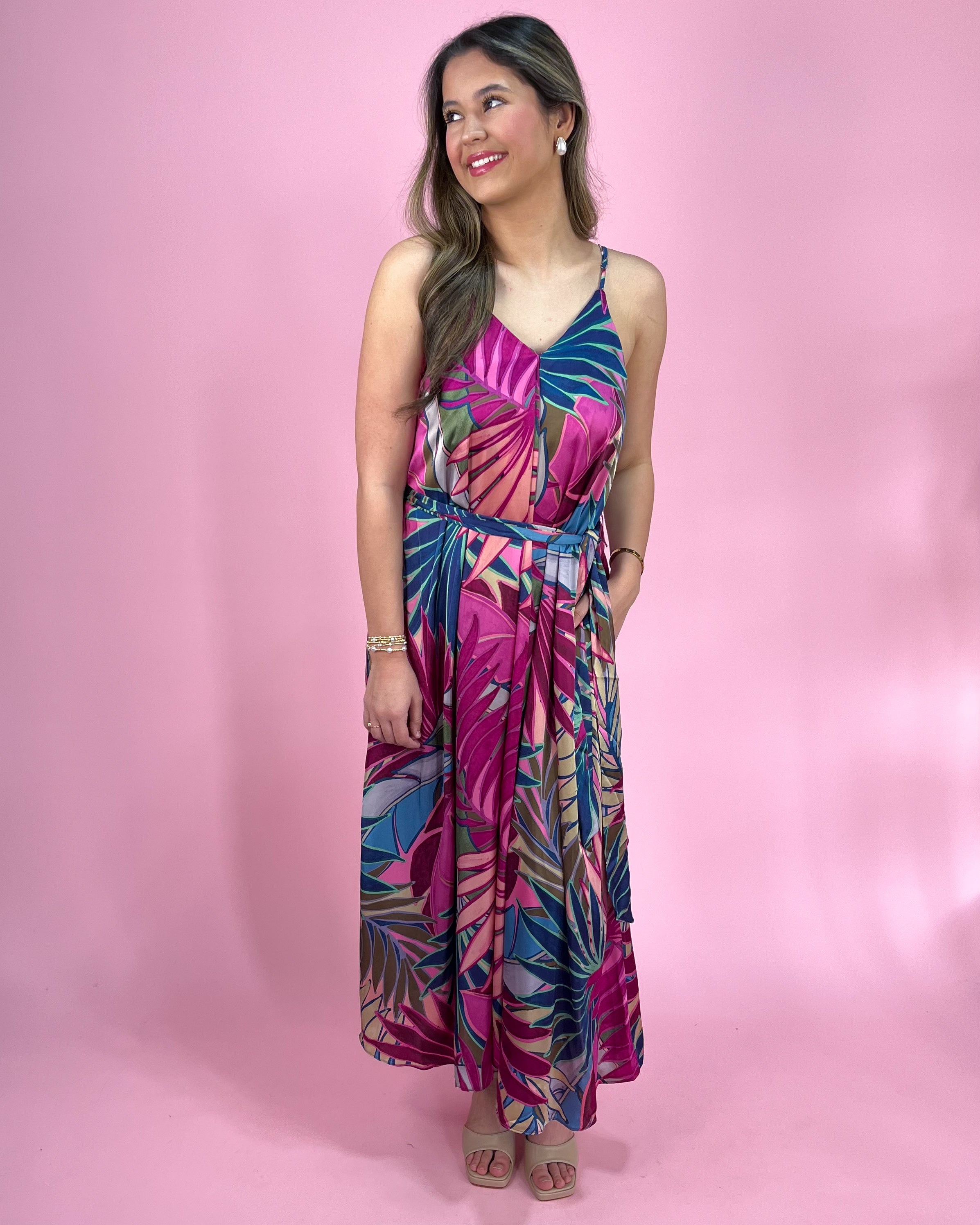 Tropical Magenta Palm Print Belted Maxi Dress