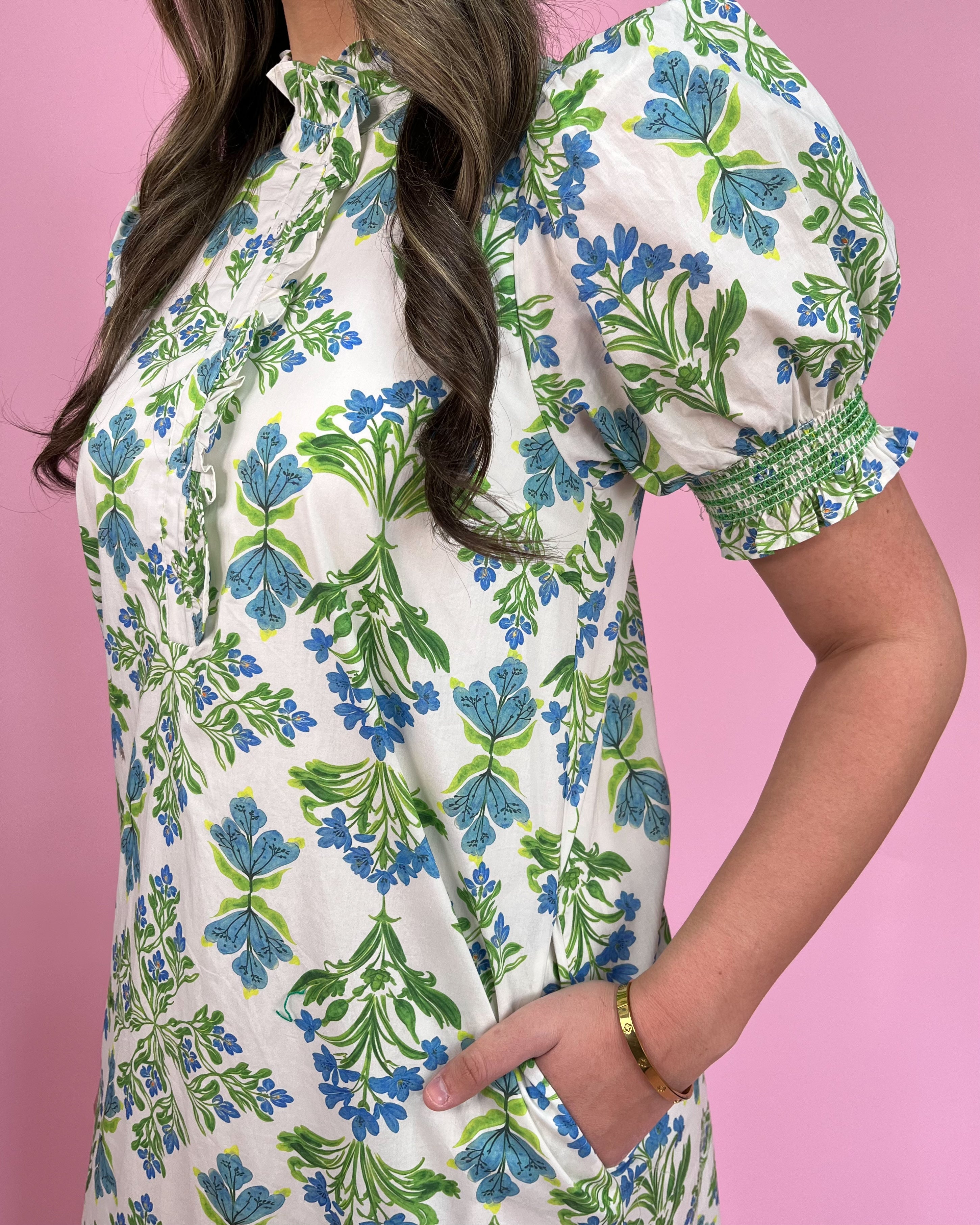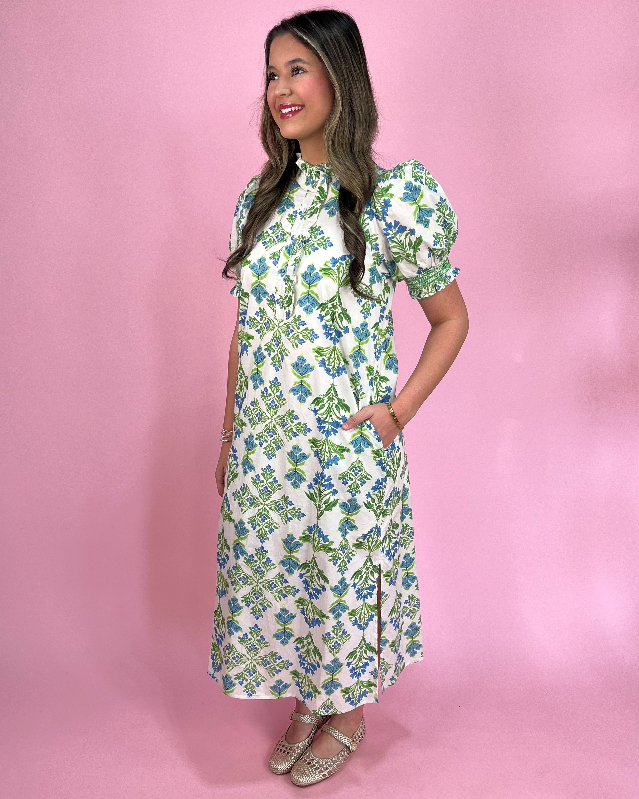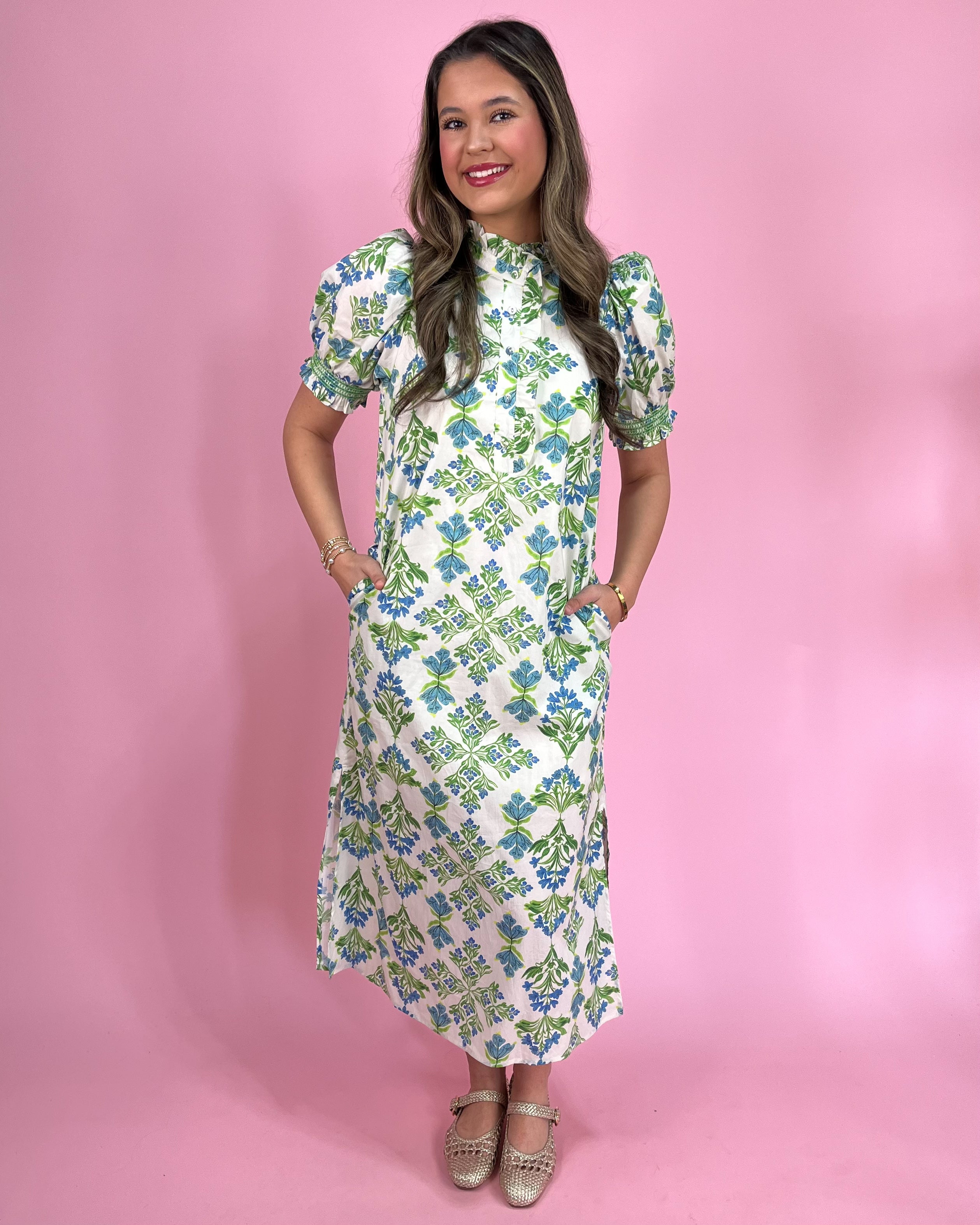 Featuring a soft ivory base with vibrant blue blossoms and leafy green accents, this dress feels like a walk through a blooming garden. The puff sleeves add the sweetest touch of volume, while the relaxed maxi silhouette keeps it easy, flowy, and flattering. 🌿✨