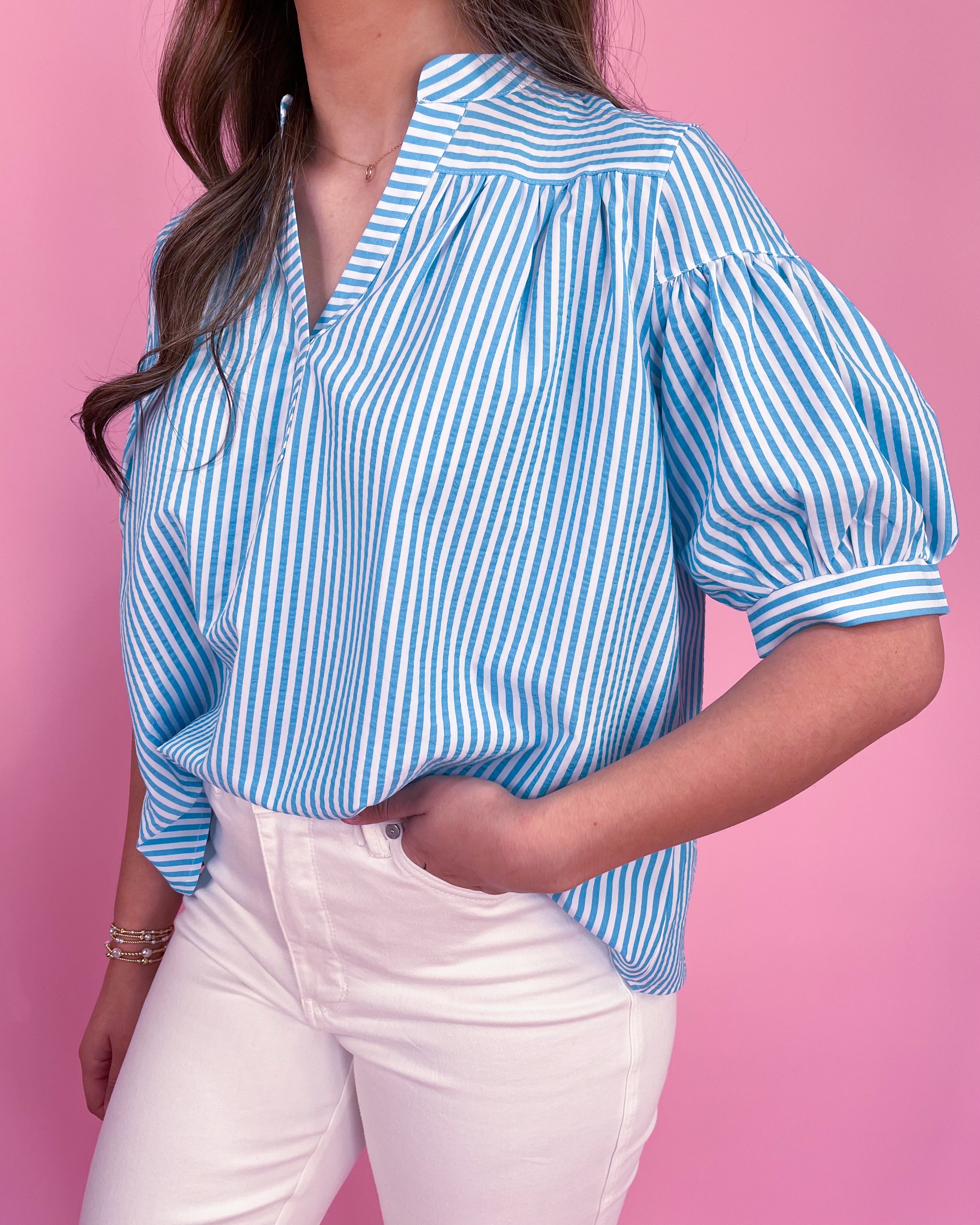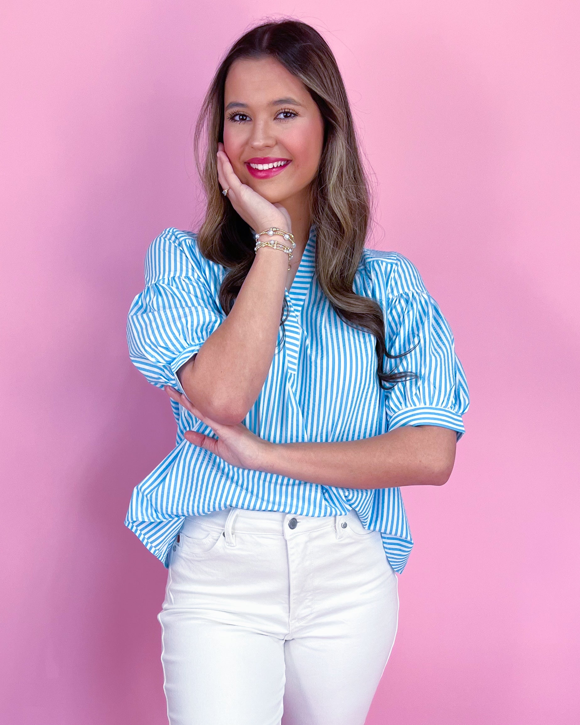 Bright, breezy, and giving total coastal cutie vibes 😍🏝️ This striped beauty is the definition of “throw on & look instantly put together” — with the prettiest pop of turquoise that feels like vacation in a top ✨