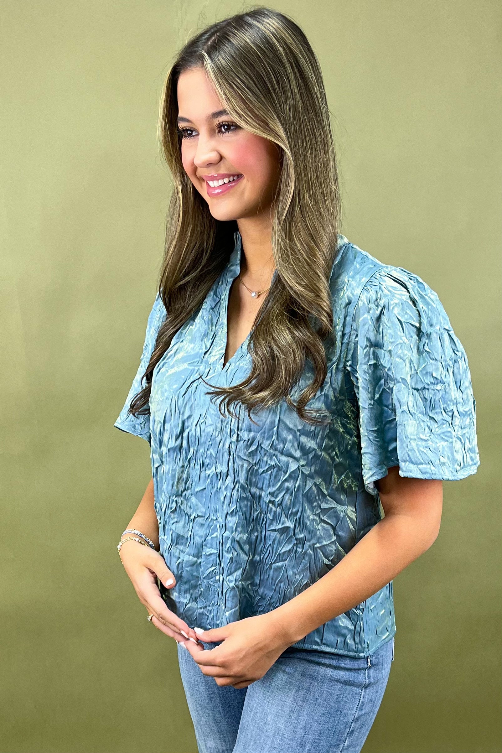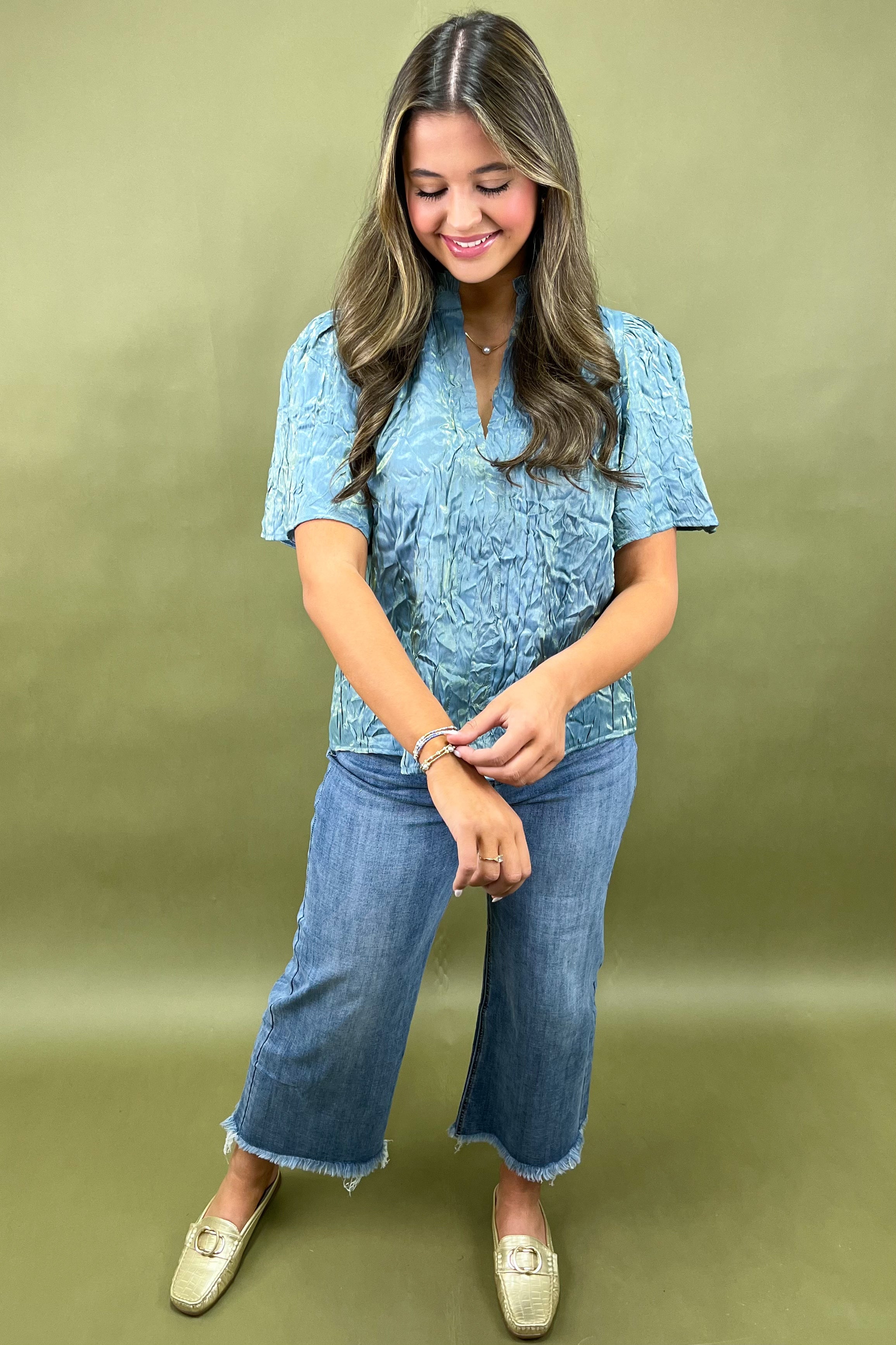 The mock neckline and split-V detail keep things refined and modern, while the puffed short sleeves add a touch of feminine drama (without being over the top). Whether youâre dressing it up with tailored pants or tucking it into your favorite jeans, the Celestial Chic Textured Top adds an instant glow-up to your outfit rotation.