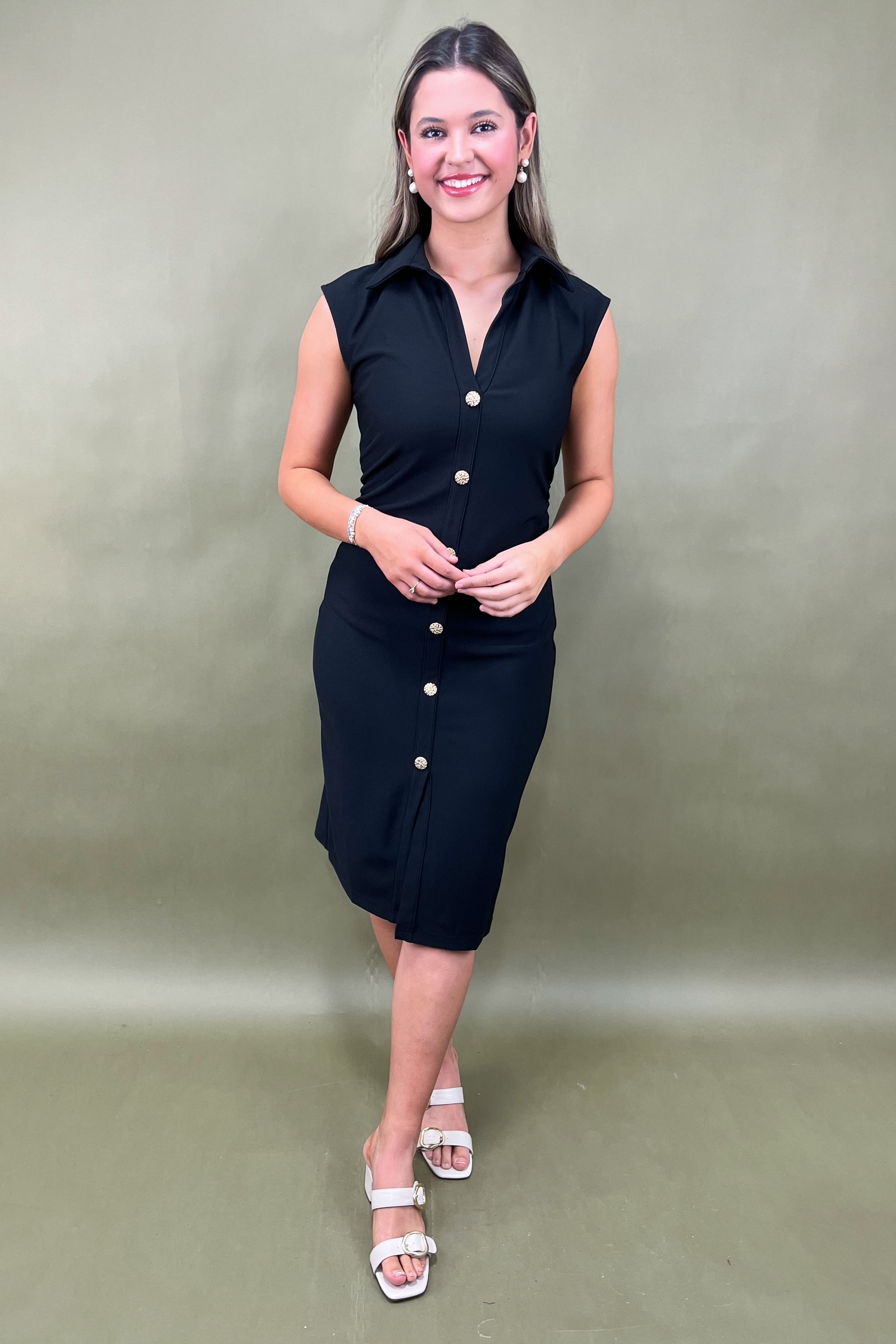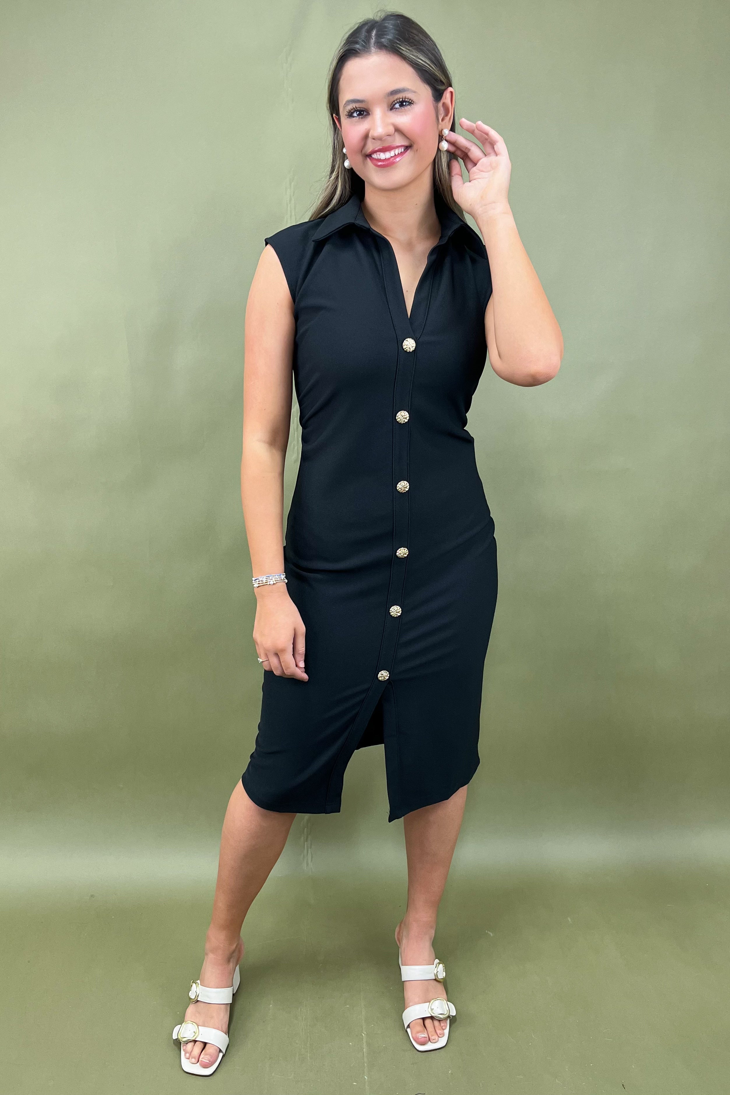 The Chic On Repeat Collared Midi Dress is made from a smooth, soft 96% polyester and 4% spandex blend — offering breathable comfort and subtle stretch. The unlined construction keeps it light and breezy, perfect for layering or wearing solo. The collared neckline and gold button front create a refined silhouette that’s both structured and feminine.