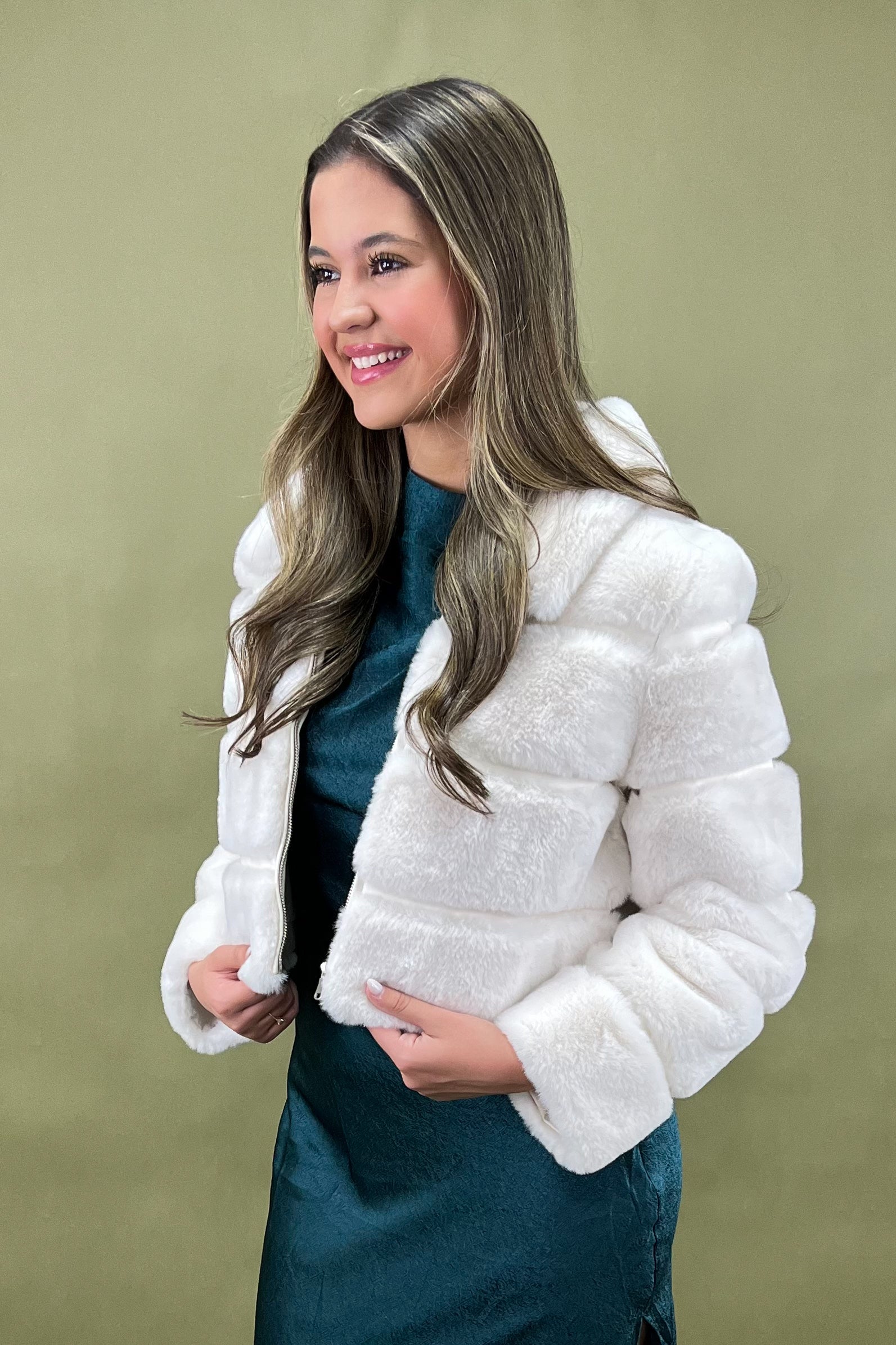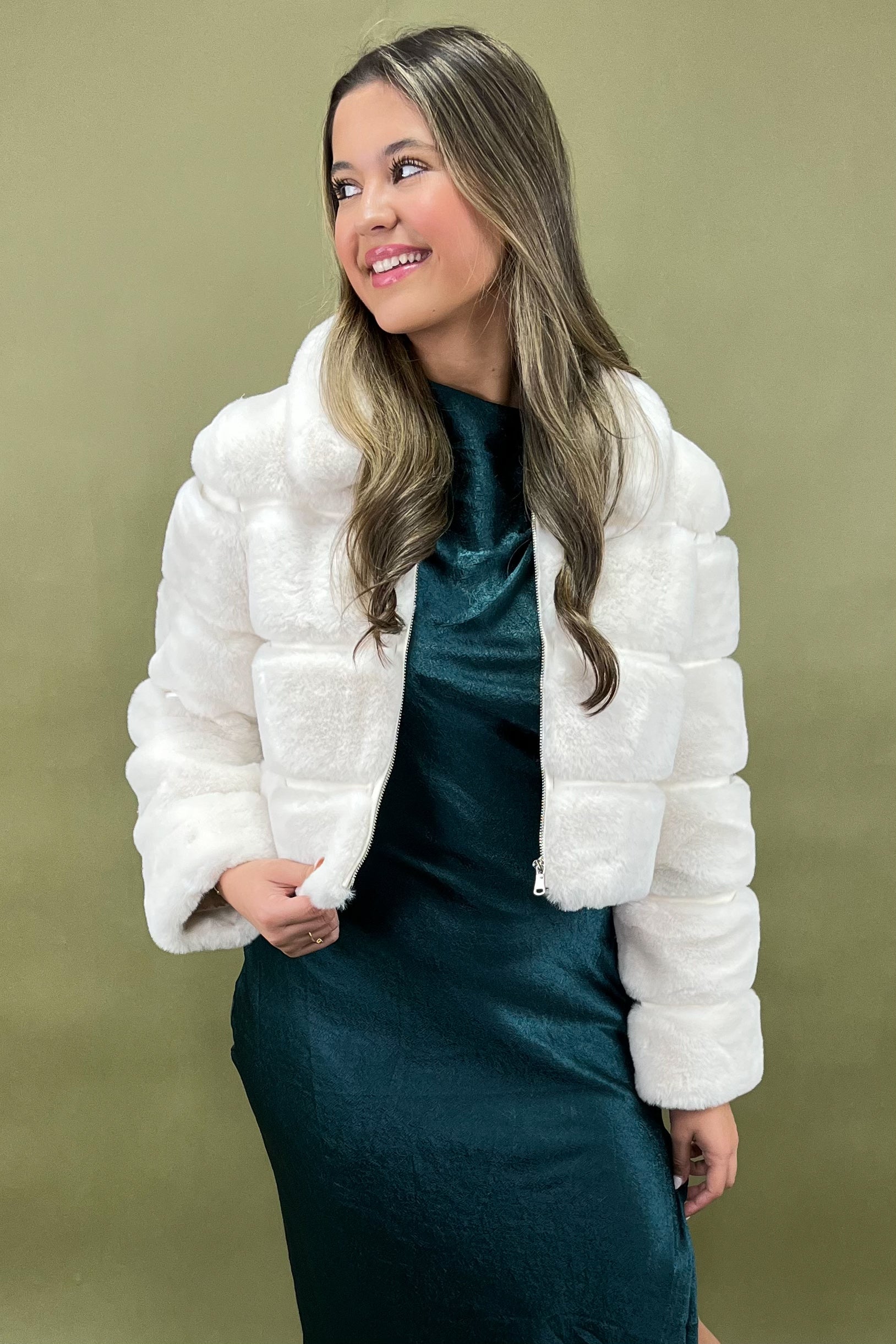 Cold-weather glam has never felt this cozy! ❄️ The Chilly Days Snuggles Jacket wraps you in plush faux fur softness with a luxe, winter-ready vibe that instantly elevates any look. Its creamy white hue gives it that timeless, elegant charm while keeping things fun and trendy. Whether you’re off to brunch, a night out, or just strolling through town, this piece brings the perfect mix of snuggle + style. 🤍