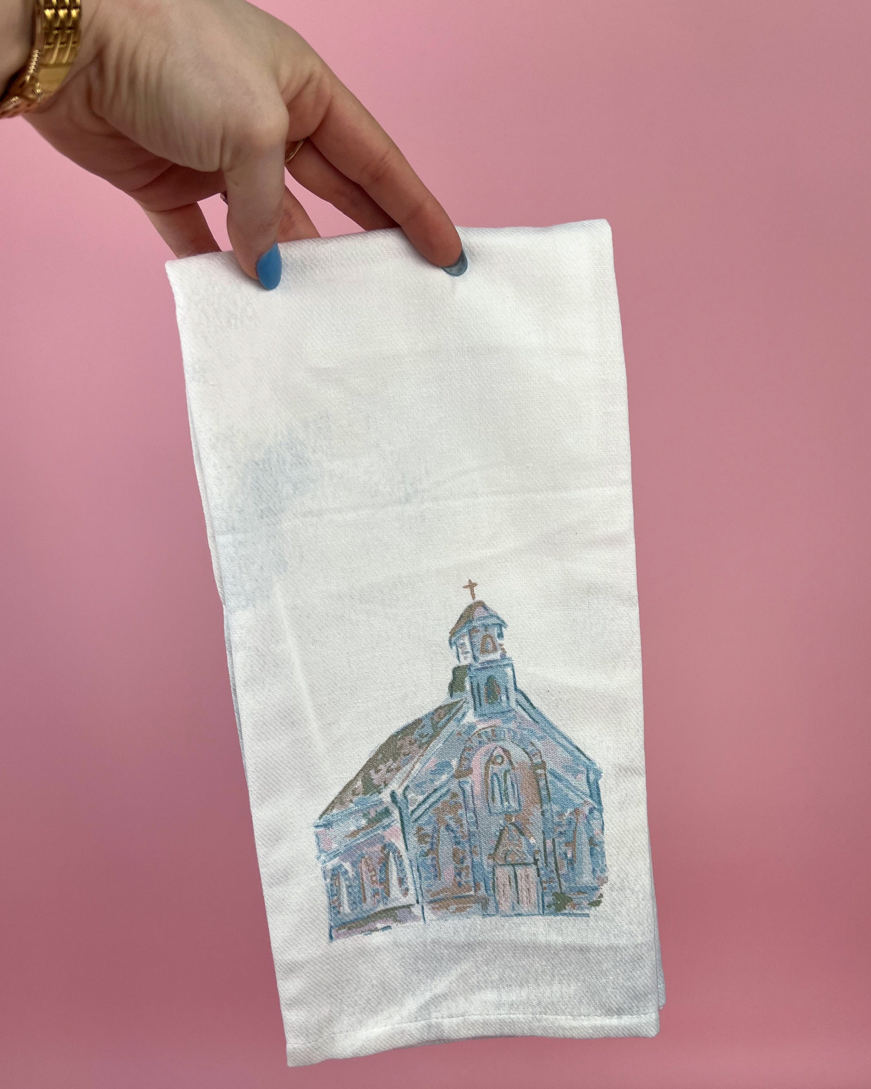 Soft white hand towel featuring a delicate watercolor-style Cornerstone Church illustration