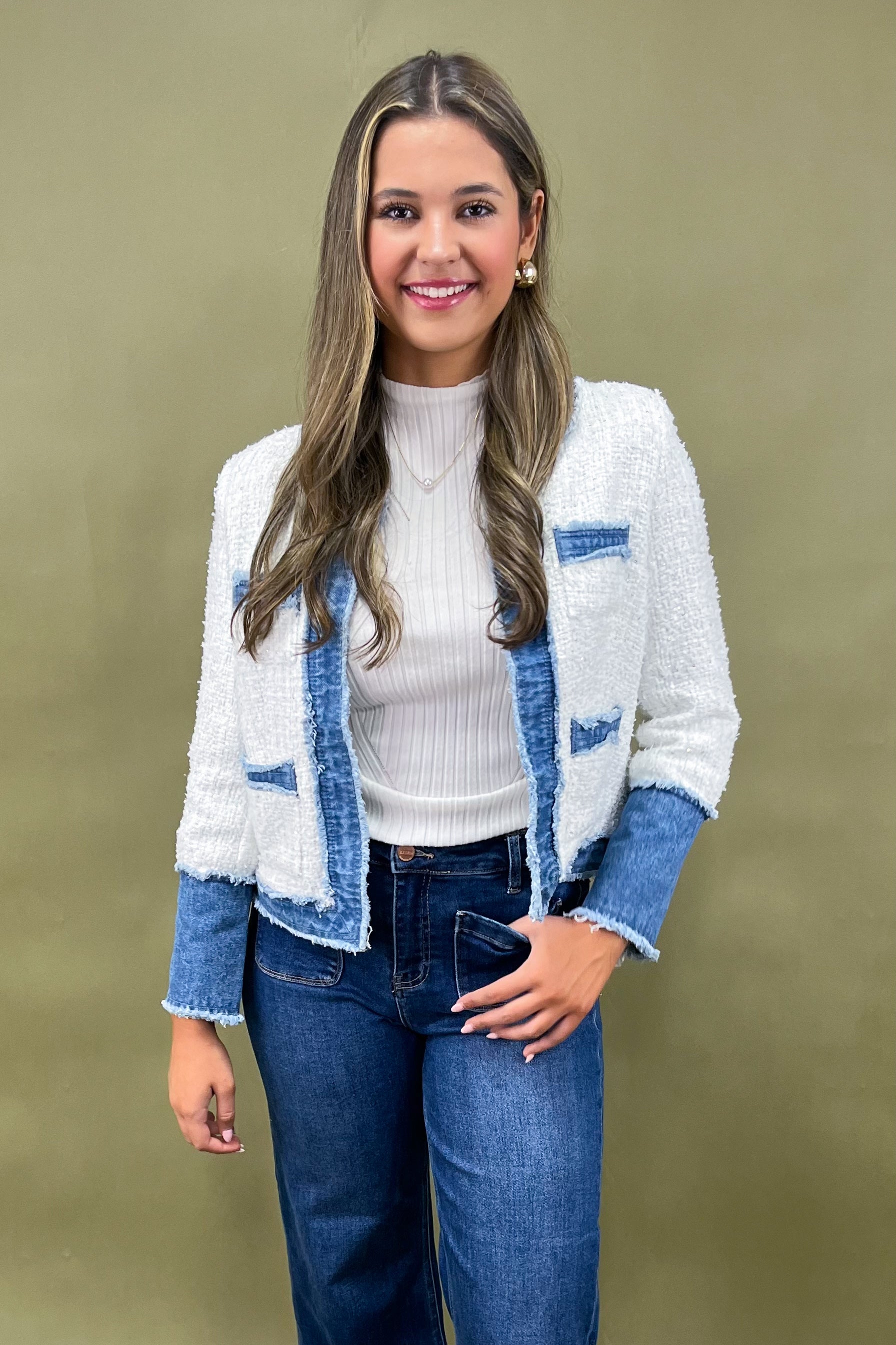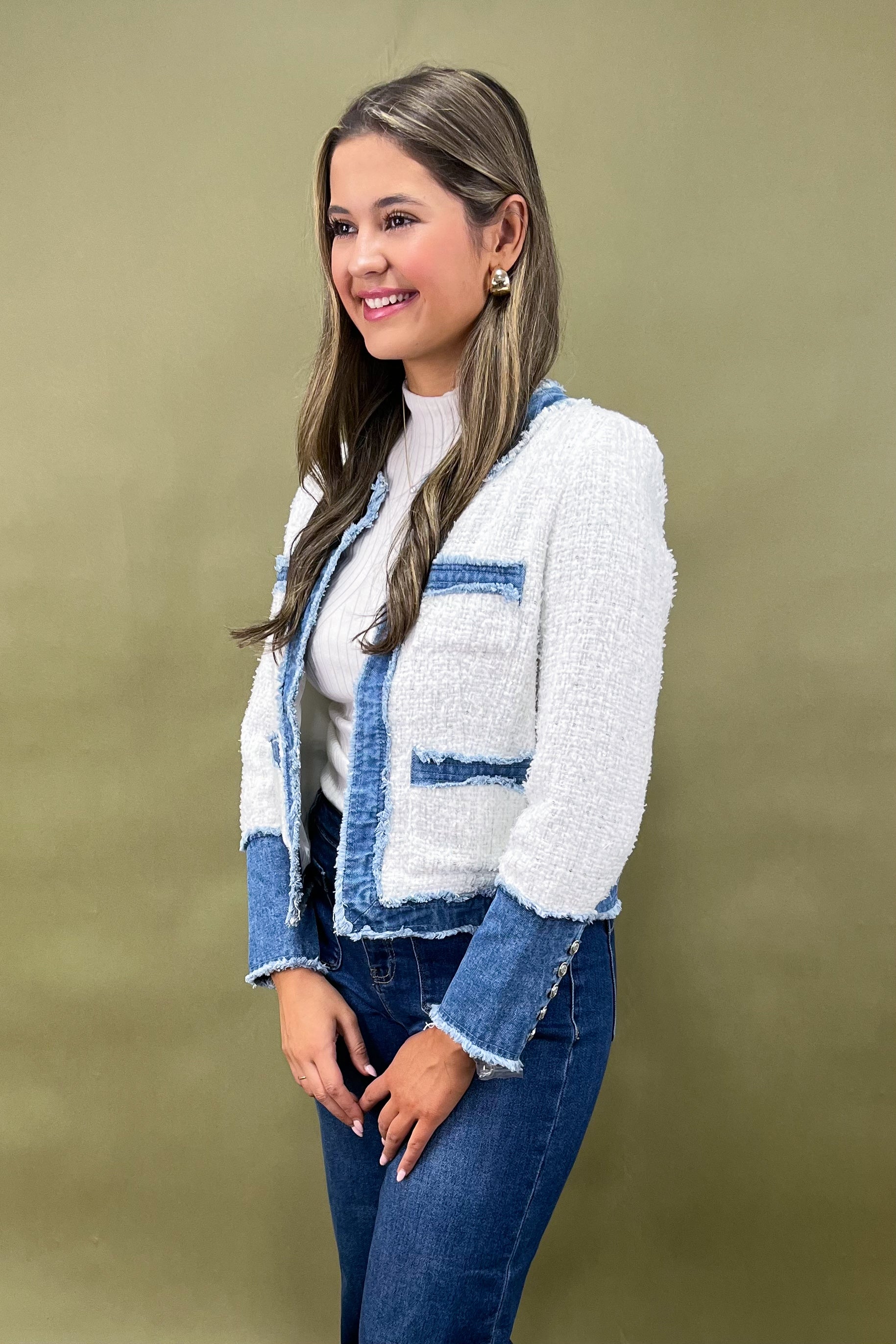 Some jackets are just meant to steal the spotlight—and our Denim Darling Open-Front Jacket does it effortlessly. Chic, polished, and sprinkled with playful edge, this beauty is here to upgrade your everyday looks with just one slip on. Think: timeless tweed meets casual denim—basically, a match made in style heaven. 🌟