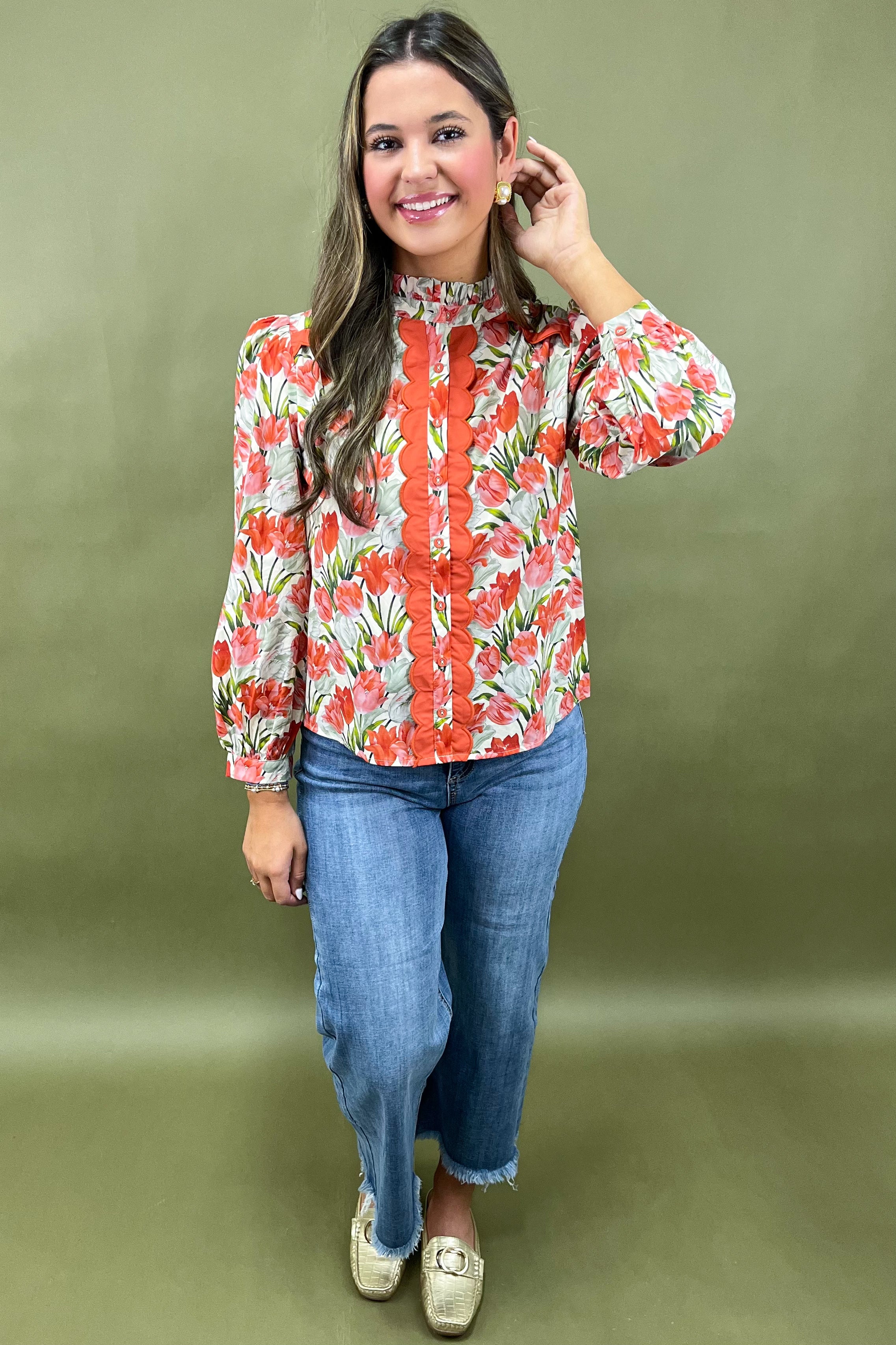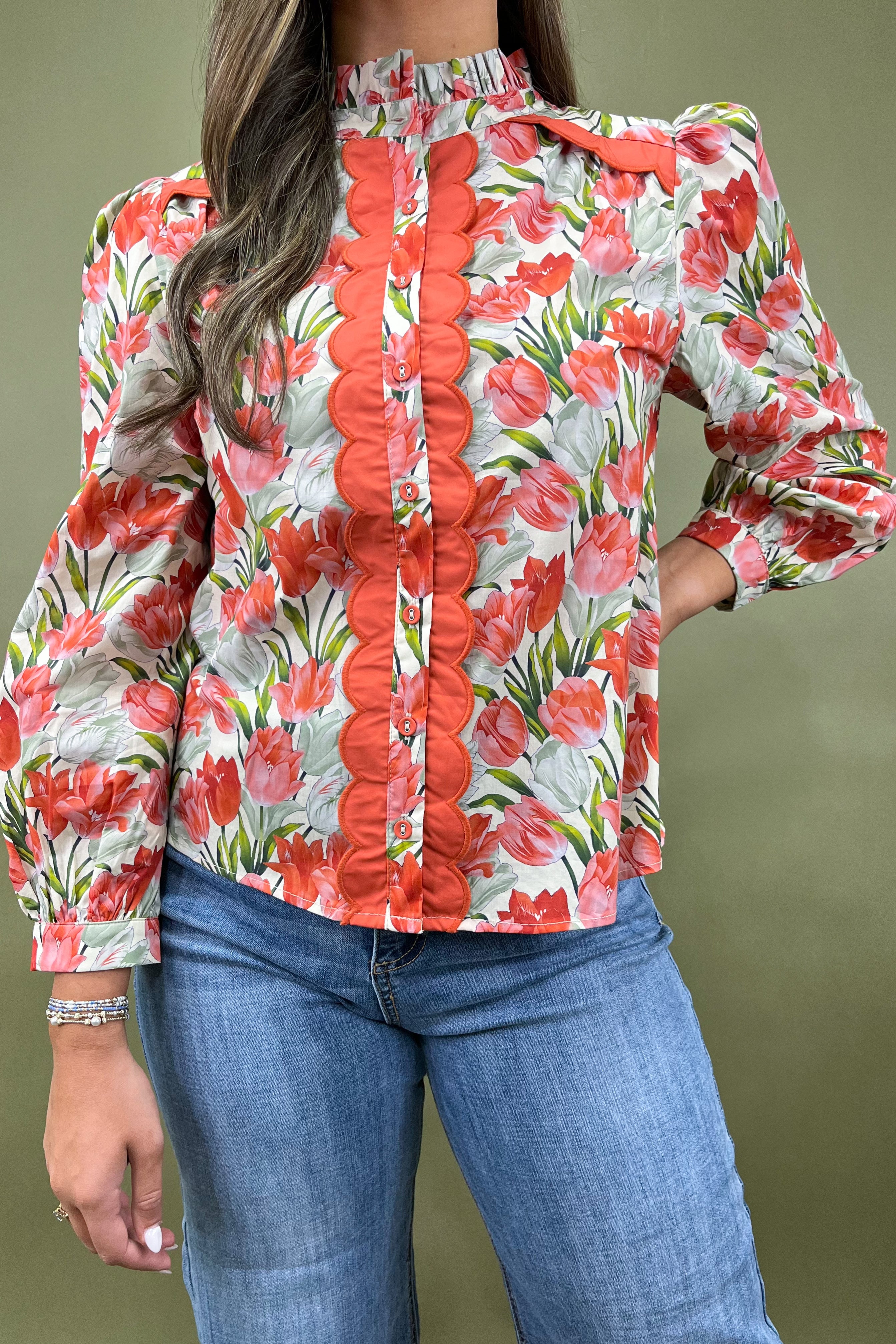 The ruffled mock neckline brings in that feminine flair you adore, framing your face beautifully (especially when paired with gold hoops or dainty drops âš). Down the center, the button-front placket with its scalloped coral panels is an absolute showstopper â eye-catching and unique, giving this top a statement feel without being over the top.