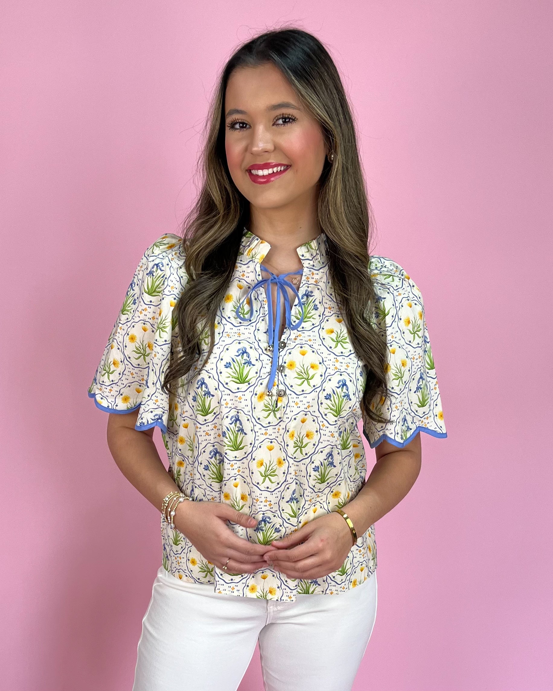 We’re obsessed with the scalloped sleeve detail 💙 and the sweet tie-front neckline 🎀—it adds just the right amount of personality without feeling overdone. Easy, relaxed, and so cute tucked or worn loose ✨