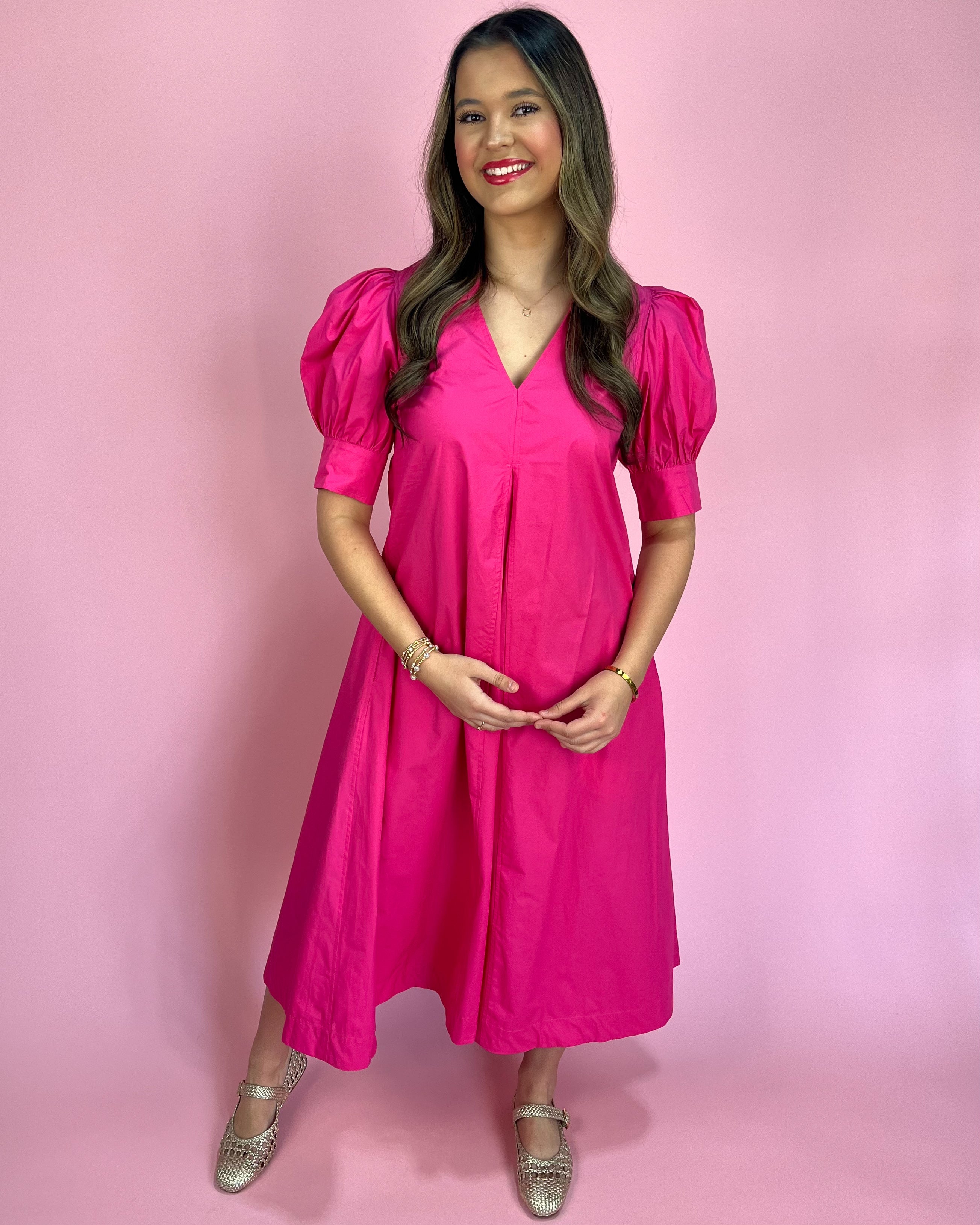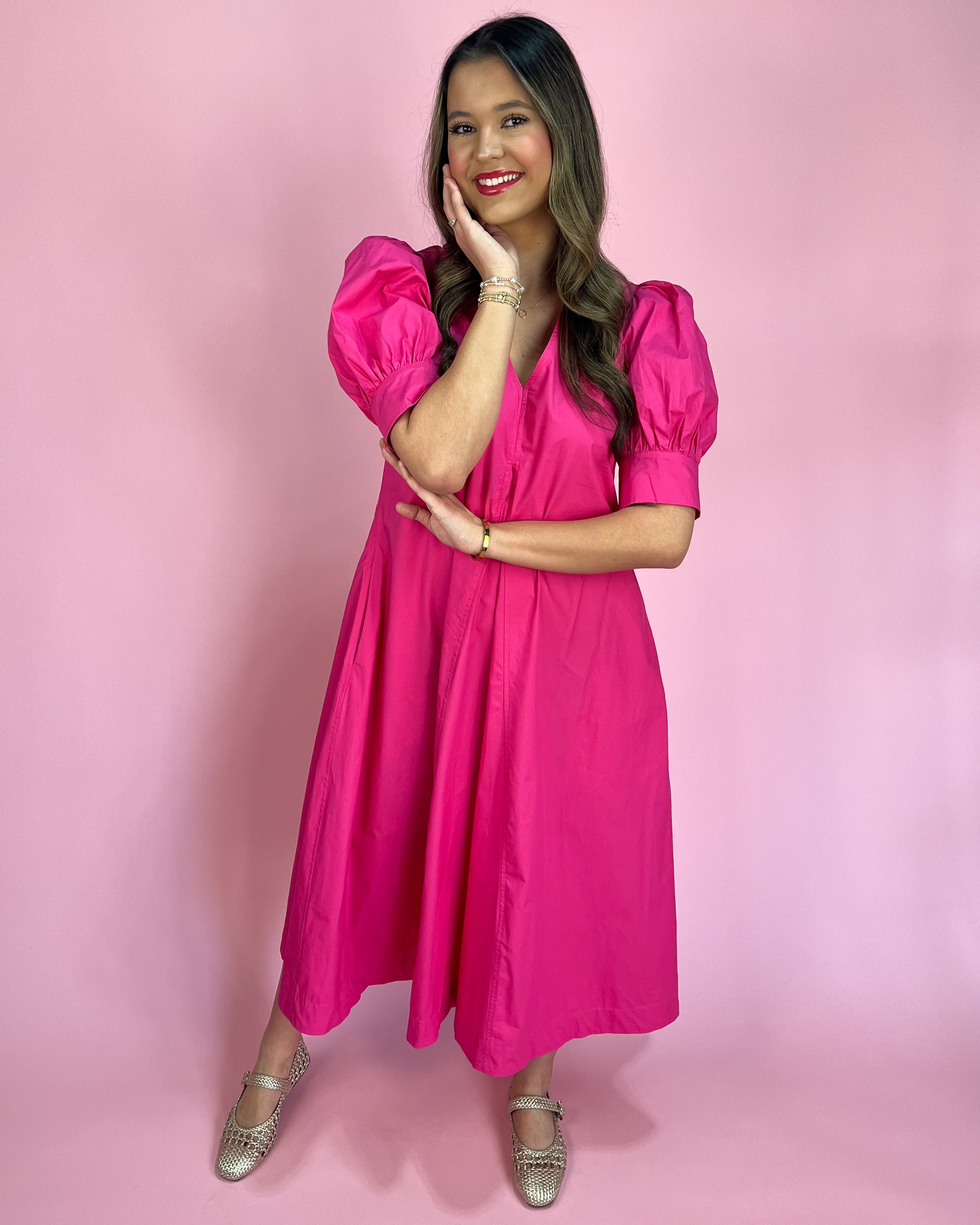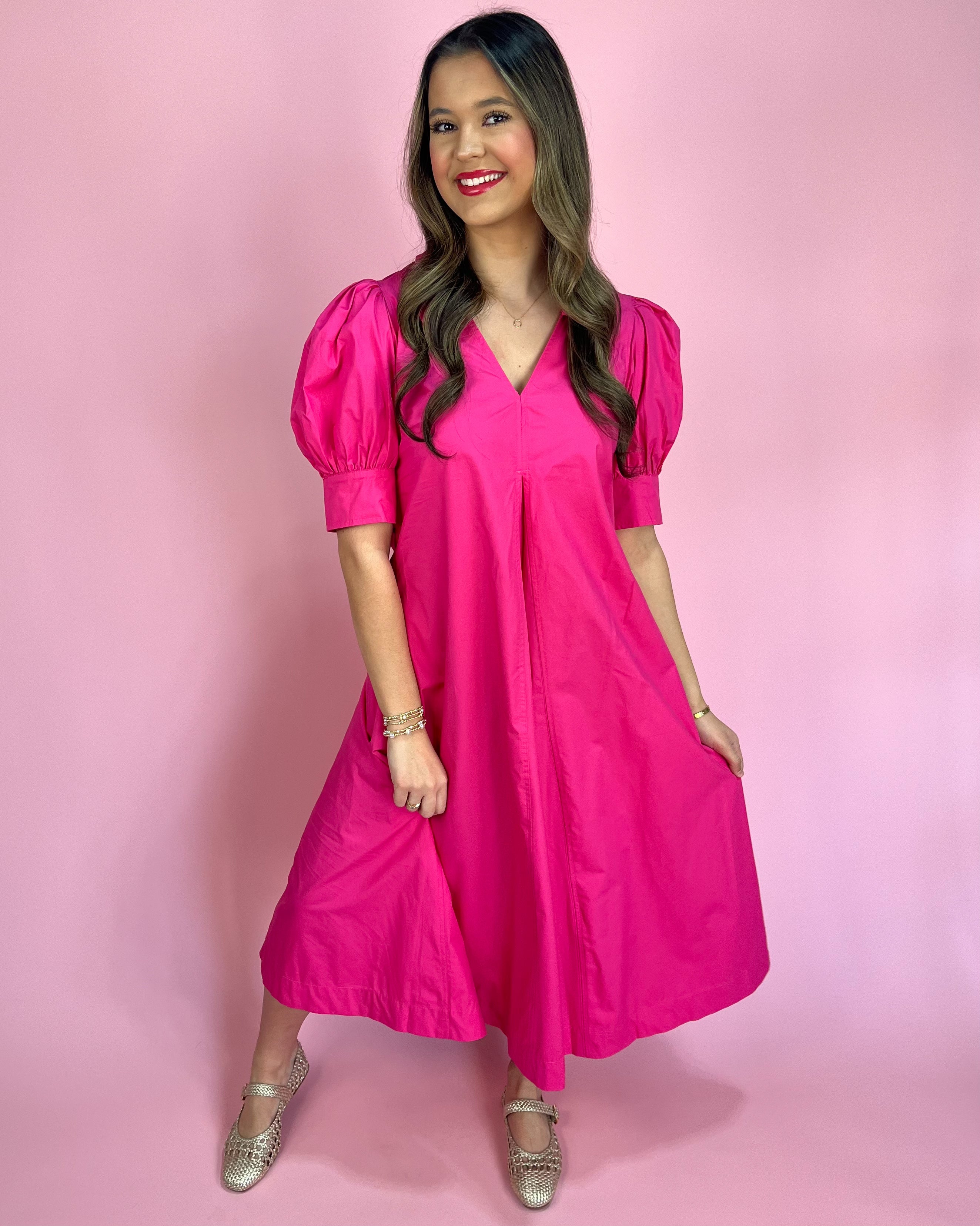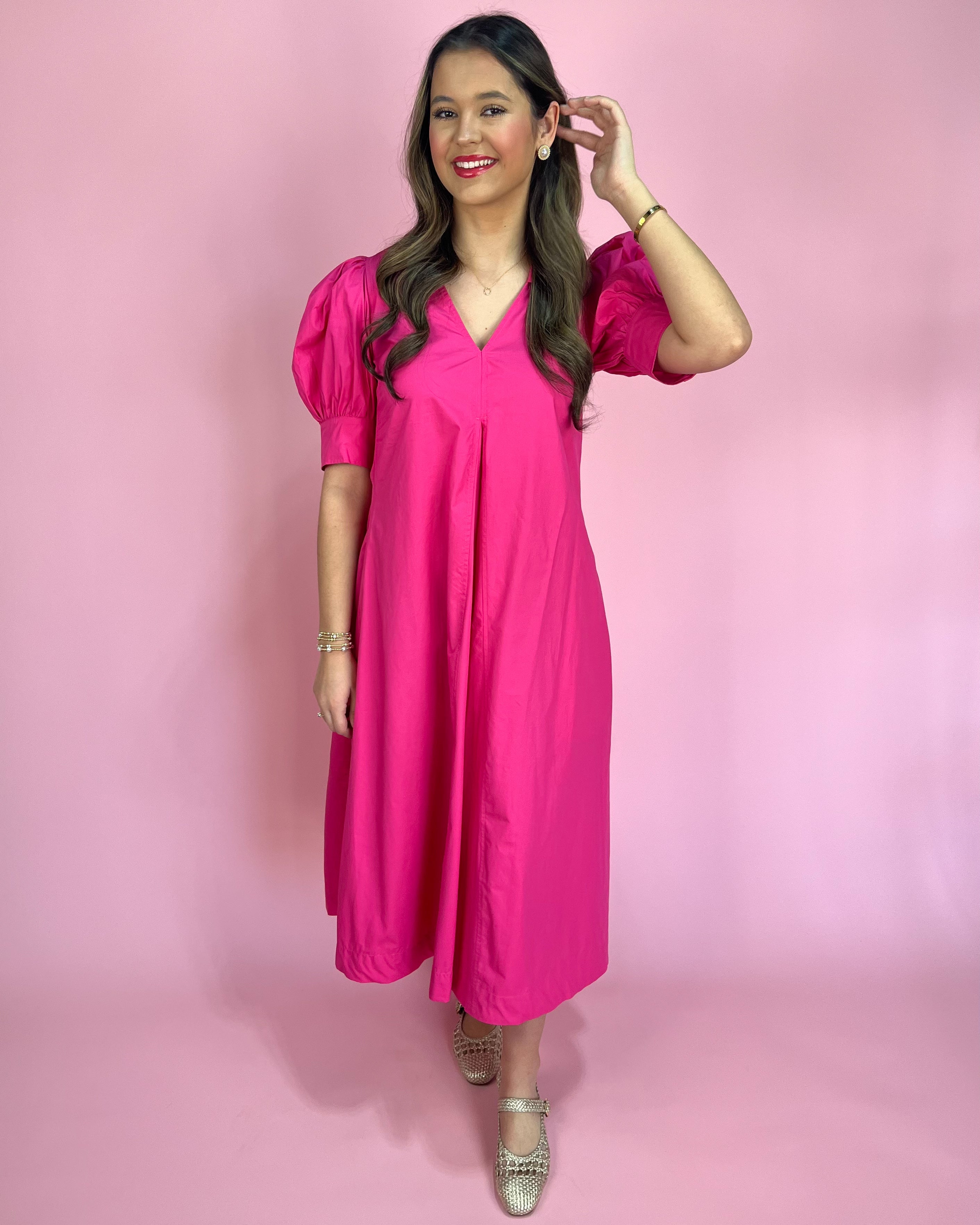 Featuring a chic collared neckline with a flirty v-cut front, plus those statement puff sleeves that give the prettiest silhouette 💕 The flowy midi length keeps it classy, while the bright fuchsia color brings all the fun energy!