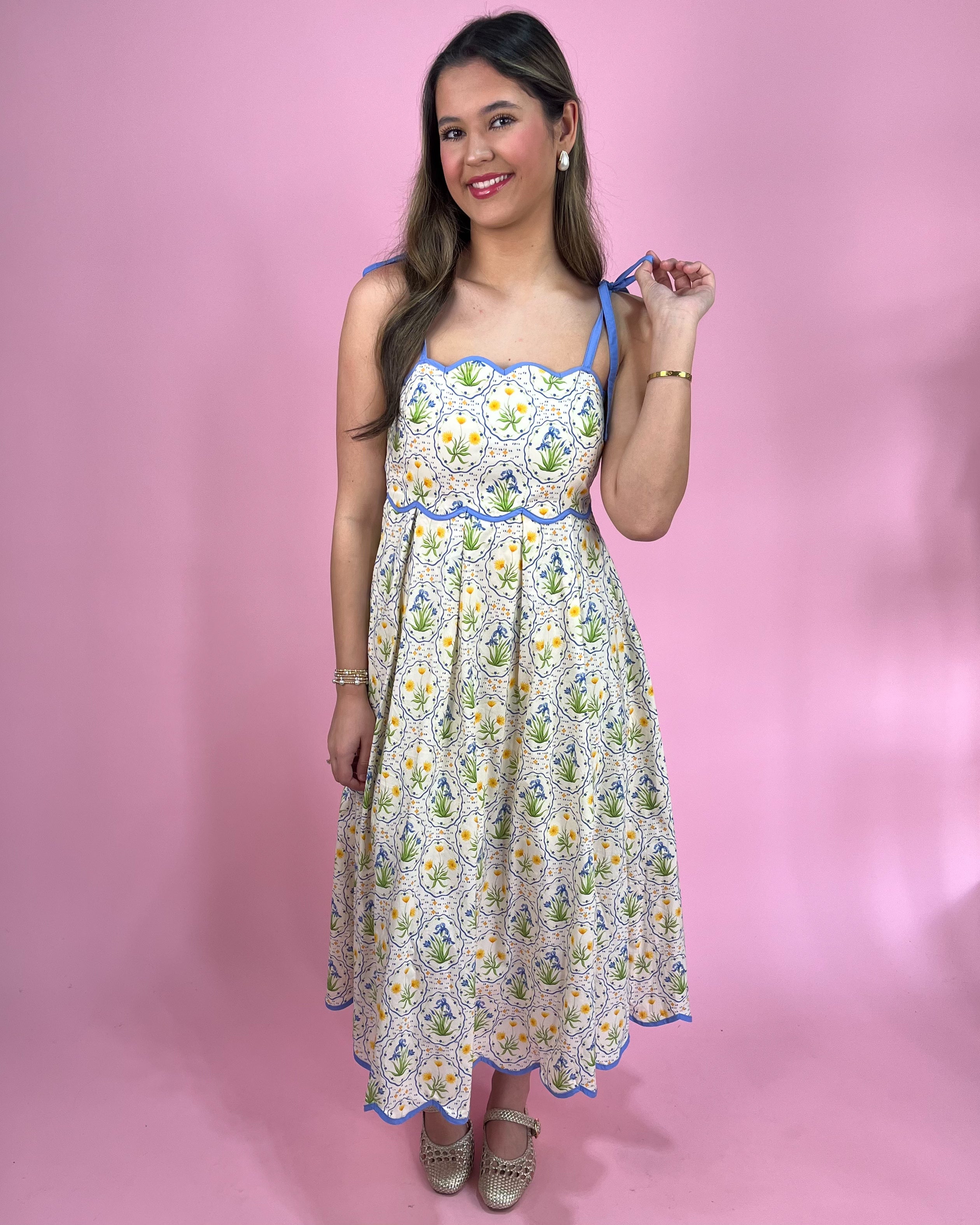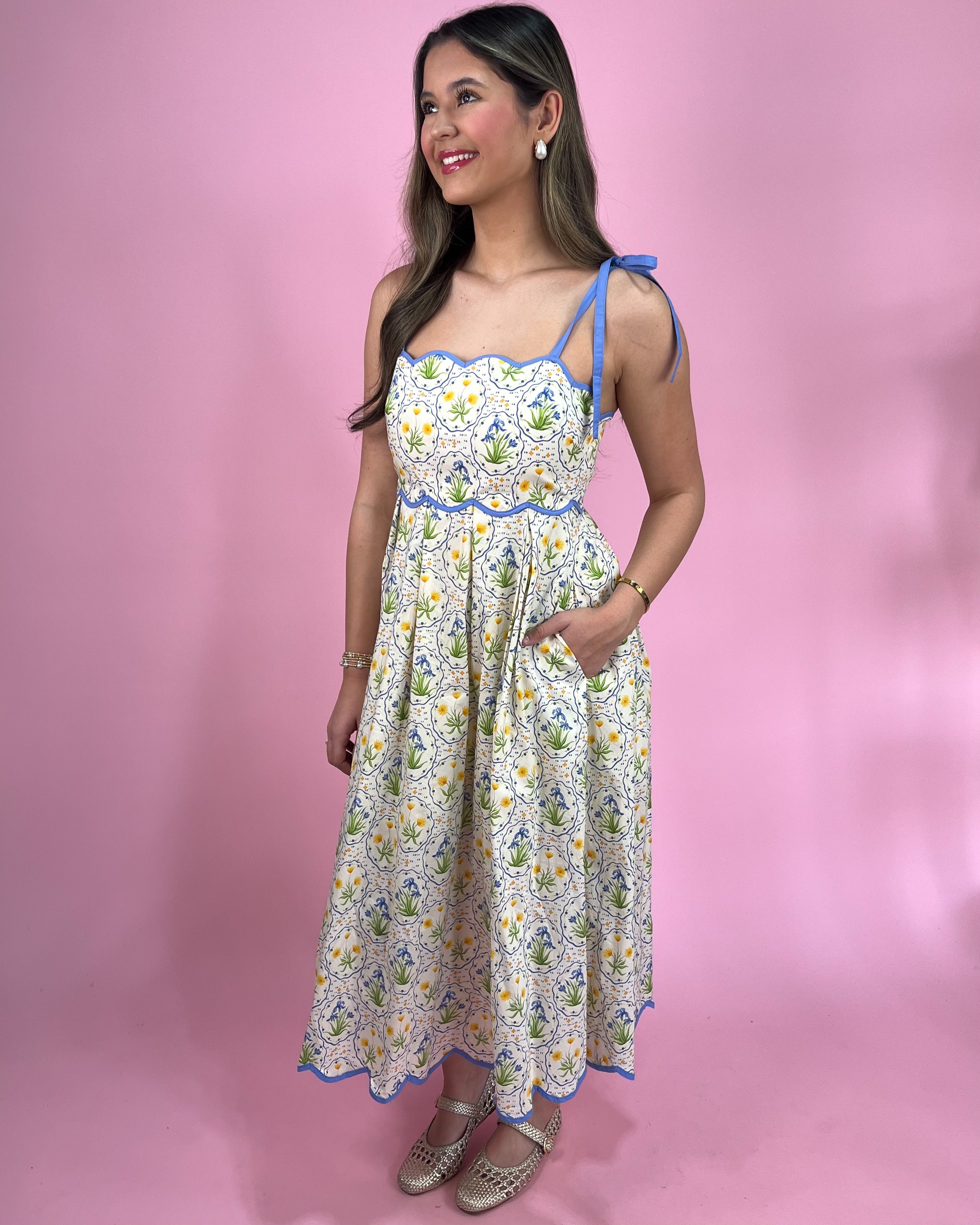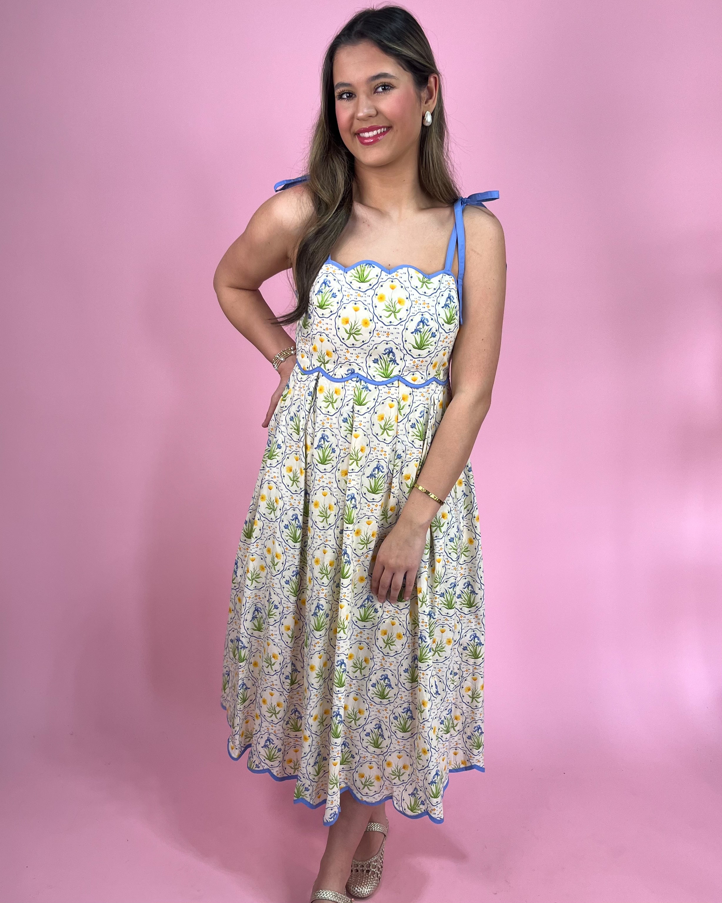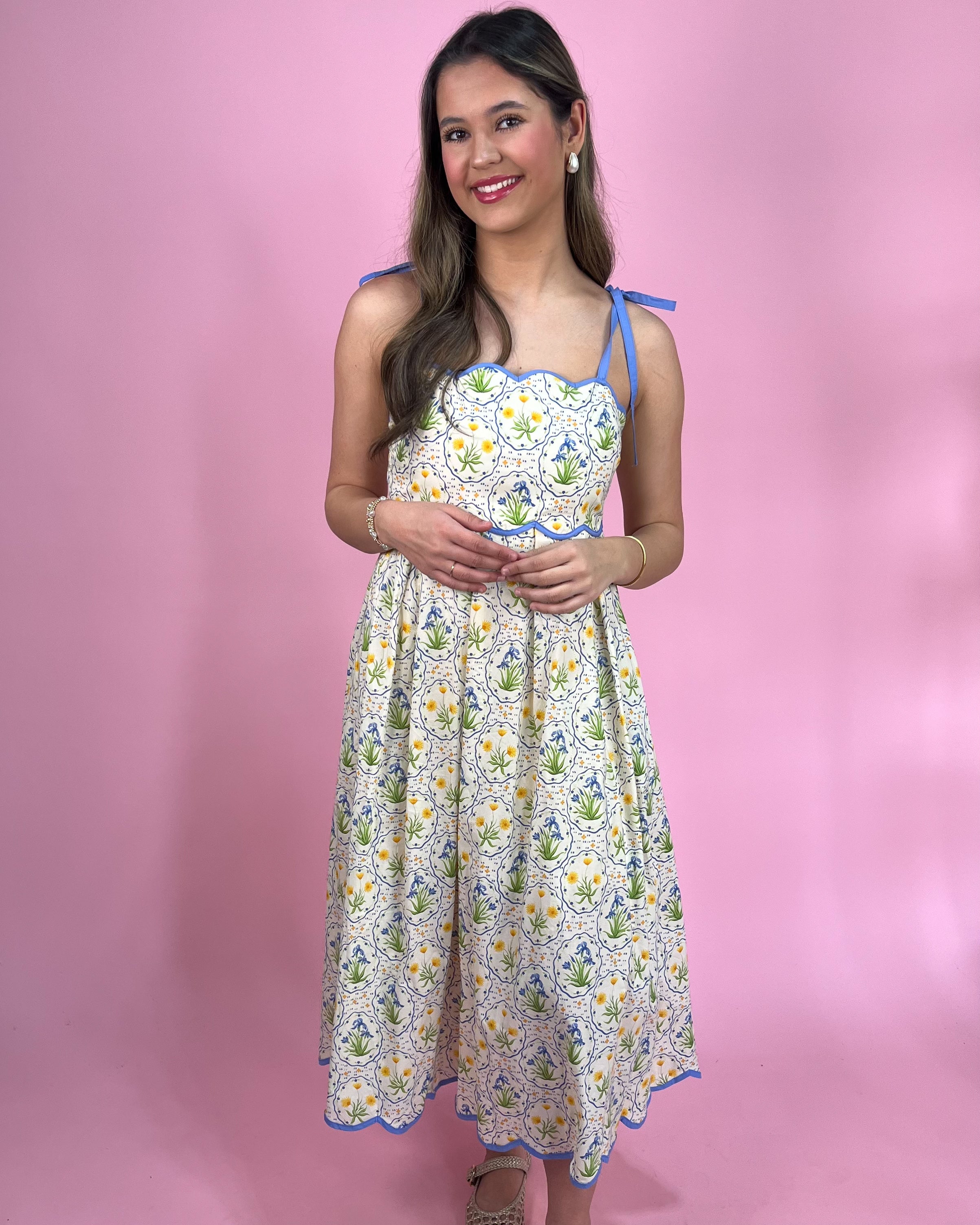 This dress is giving the sweetest springtime elegance with a fresh floral twist 💛🌸. The delicate blue trim and charming scalloped edges make it feel so unique — like something straight out of a European summer picnic 🇫🇷🌿.